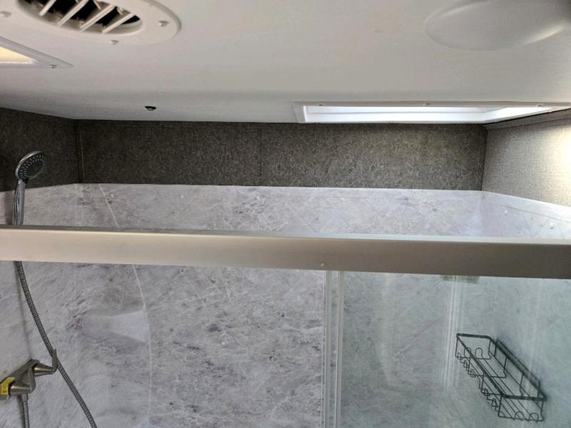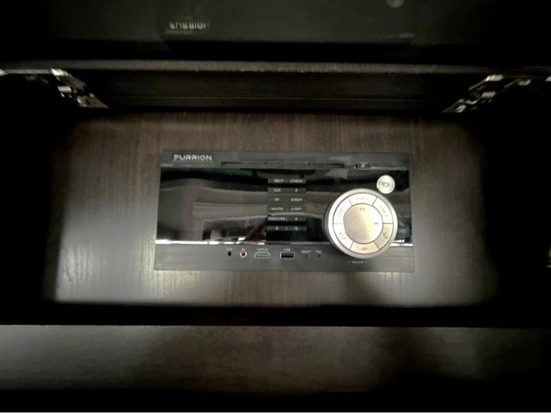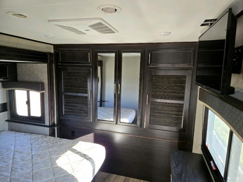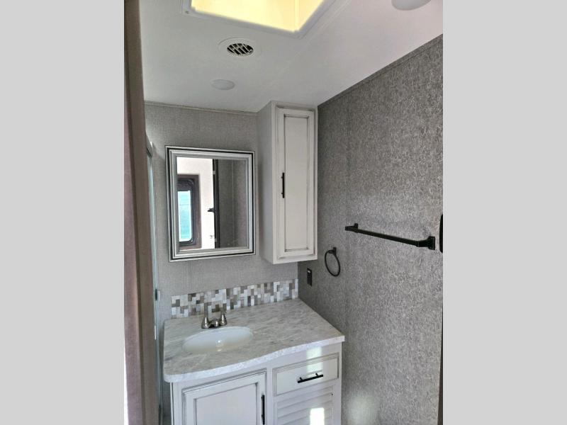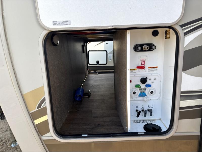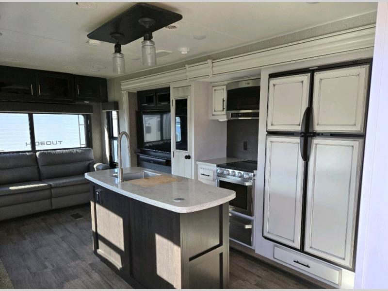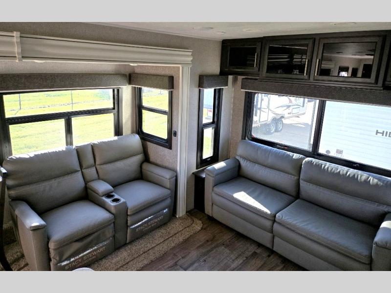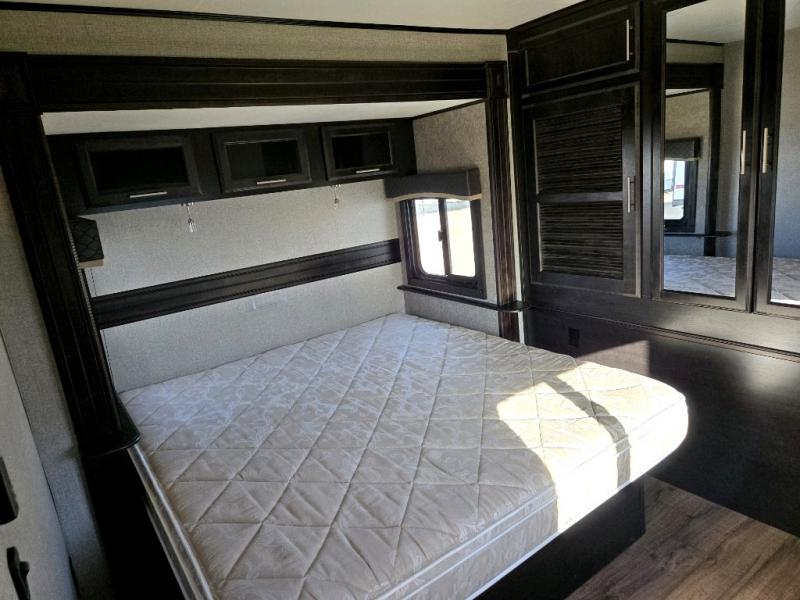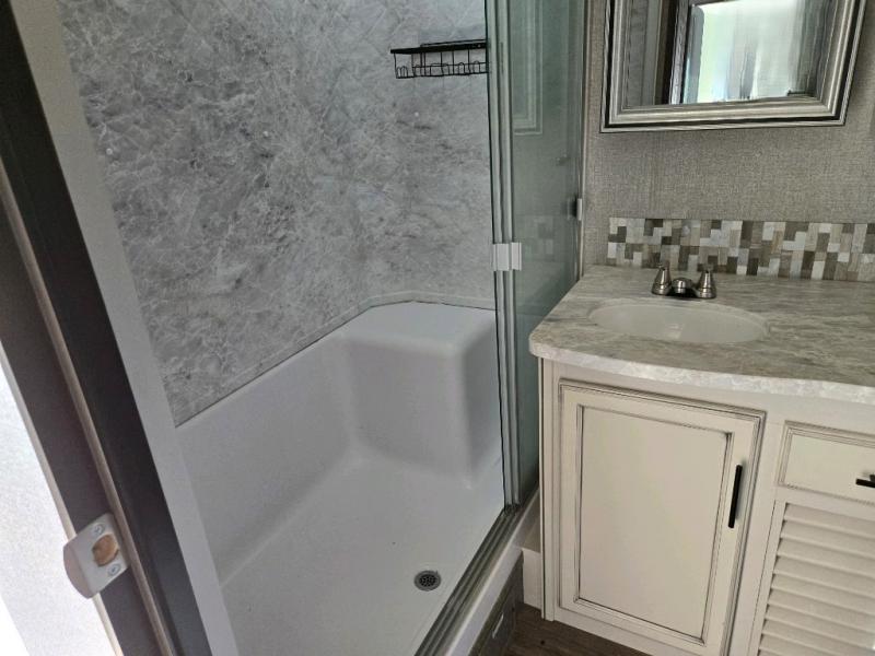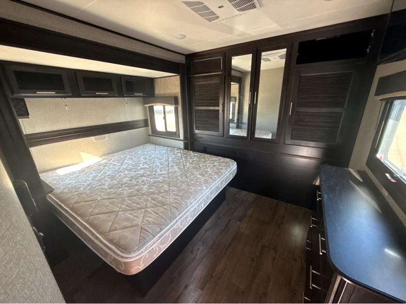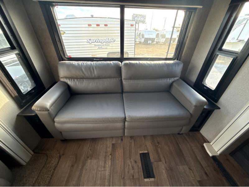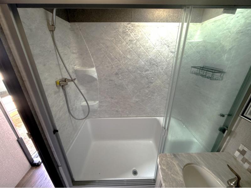 After spending a night of comfort and relaxation on the queen-size bed in the front private bedroom, you will be excited to wake up and see everything else that this Eagle travel trailer has to offer! A hutch, walk-in pantry, 13.5 cubic foot refrigerator, and second pantry provide plenty of storage space for all of your kitchen gadgets and tools, and the soft-close drawers are an added touch of elegance to this great kitchen. You will be able to sit down at the free-standing table with chairs after preparing a hearty breakfast, and if it happens to be a crisp fall morning, you can switch on the LED fireplace with 5,000 BTU electric space heater to warm up.