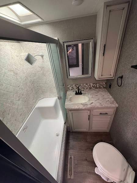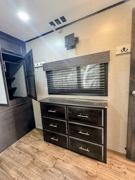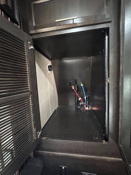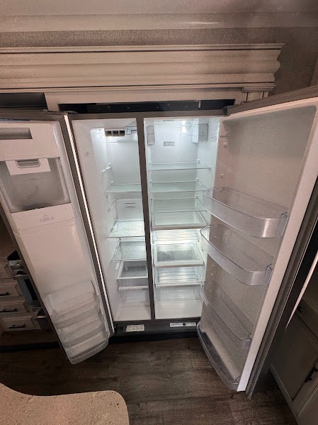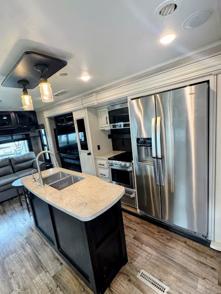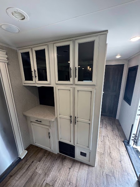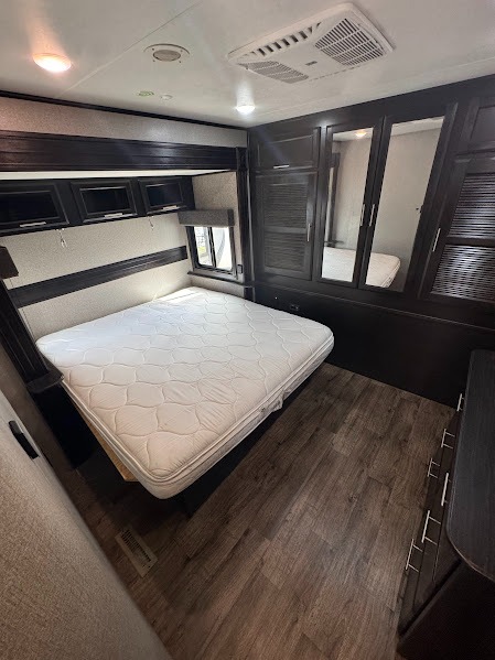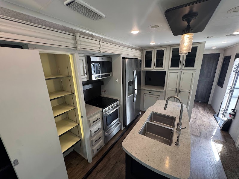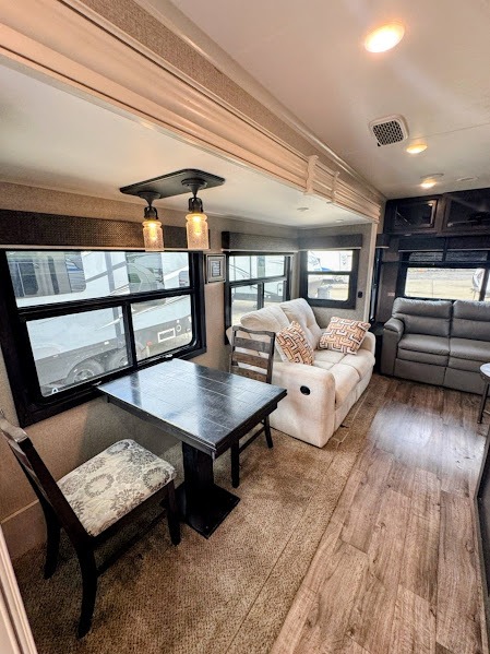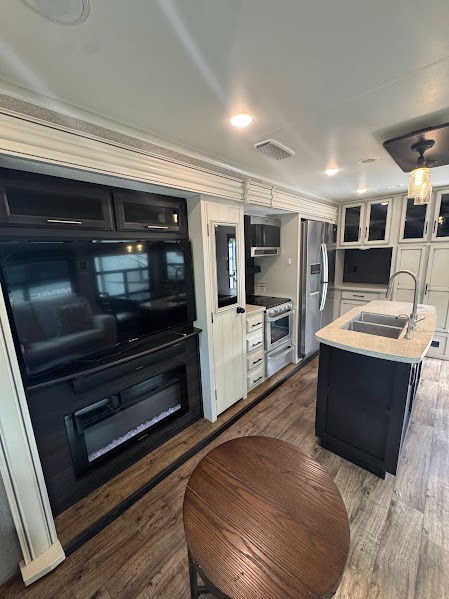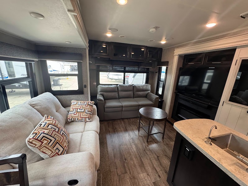 After spending a night of comfort and relaxation on the queen-size bed in the front private bedroom, you will be excited to wake up and see everything else that this Eagle travel trailer has to offer! A hutch, walk-in pantry, 13.5 cubic foot refrigerator, and second pantry provide plenty of storage space for all of your kitchen gadgets and tools, and the soft-close drawers are an added touch of elegance to this great kitchen. You will be able to sit down at the free-standing table with chairs after preparing a hearty breakfast, and if it happens to be a crisp fall morning, you can switch on the LED fireplace with 5,000 BTU electric space heater to warm up.