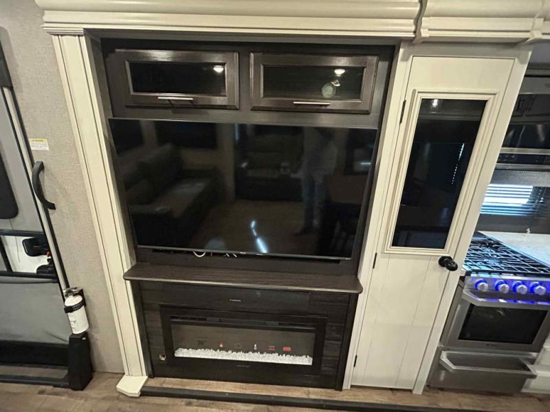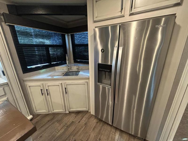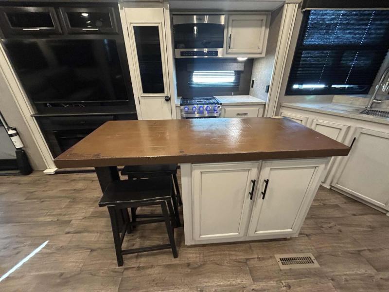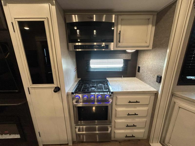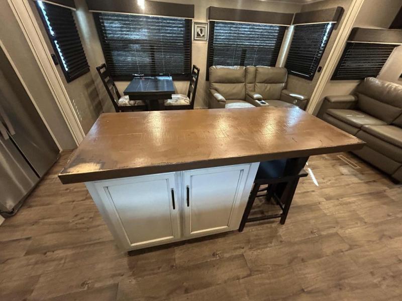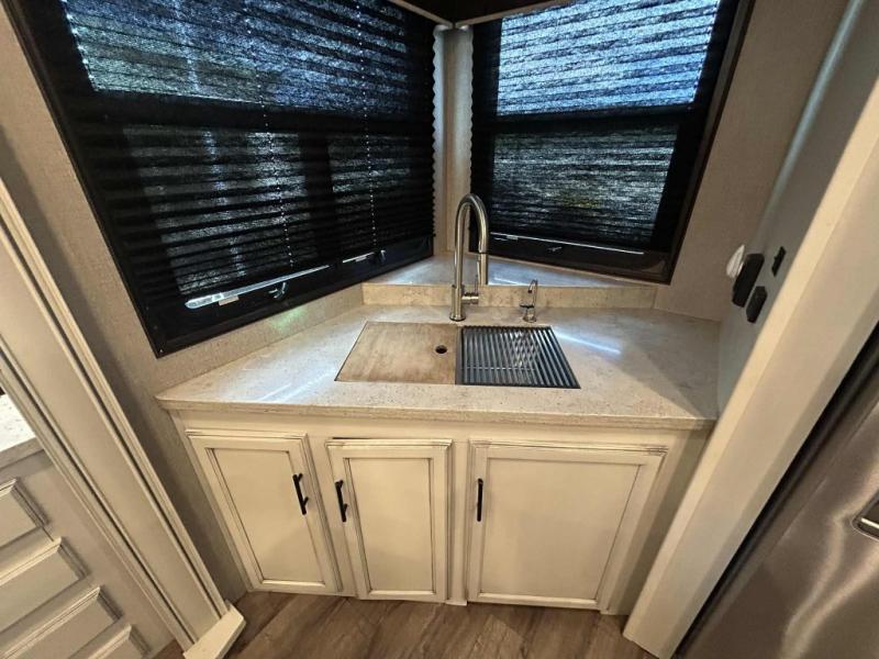 Your family will love spending their time sitting at the huge island with bar stools while they watch you prep dinner on the solid-surface countertops in this Eagle travel trailer! The bamboo sink cover and strainer is a great addition to this already fabulous kitchen, and the opposing slides are also extremely helpful because they allow you to have plenty of space as you move about the kitchen. If you prefer to grill your burgers outside in the fresh air, you are in luck because there has been an outdoor kitchen added to this model!