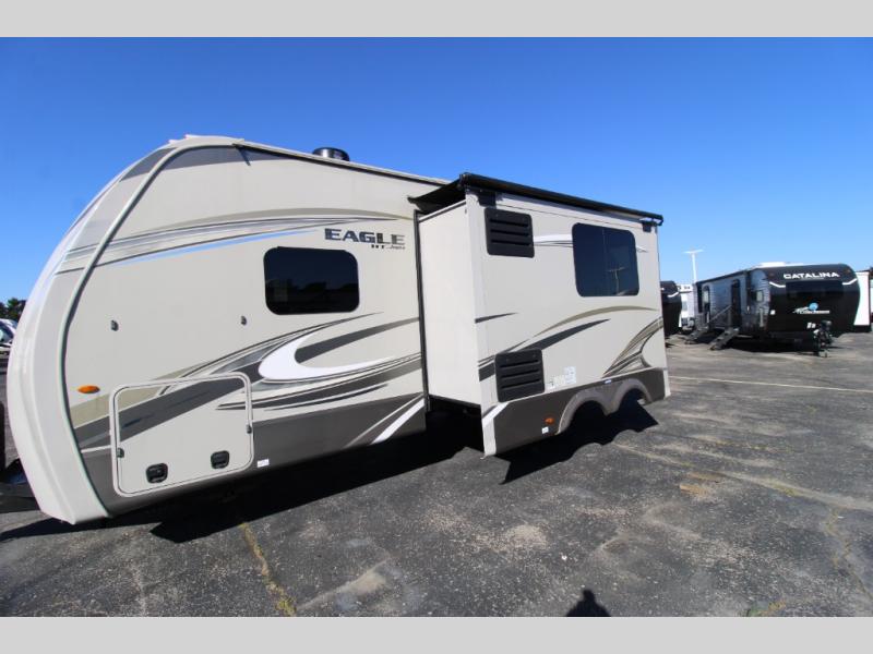 Your search is over! This rear-bathroom Eagle HT travel trailer offers a spacious vanity, 30" x 36" shower, plus linen storage to stay refreshed and ready for shopping in town or hiking the trails. You will have the choice of cooking inside at the L-shaped kitchen with stainless steel appliances, dining at the U-shaped dinette that also offers extra sleeping space, and napping in your own private bedroom with the second entry door for a smooth flow of traffic. The drop-frame chassis includes a huge pass-through storage and universal docking station. The outside kitchen allows you to cook while visiting with your camping friends, and the 17' awning gives you LED lights. You might like to add a few options, such as an exterior TV, a chaise lounge, a king bed, an LED fireplace, and/or 16" Goodyear tires.