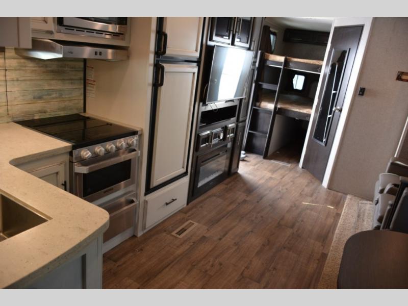 You can easily load all your clothes into the four wardrobes, store some items under the fold-up double-size bunks that support up to 600 pounds, place your dry goods into the pantry and overhead cabinets, and then add your cold items into the refrigerator for a fun camping trip with the whole family in this Eagle HT travel trailer! You get to choose to cook inside with all the stainless steel appliances or outdoors on the "Industry's Best" outside kitchen, and you can dine under the 21' electric awning or inside at the U-shaped dinette. The bathroom is conveniently located next to the bunks and main entry, and the front bedroom has the second entry door and a queen bed which makes this your oasis away from it all.