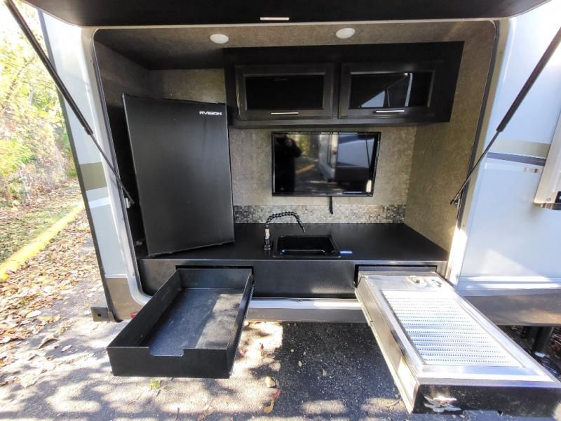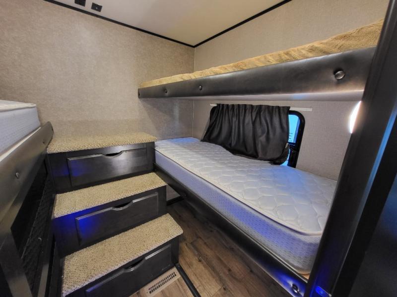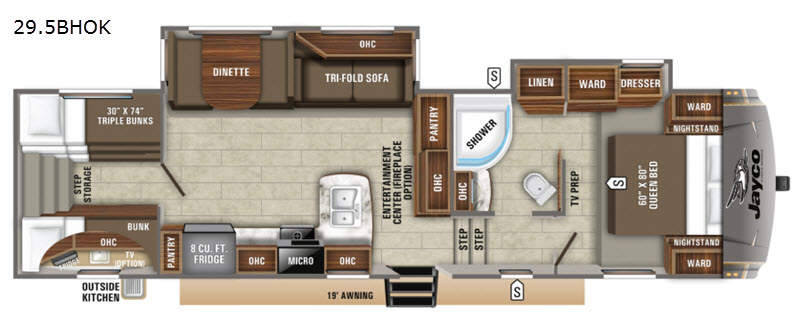 Four bunk beds make a rear bunkhouse with unique stair-step storage drawers loads of fun for the kids and their friends in this Eagle HT fifth wheel. The kids will love having their own privacy, and they can even switch bunks each night if they wish. If more family members joined you, the furniture in the main living area doubles as extra sleeping space. You will appreciate having your own privacy in the front bedroom which is quite spacious with a wardrobe slide that includes a window and linen storage for the double-entry bathroom. The kitchen offers stainless steel appliances to make any meals, plus the "Industry's Best" outside kitchen is a nice feature when you enjoy being outdoors. You also have several options you might like to include such as a 13.5 cu. ft. refrigerator, an LED fireplace below the LED HDTV, theater seating, 16" Goodyear tires, an LED fireplace, a free-standing table, and/or a party sofa.