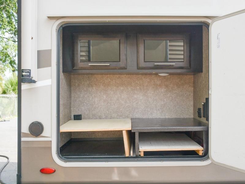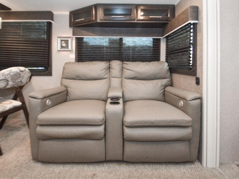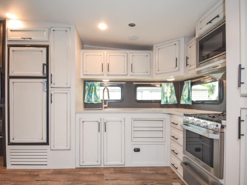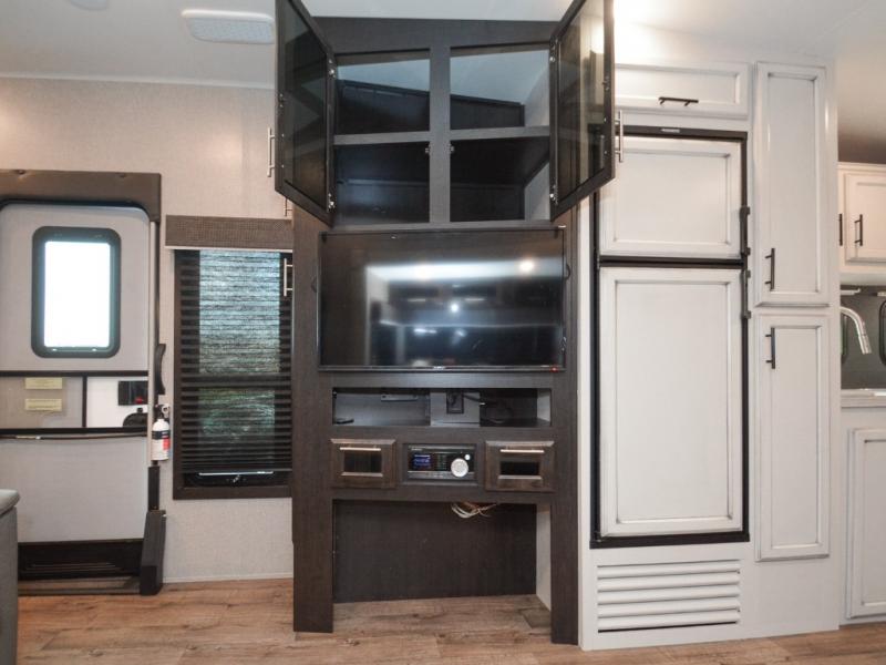 This gently used Jayco Eagle HT fifth wheel offers a tremendous opportunity to enjoy the great outdoors in style and comfort without breaking the bank. The rear kitchen is surrounded by natural lighting and attractive off-white cabinetry plus a generous pantry with pull-out shelving. A panel door refrigerator, three-burner range, and microwave oven round out the appliance suite while deep stainless steel sinks assist with clean-up. Theater seating and a hide-a-bed sofa coax you to relax and enjoy the LED HDTV. Or enjoy cool evenings under the 20' awning with an optional TV and kitchen in an exterior compartments.