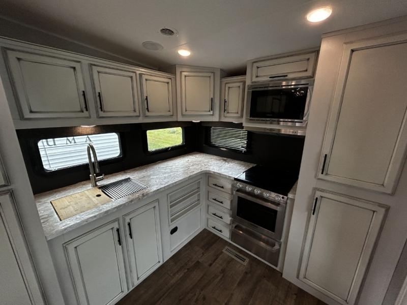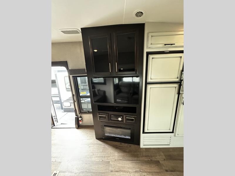 You will love this Eagle HT fifth wheel for its mid living area and rear kitchen that has a large slide so that you can enjoy visiting while relaxing on the furniture, dining, and making meals when you aren't outdoors at the outside kitchen. The 20' awning gives you an outdoor living area with optional TV location. Back inside, the bedroom wardrobe offers a window for natural light and cross-ventilation, plus linen storage in the double-entry bathroom. You might like to add a few options such as an LED fireplace, a 13.5 cu. ft. refrigerator, and/or 16" Goodyear tires. This unit even received the RV Pro magazine "Best of Show" floorplan making it a popular unit for many reasons.