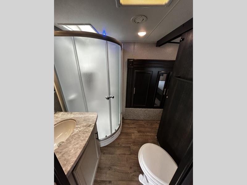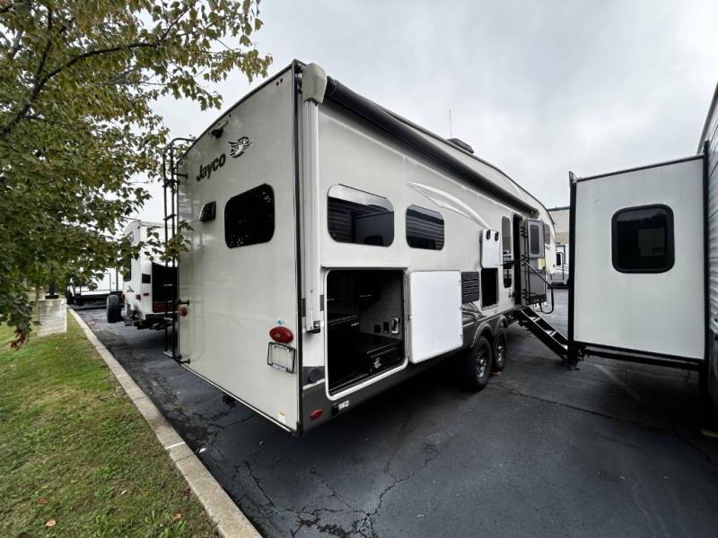 With each Jayco Eagle HT fifth wheel, you can travel with your half-ton truck! The interior offers features such as a residential Serta mattress with under-bed storage, a CPAP-prepped bedroom, large windows, solid hardwood slide fascia, residential flooring made in the U.S.A., and dual USB charging ports in the kitchen and bedroom. The StrongholdVBL aluminum-framed and vacuum-bond laminated gel-coated fiberglass exterior walls including the rear wall and slide room end walls, the fully enclosed and heated underbelly, the industry-exclusive HELIX cooling system, the JaySMART safety markers and reverse travel, and the 4-Star Handling package just makes traveling safer and easier! Choose the model that suits your family's needs and wants, and start camping the right way today!