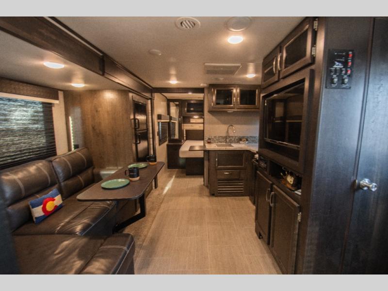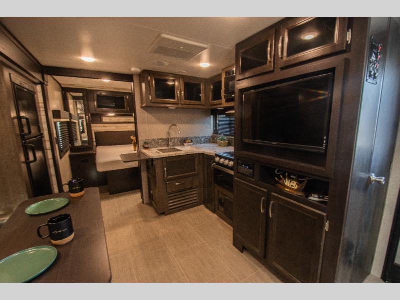 Whether you spend you day outdoors around the outside kitchen or inside around the U-shaped dinette, you'll see this travel trailer has a little something for everyone. This unit features a spacious full rear bath so you can get ready for your day just like you do at home. Fill your day with hiking, biking, or swimming, and when it's time to call it a night, the front private bedroom with a queen bed will be waiting for you. You'll find plenty of storage space, including a walk-in pantry, overhead compartments, and outside storage for all your gear both small and large!