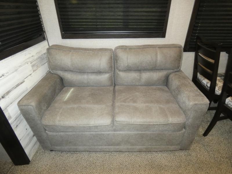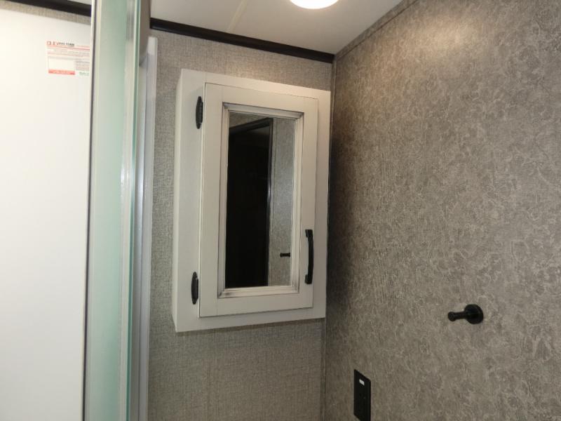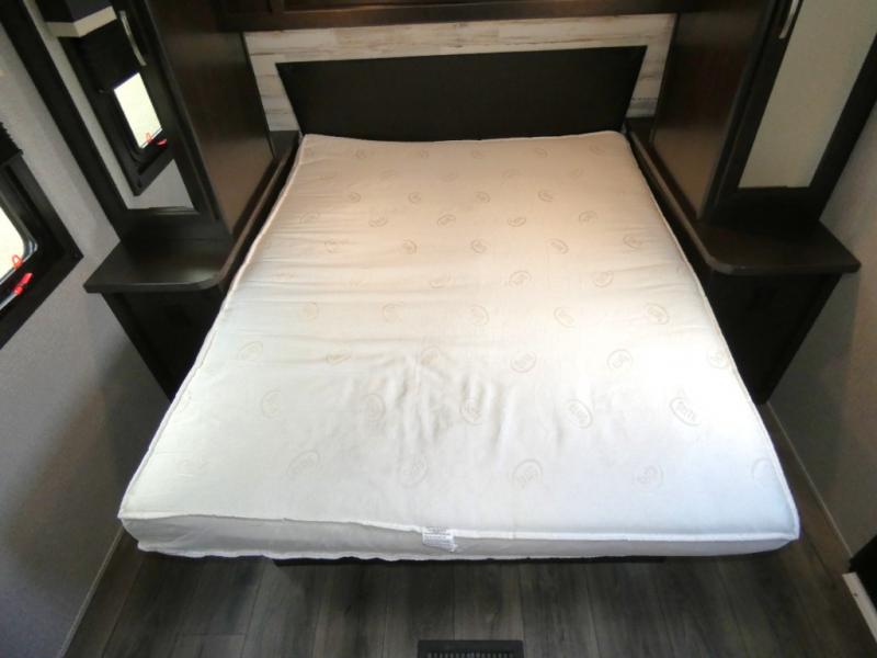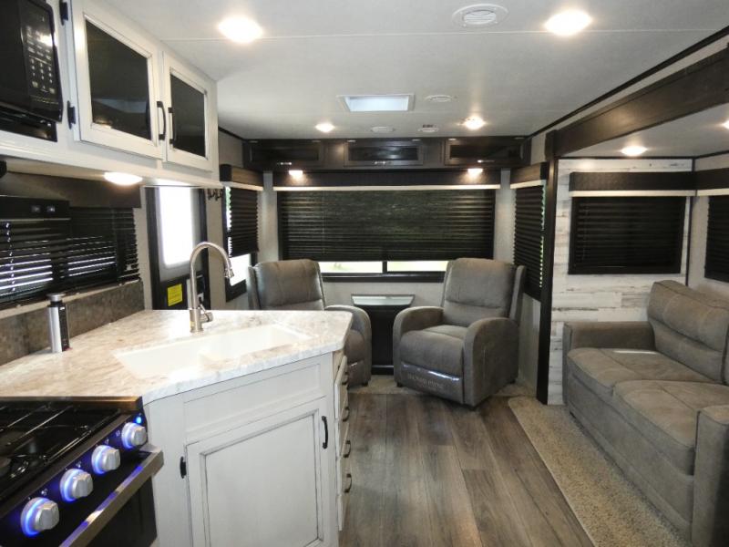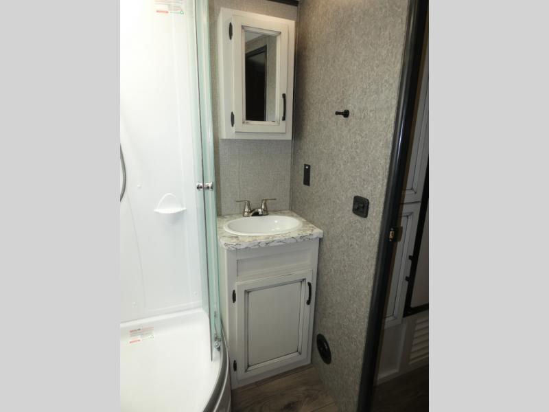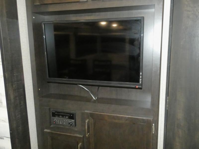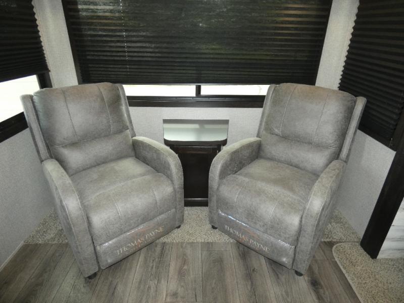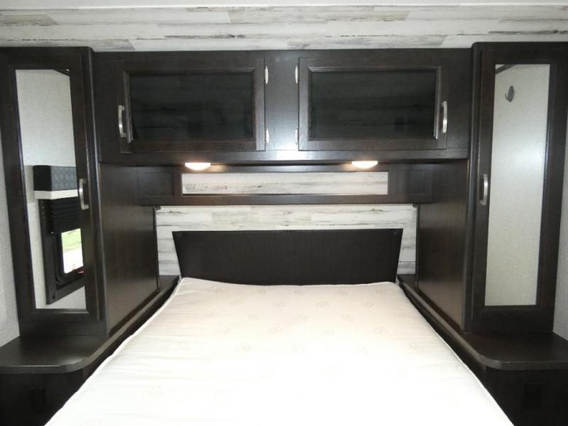 Whether you are an inside person that will enjoy watching the LED TV while in a comfortable recliner in the rear living area, or an outside person that enjoys relaxing under the 20' power awning with LED lights, you will love having this trailer! The cook can make meals using the Furrion range which includes an oven and three burner recessed glass cooktop, the 6 cu. ft. refrigerator, and the pantry. When you need to get cleaned up, the walk-through bathroom offers everything you will need plus plenty of storage for your linens and toiletries, and the front bedroom offers a walk-around queen bed, wardrobes and nightstands.