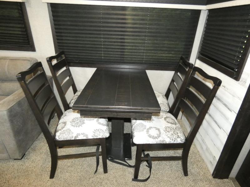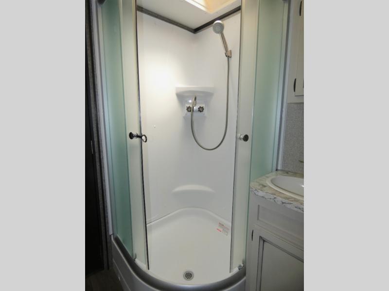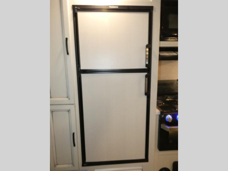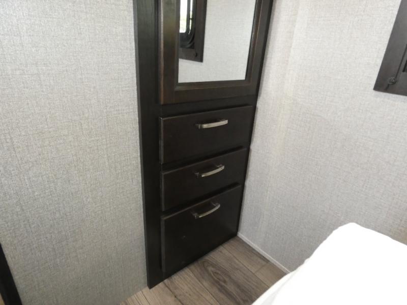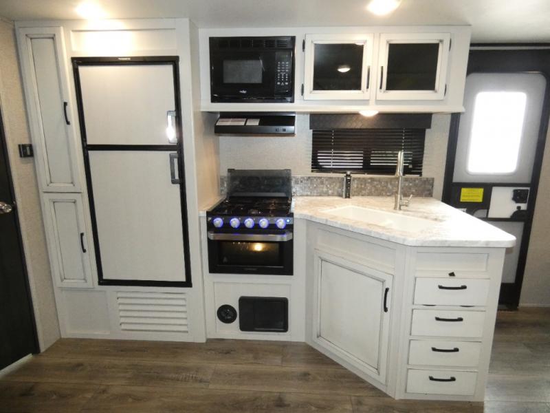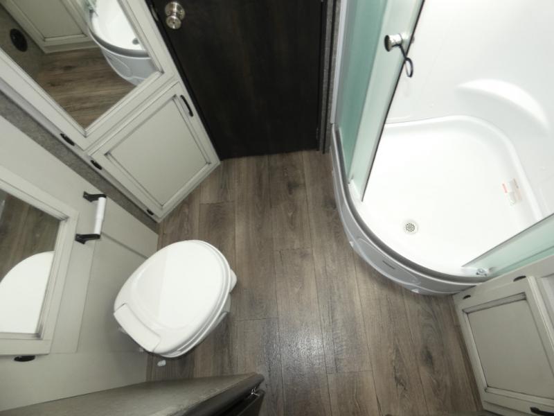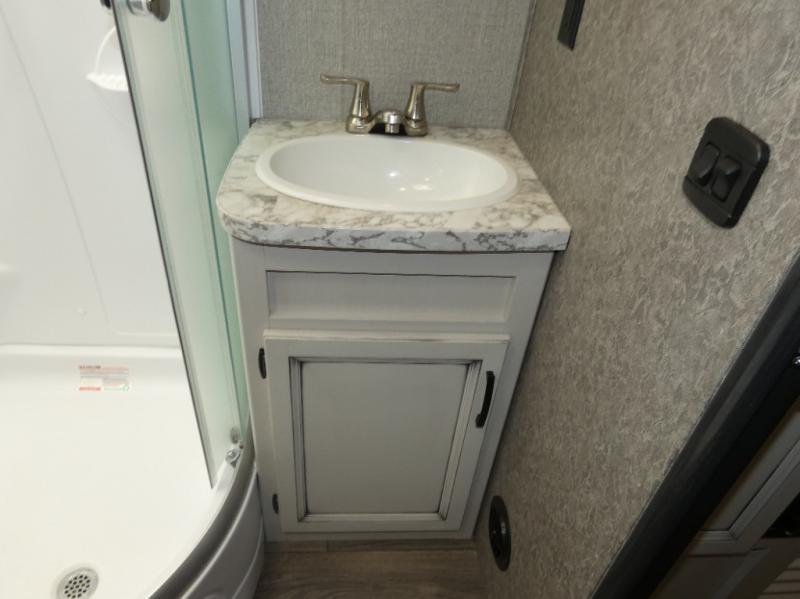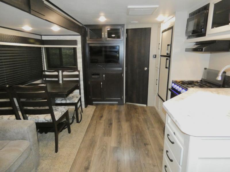 Whether you are an inside person that will enjoy watching the LED TV while in a comfortable recliner in the rear living area, or an outside person that enjoys relaxing under the 20' power awning with LED lights, you will love having this trailer! The cook can make meals using the Furrion range which includes an oven and three burner recessed glass cooktop, the 6 cu. ft. refrigerator, and the pantry. When you need to get cleaned up, the walk-through bathroom offers everything you will need plus plenty of storage for your linens and toiletries, and the front bedroom offers a walk-around queen bed, wardrobes and nightstands.