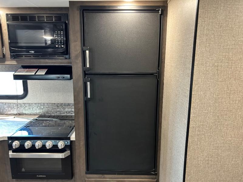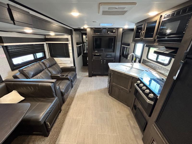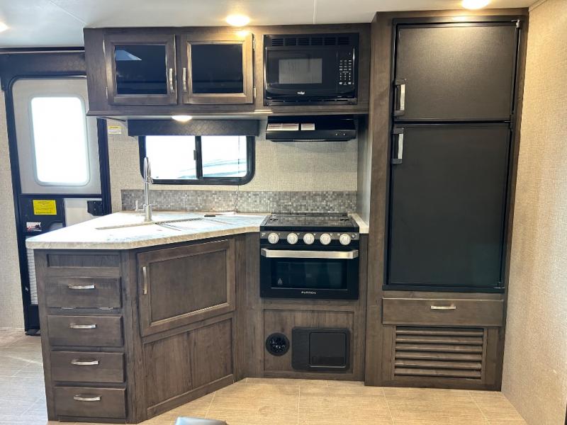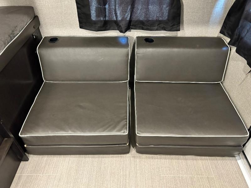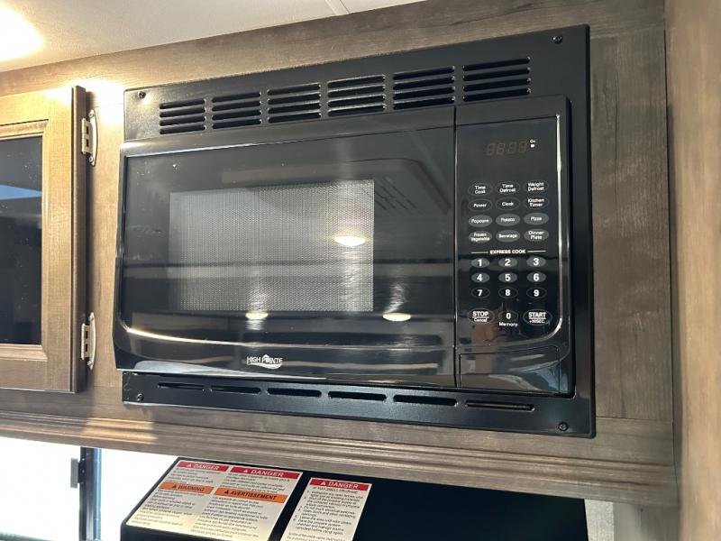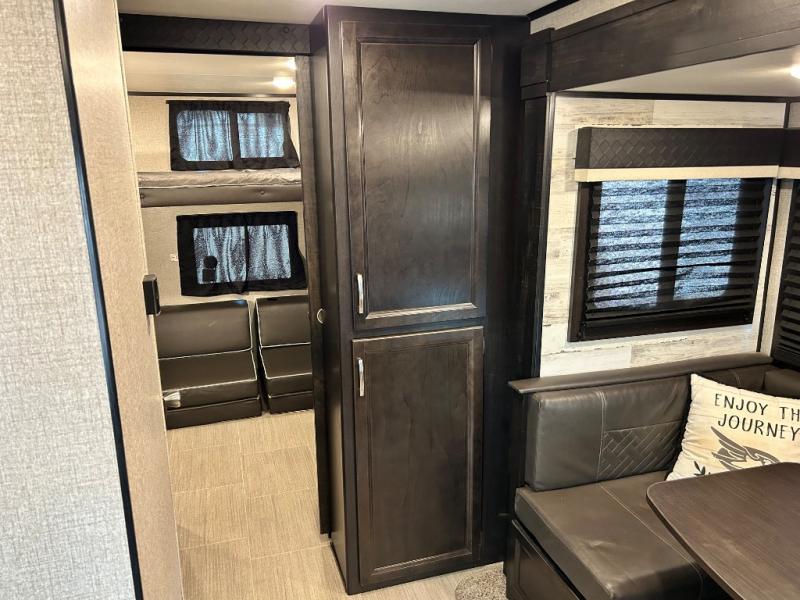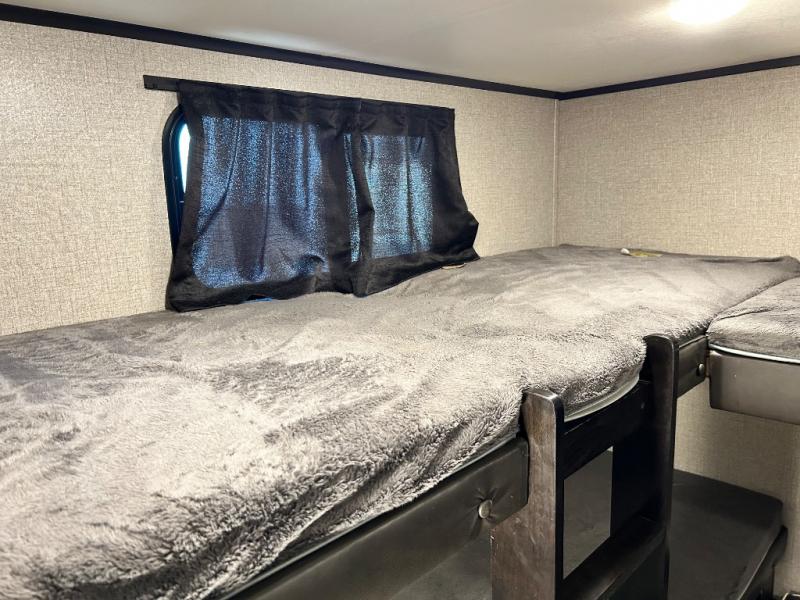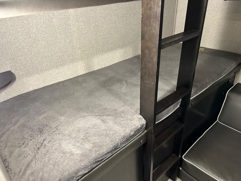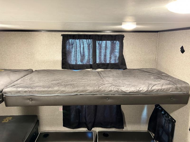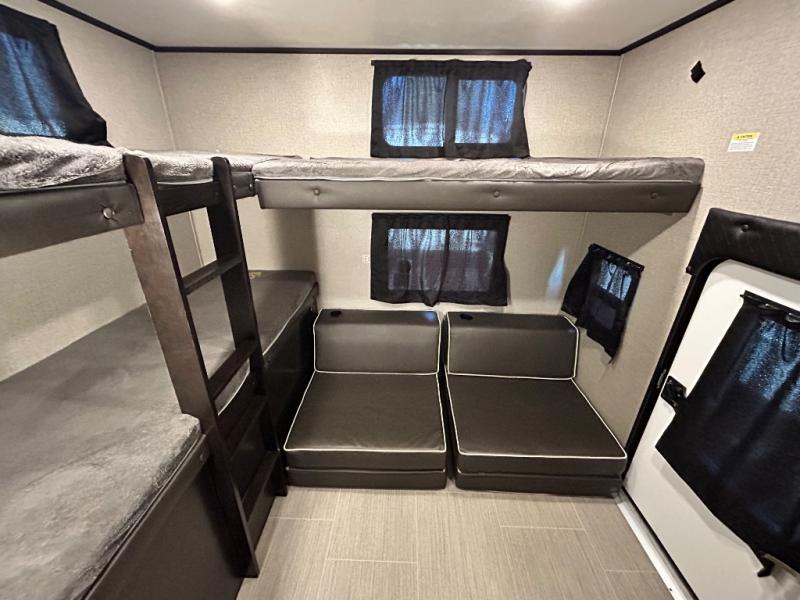 Load up the whole family for a weekend of campfires, bike riding, horseshoes and more! Imagine the kids falling right to sleep in the private bunkhouse after removing the extra camp gear through the handy Pack-n-Play door. The J-cube sofa and triple bunks will surely be a fun place to sleep. You will have your own walk-around queen bed and privacy on the opposite side of the trailer, and everyone can share the main living area when watching the LED TV. The U-shaped dinette and sofa offer a great place to eat, visit and sleep if needed. And the 10' and 16' power awnings provide protection from the elements, and the outside kitchen gives you another space to make meals when you aren't using the full kitchen inside.