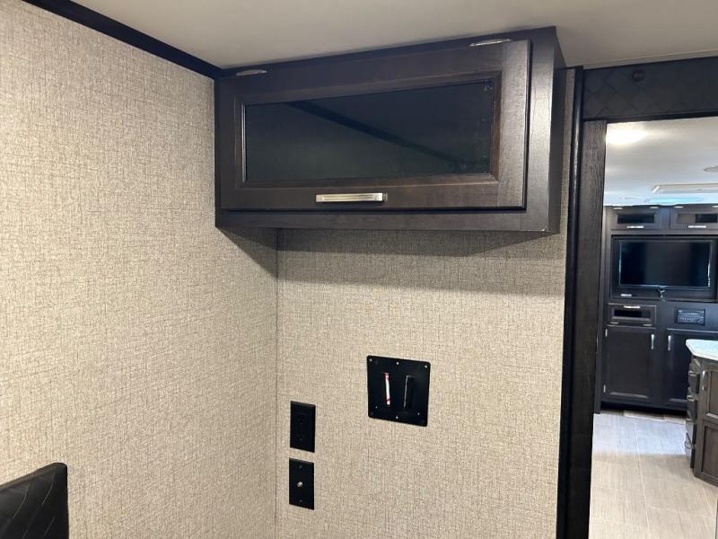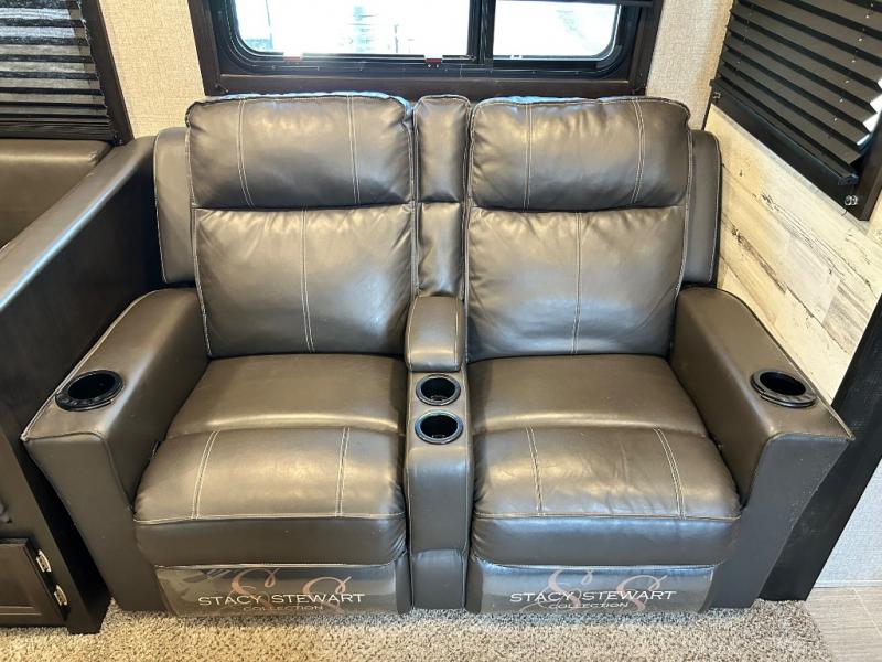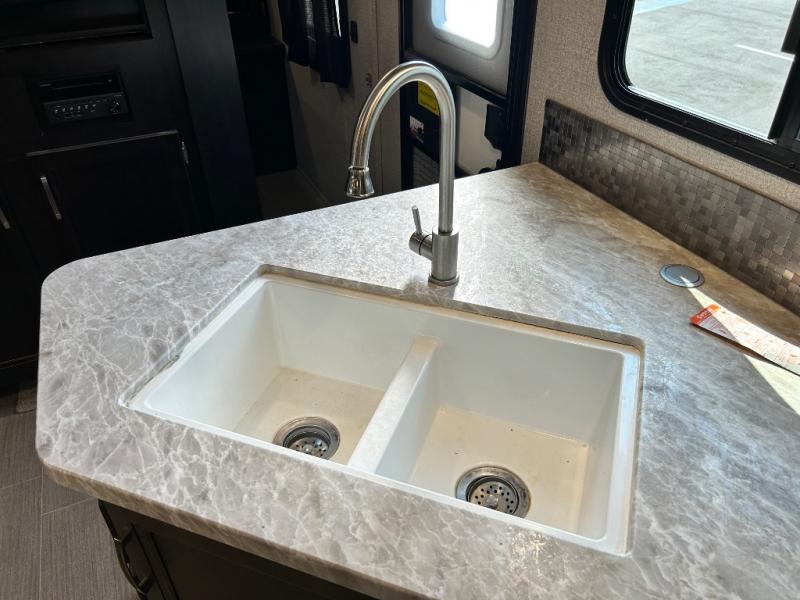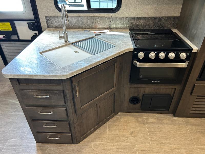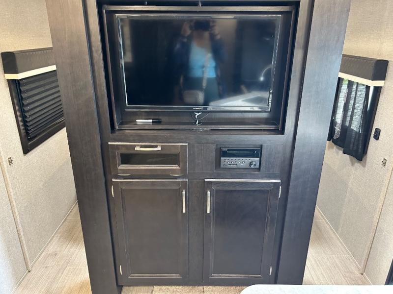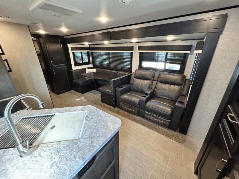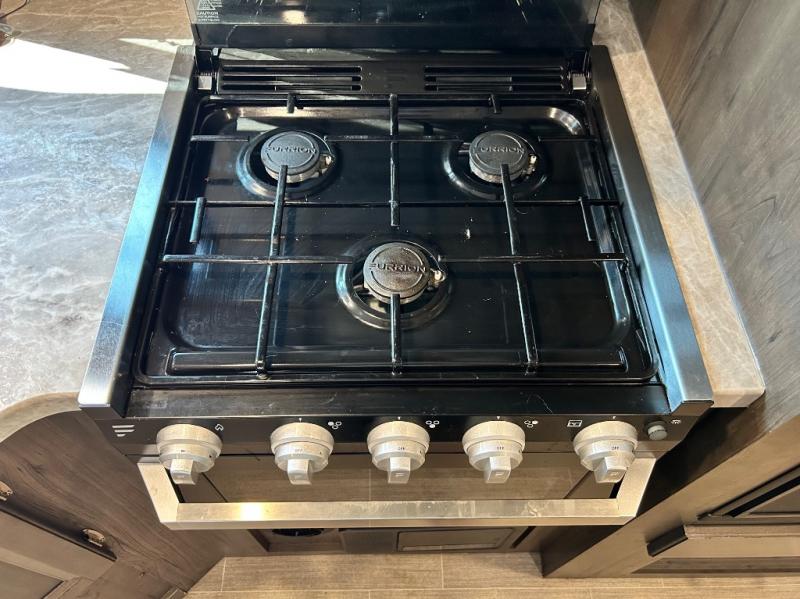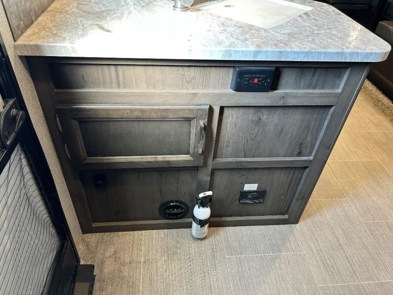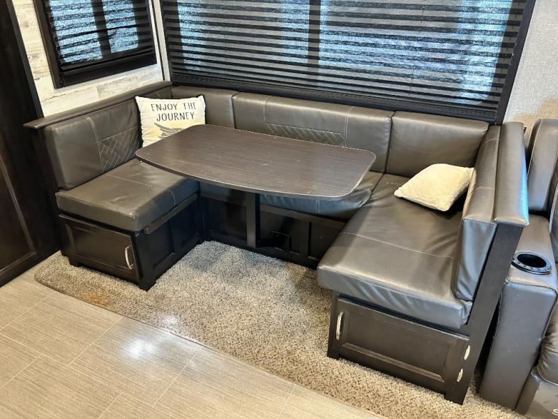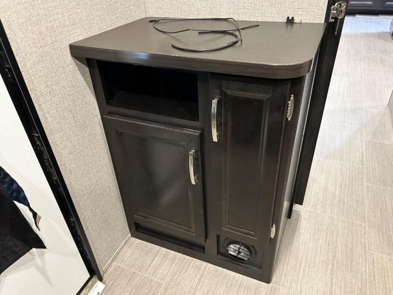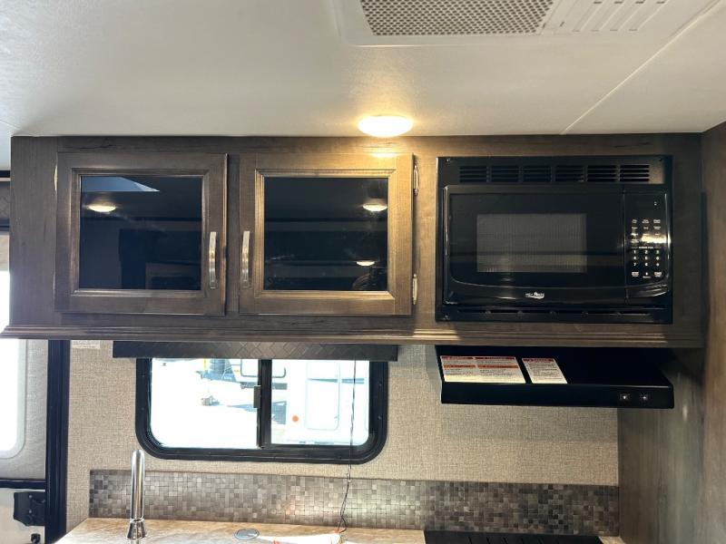 Load up the whole family for a weekend of campfires, bike riding, horseshoes and more! Imagine the kids falling right to sleep in the private bunkhouse after removing the extra camp gear through the handy Pack-n-Play door. The J-cube sofa and triple bunks will surely be a fun place to sleep. You will have your own walk-around queen bed and privacy on the opposite side of the trailer, and everyone can share the main living area when watching the LED TV. The U-shaped dinette and sofa offer a great place to eat, visit and sleep if needed. And the 10' and 16' power awnings provide protection from the elements, and the outside kitchen gives you another space to make meals when you aren't using the full kitchen inside.