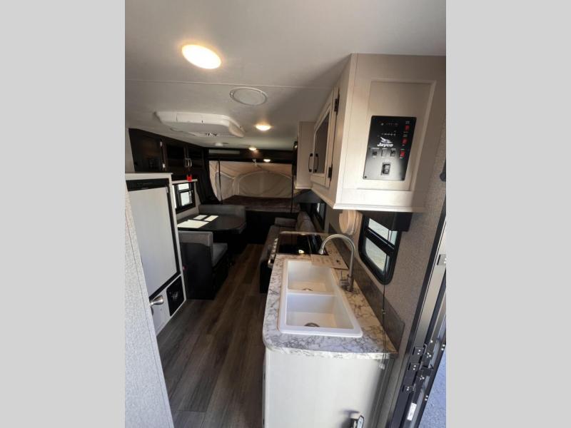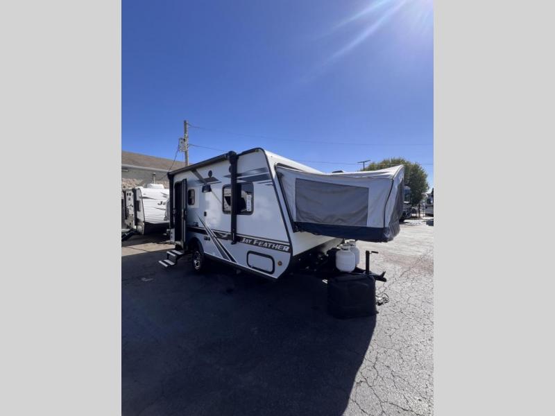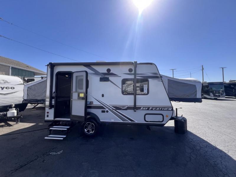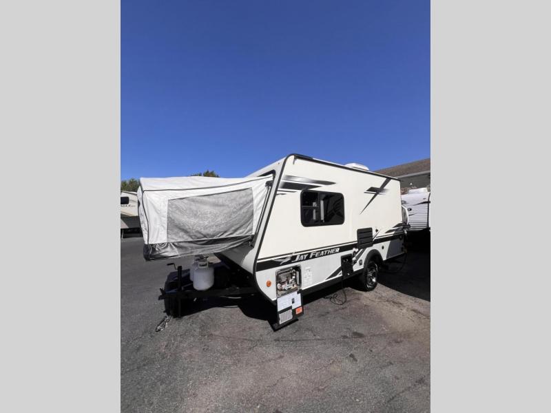 The Jayco Jay Feather hybrid expandable offers an aerodynamic, rounded front profile with a diamond plate, a modern retro graphics package with a two-colored sidewall, Stronghold VBL vacuum-boned, laminated floor, side, rear and front walls on an American-made Norco frame with integrated A-frame. You will appreciate the water-repellent, scratch resistant Jayco DuraTek vinyl tent material with zipper windows and permanently attached tent-to-bed base design. Inside you will find smoked glass decorative inserts in select overhead cabinets, ball-bearing drawer glides, Jayco exclusive teddy bear "soft-touch" residential-style bed mats, and more! Choose your favorite floorplan, and start a new adventure!