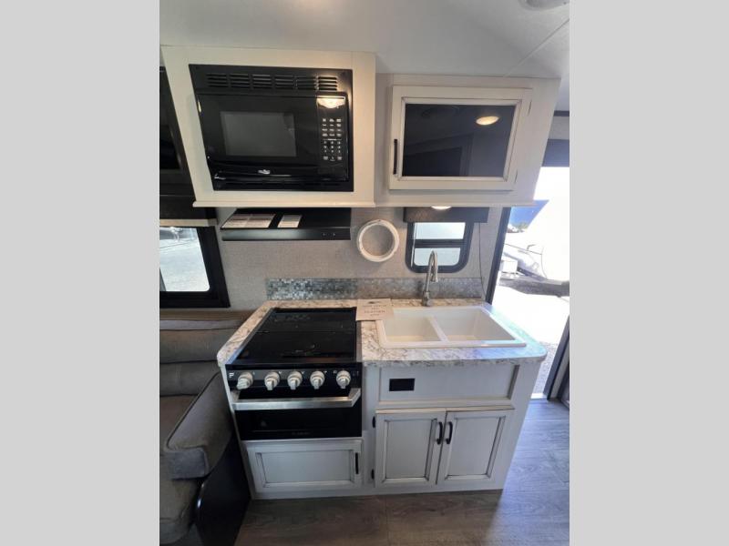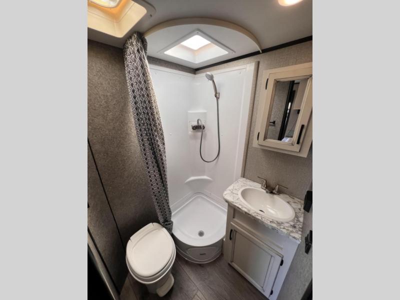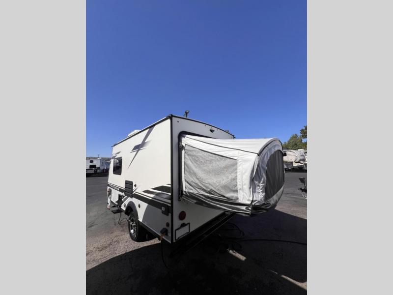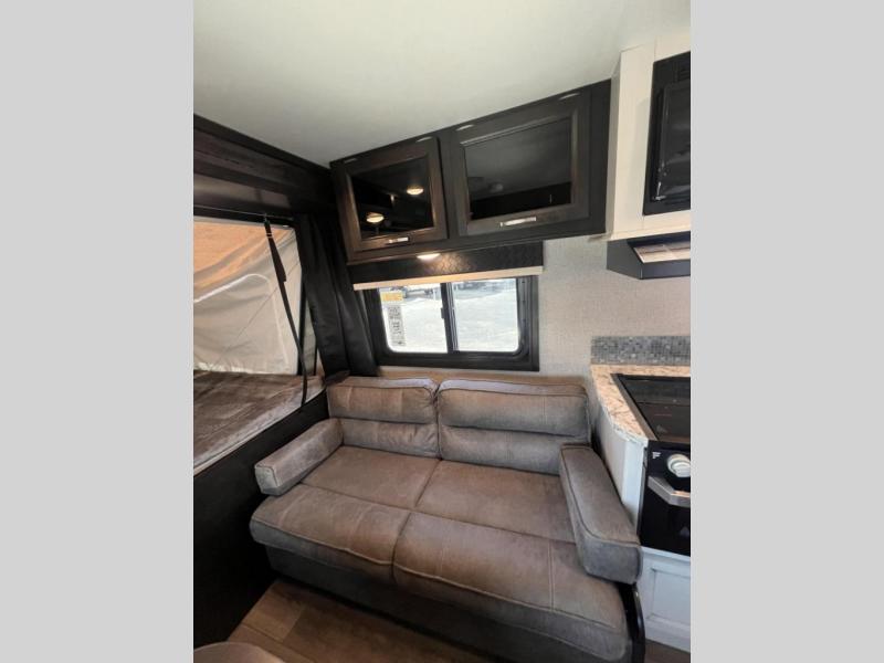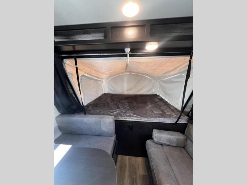 This single axle hybrid expandable offers front and rear tent end beds by Stronghold providing vacuum-bonded bed platforms with 1,050 lb. weight rating. You can easily load up using the aluminum-tread entry steps to place your cold food in the fridge and your clothing and such in the overhead cabinets and shelves. The sofa and dinette both double as extra sleeping space when needed, and the rear bathroom will keep you refreshed for whatever is next. You will soon find out that the 10' power awning with LED lights provides an outdoor living area protected from the elements, and there is storage along the exterior.
