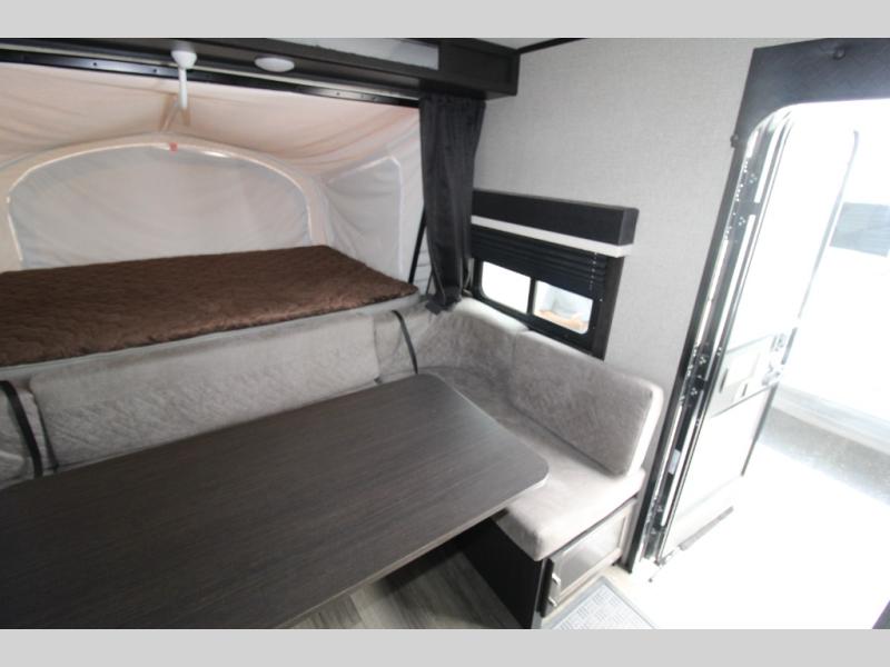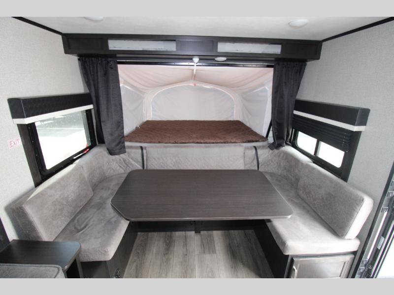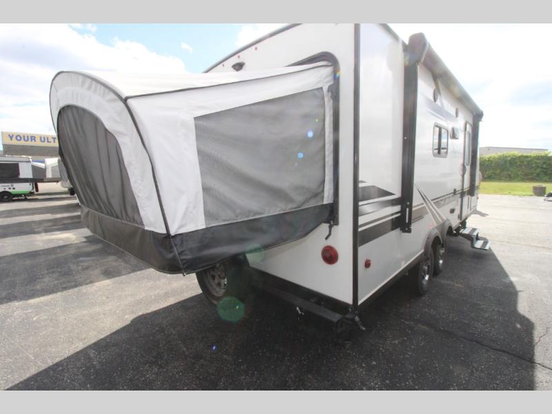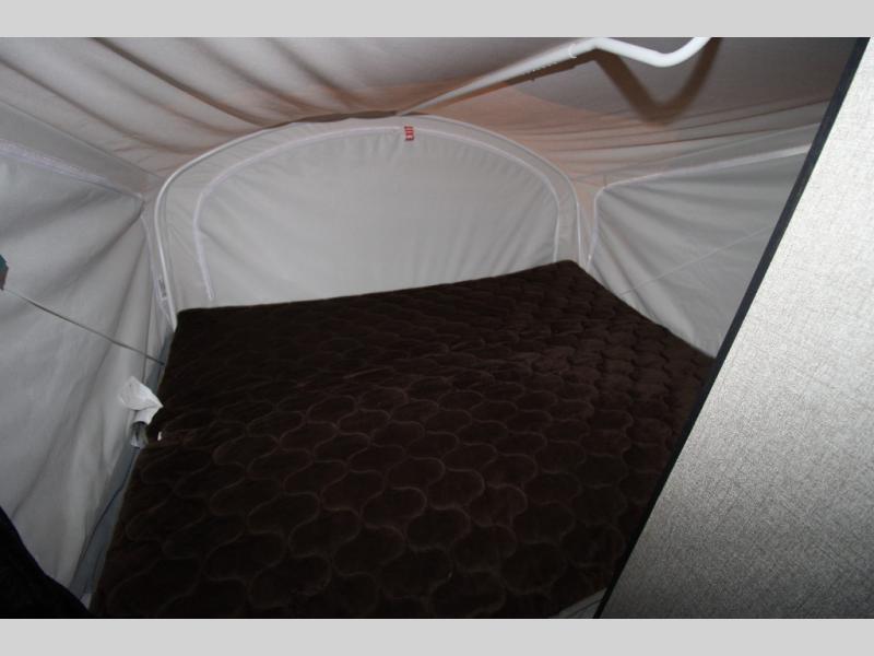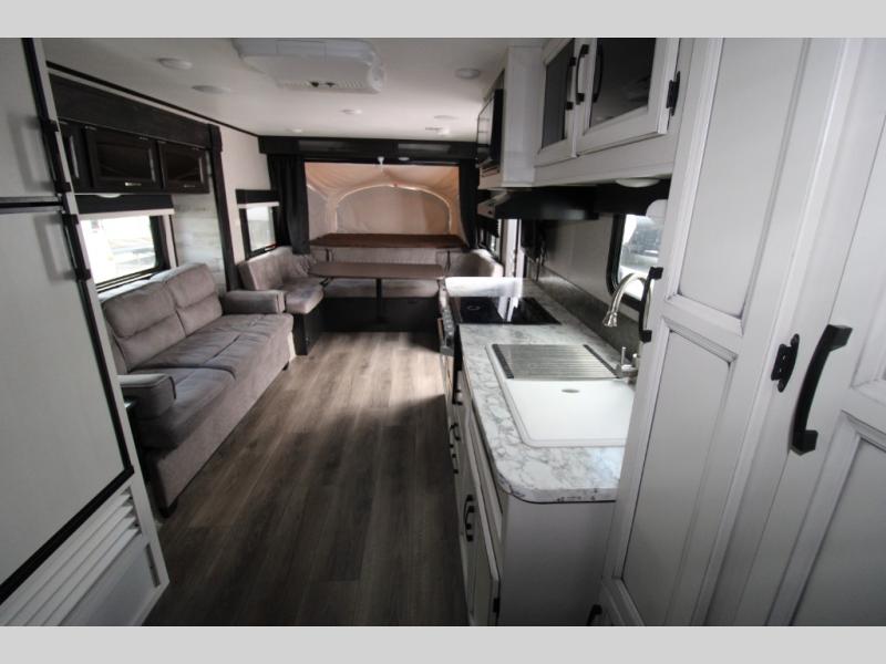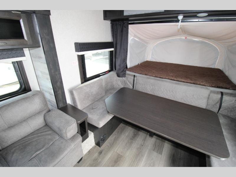 The whole family can enjoy dinner together around the U-shaped dinette and play a board game before preparing this space for two people to sleep. The sofa slide out also doubles as sleeping space, and the two tent end beds offer plenty of room for four more family members, and each bed offers a privacy curtain and overhead storage. You will be able to cook in the kitchen area and store leftovers in the fridge, get cleaned up in the full bathroom, and choose to be inside whenever you like. You will soon find out that the 13' power awning with LED lights provides an outdoor living area, the storage along the exterior gives you space for outdoor gear, and the aluminum-tread entry steps help when the campsite isn't so flat.
