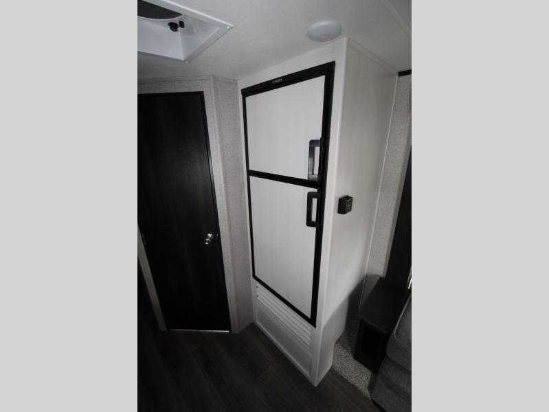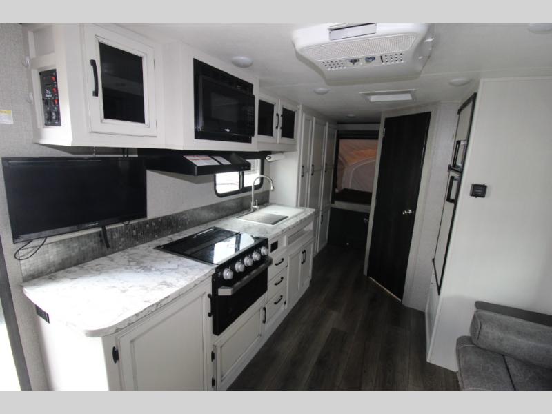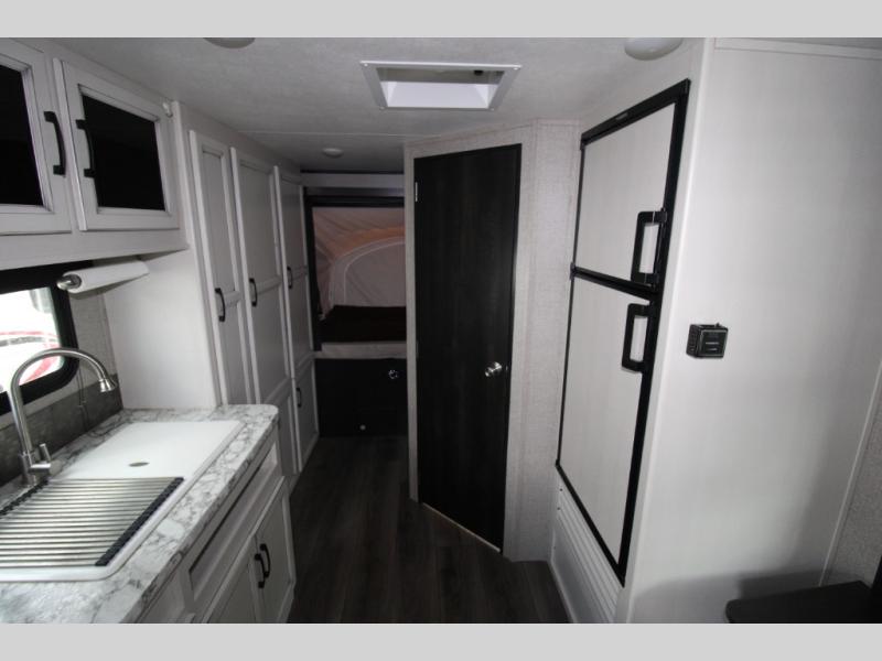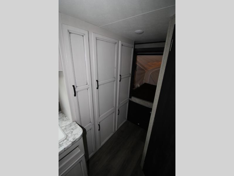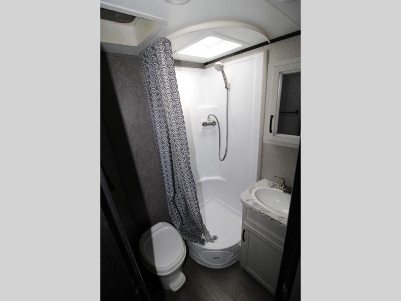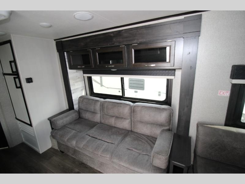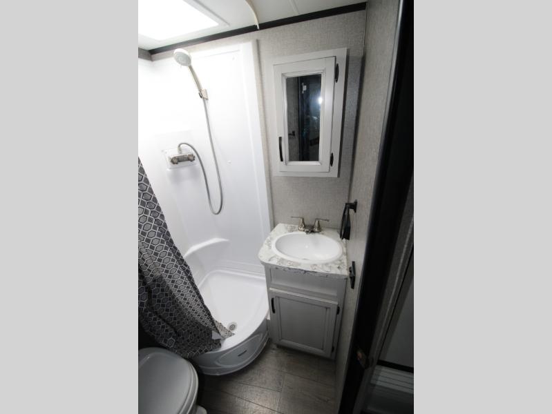The whole family can enjoy dinner together around the U-shaped dinette and play a board game before preparing this space for two people to sleep. The sofa slide out also doubles as sleeping space, and the two tent end beds offer plenty of room for four more family members, and each bed offers a privacy curtain and overhead storage. You will be able to cook in the kitchen area and store leftovers in the fridge, get cleaned up in the full bathroom, and choose to be inside whenever you like. You will soon find out that the 13' power awning with LED lights provides an outdoor living area, the storage along the exterior gives you space for outdoor gear, and the aluminum-tread entry steps help when the campsite isn't so flat.