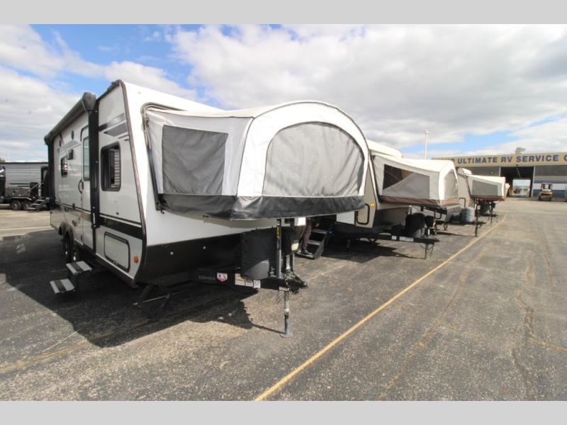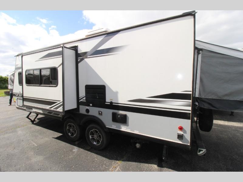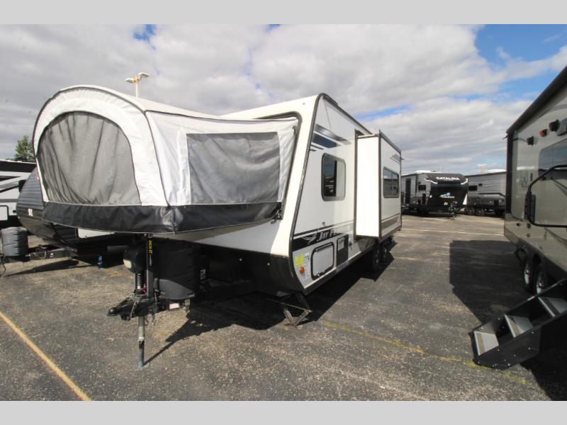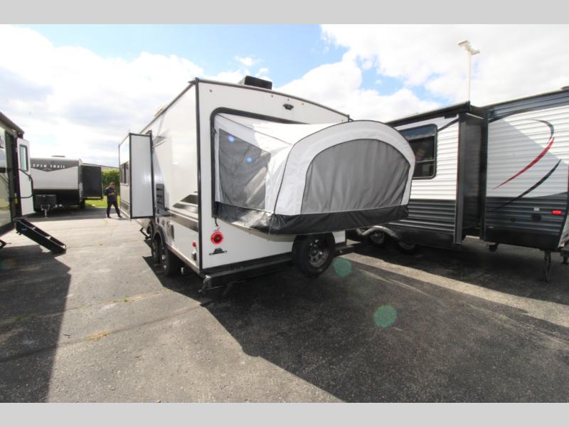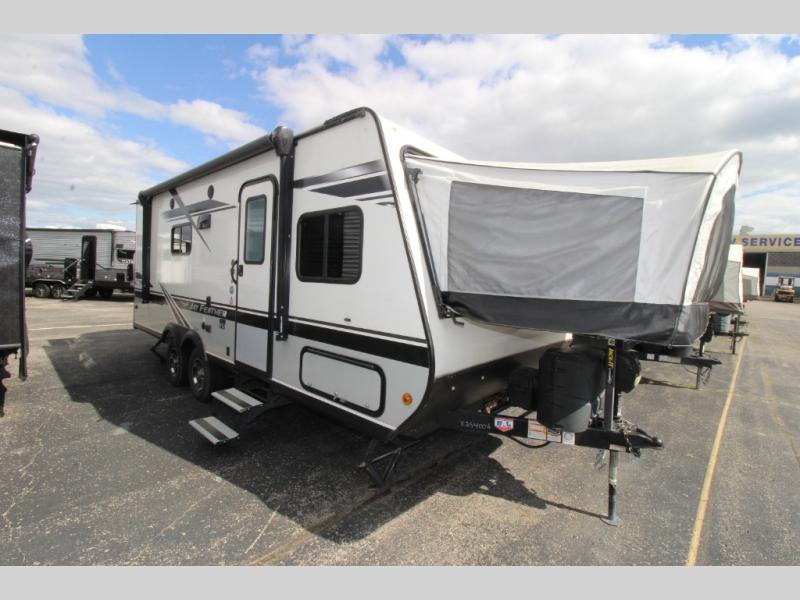 The Jayco Jay Feather hybrid expandable offers an aerodynamic, rounded front profile with a diamond plate, a modern retro graphics package with a two-colored sidewall, Stronghold VBL vacuum-boned, laminated floor, side, rear and front walls on an American-made Norco frame with integrated A-frame. You will appreciate the water-repellent, scratch resistant Jayco DuraTek vinyl tent material with zipper windows and permanently attached tent-to-bed base design. Inside you will find smoked glass decorative inserts in select overhead cabinets, ball-bearing drawer glides, Jayco exclusive teddy bear "soft-touch" residential-style bed mats, and more! Choose your favorite floorplan, and start a new adventure!