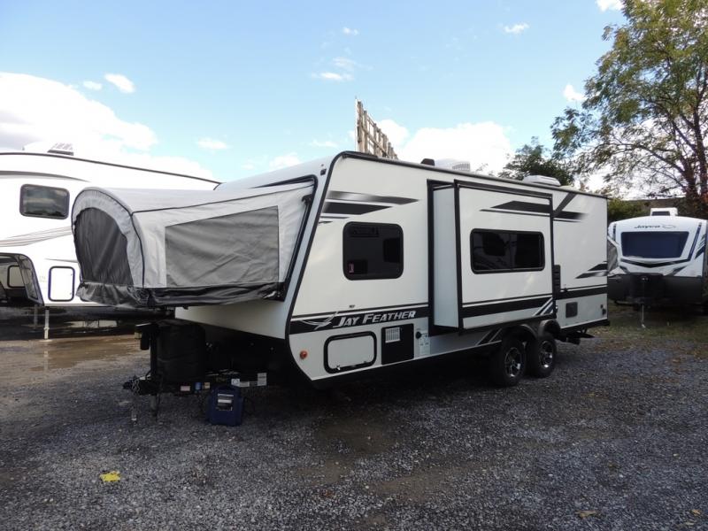 The Jayco Jay Feather hybrid expandable offers an aerodynamic, rounded front profile with a diamond plate, a modern retro graphics package with a two-colored sidewall, Stronghold VBL vacuum-boned, laminated floor, side, rear and front walls on an American-made Norco frame with integrated A-frame. You will appreciate the water-repellent, scratch resistant Jayco DuraTek vinyl tent material with zipper windows and permanently attached tent-to-bed base design. Inside you will find smoked glass decorative inserts in select overhead cabinets, ball-bearing drawer glides, Jayco exclusive teddy bear "soft-touch" residential-style bed mats, and more! Choose your favorite floorplan, and start a new adventure!