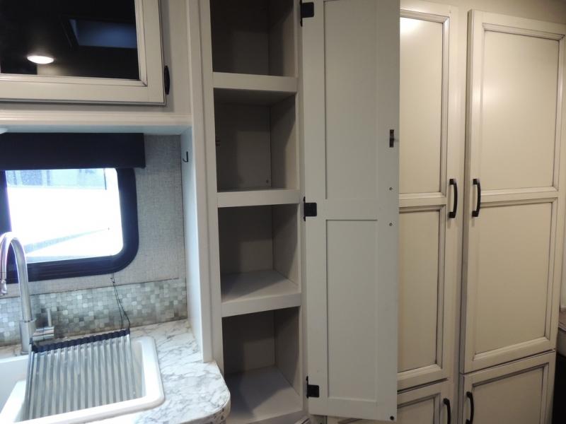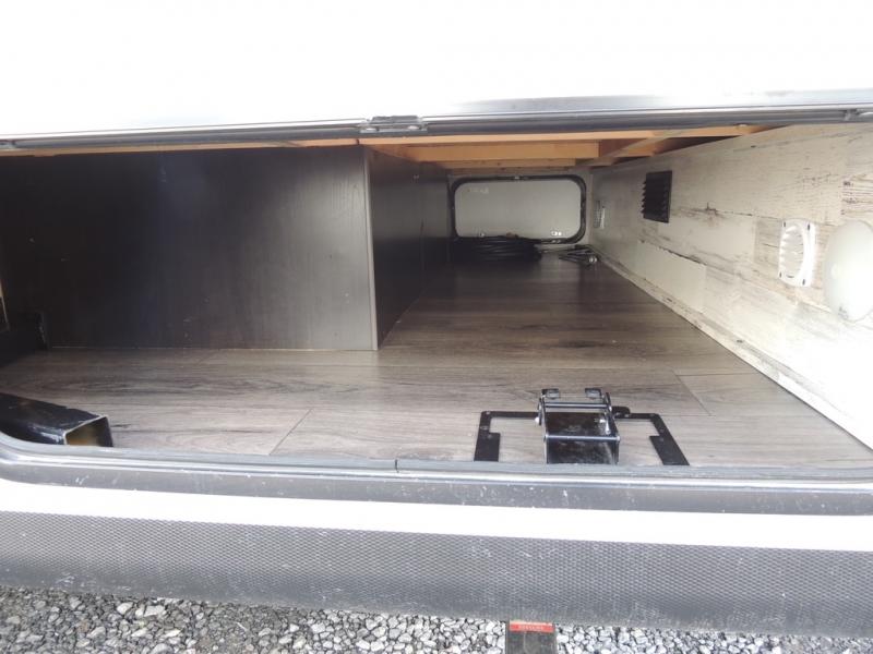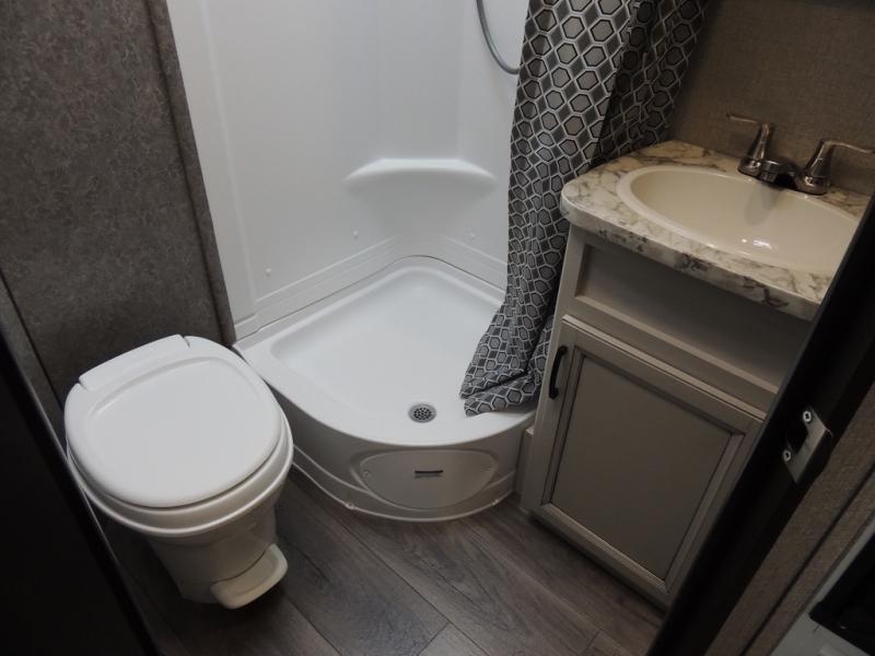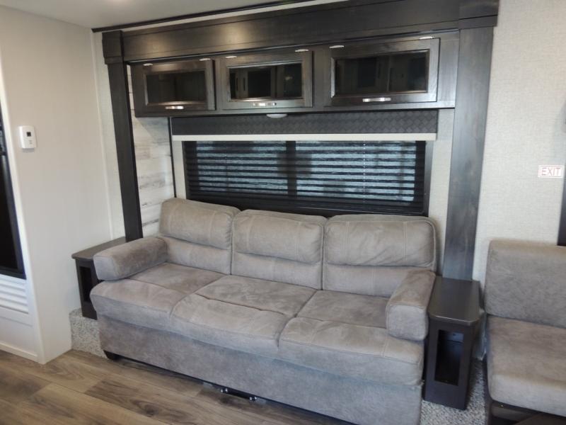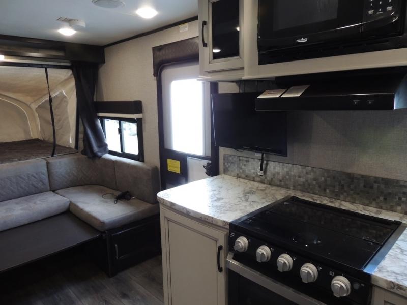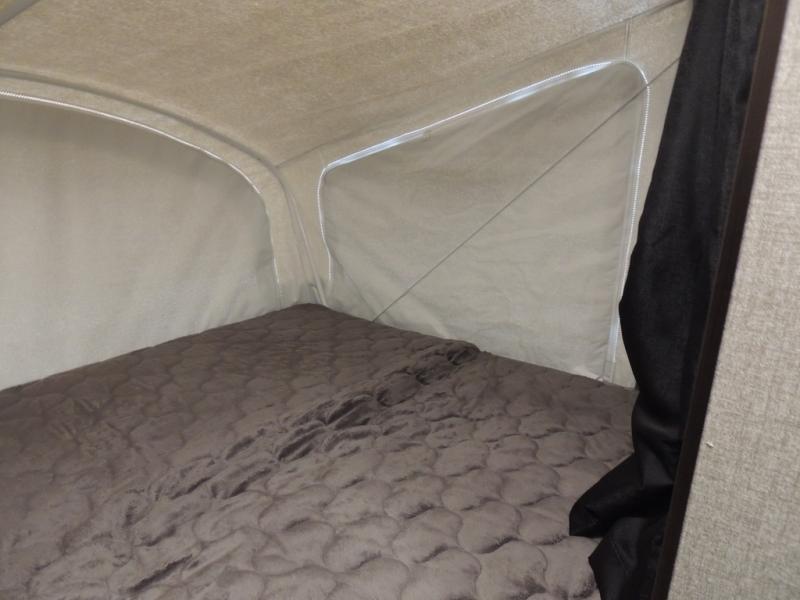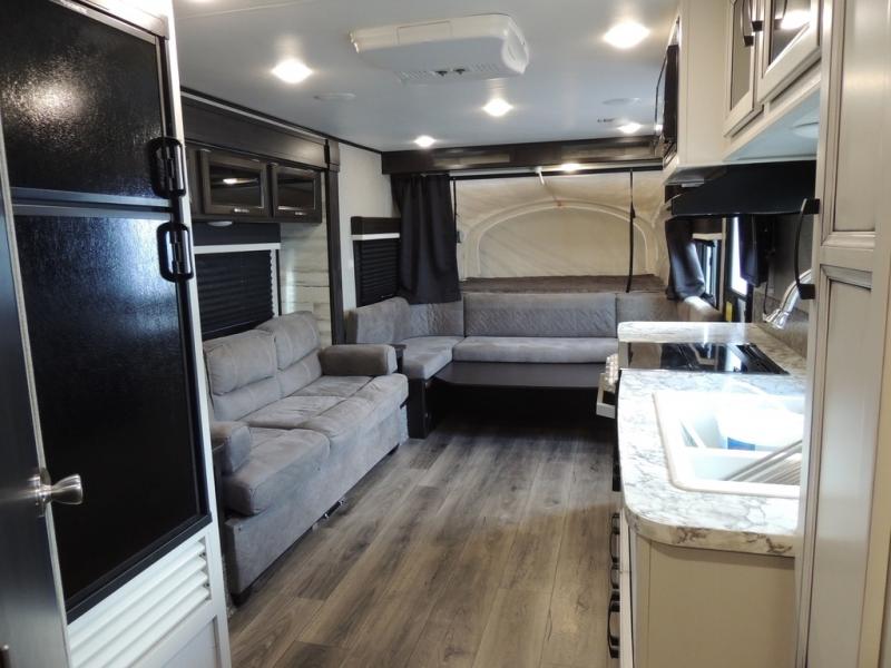 The whole family can enjoy dinner together around the U-shaped dinette and play a board game before preparing this space for two people to sleep. The sofa slide out also doubles as sleeping space, and the two tent end beds offer plenty of room for four more family members, and each bed offers a privacy curtain and overhead storage. You will be able to cook in the kitchen area and store leftovers in the fridge, get cleaned up in the full bathroom, and choose to be inside whenever you like. You will soon find out that the 13' power awning with LED lights provides an outdoor living area, the storage along the exterior gives you space for outdoor gear, and the aluminum-tread entry steps help when the campsite isn't so flat.