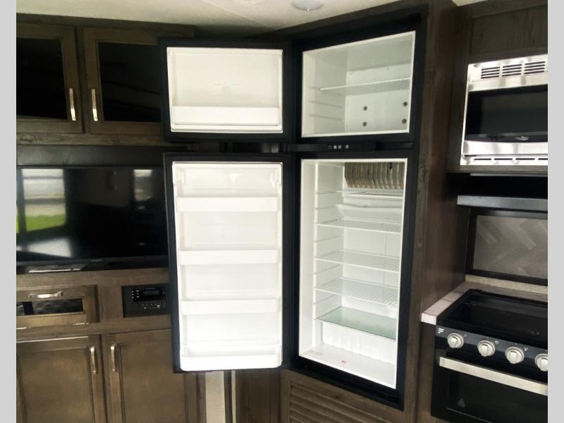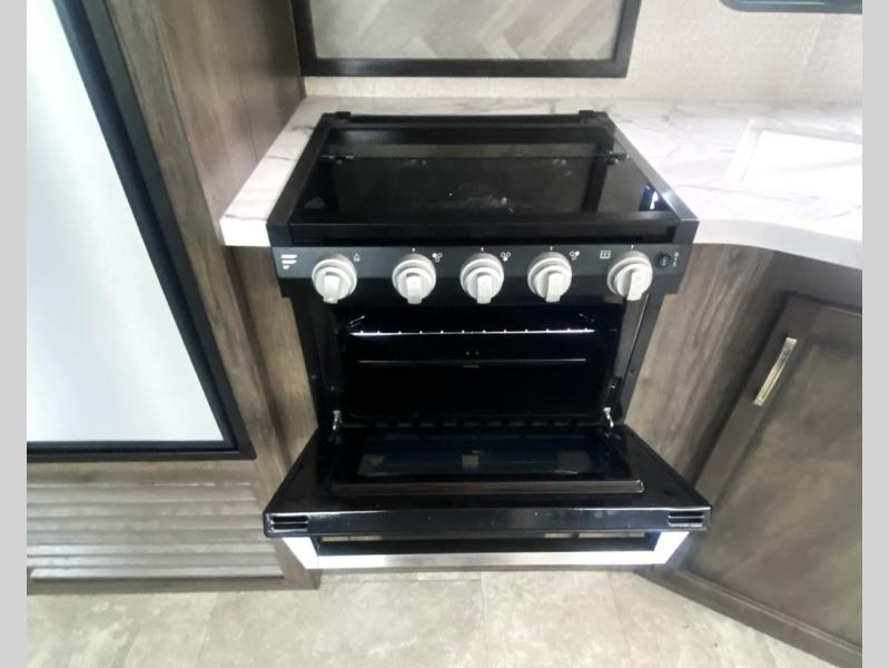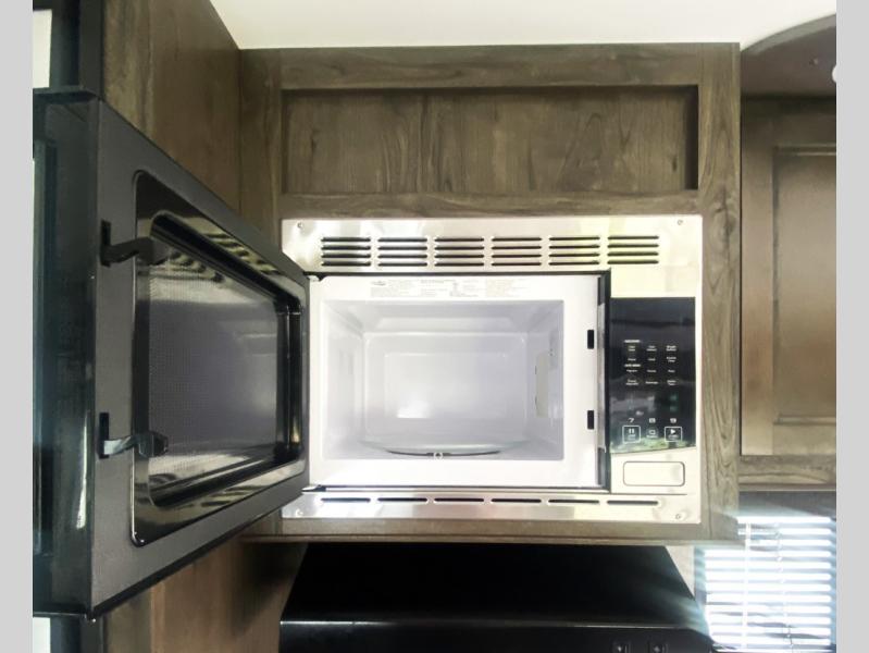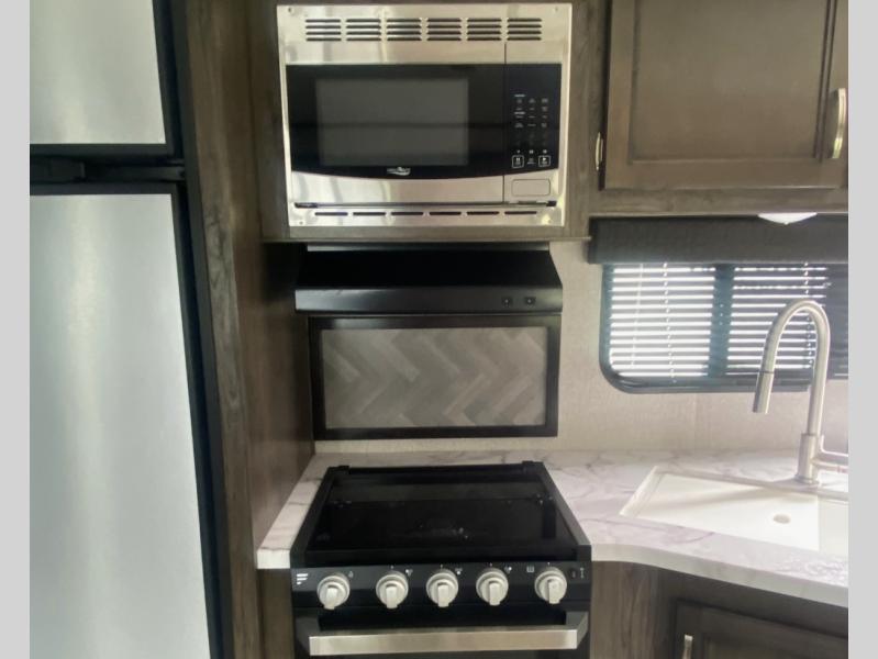 This Jay Flight travel trailer makes it impossible to not have fun while you're out exploring! The private bedroom up front is super convenient because it gives you a secluded space to relax and unwind. Plus, it has windows on either side so that there is plenty of natural light during the afternoon when you want to sit down and read a book, and there is also a second exterior entrance so that you can come and go as you please. The main living area will also be a favorable spot to spend your time with the booth dinette, sofa, and two lounge chairs. You will be able to view the entertainment center from all of these resting places, and you can even chat with the chef who is preparing dinner on the three-burner cooktop too.
