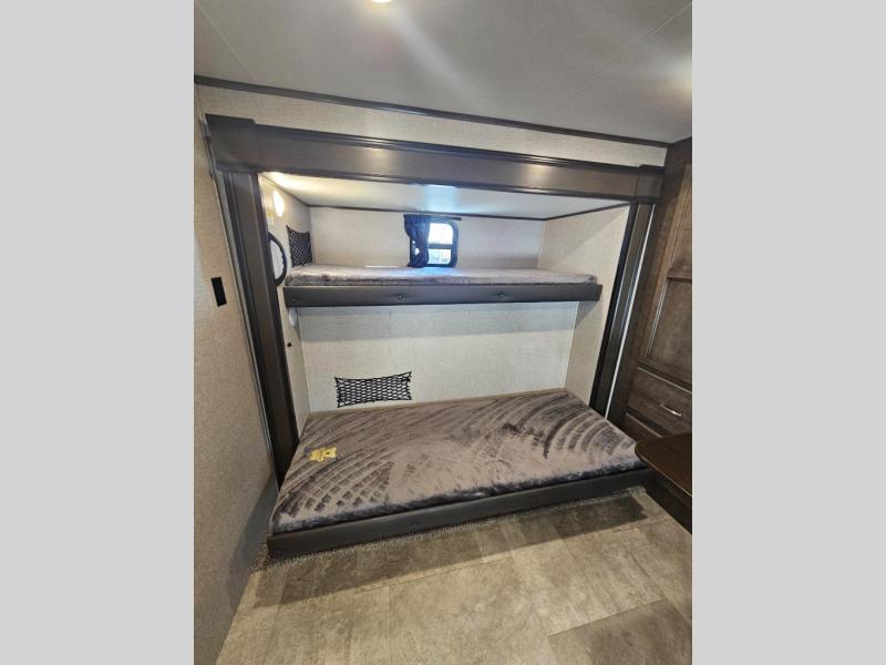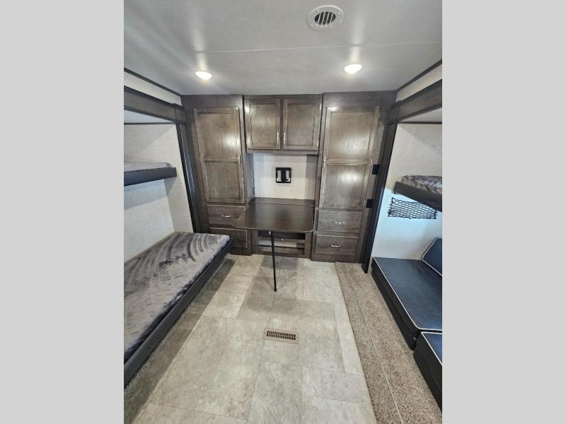 Your kids will beg you to get this Jay Flight travel trailer because of the awesome private bunkhouse in the back! This space has its own entertainment center with wardrobes on either side, a flip-up table, and opposing slides so that there is tons of space to sit down and play on the floor. Plus, since there is a private bedroom up front, you and your spouse can escape the chaos each night. You will also love spending your mornings sipping on your coffee outside while you cook up some bacon and eggs at the outdoor kitchen.