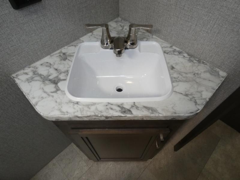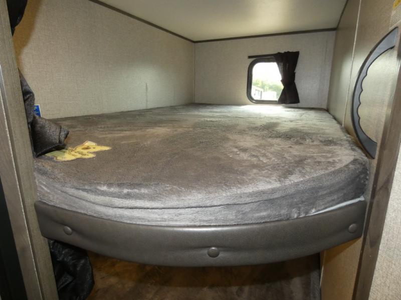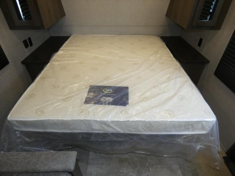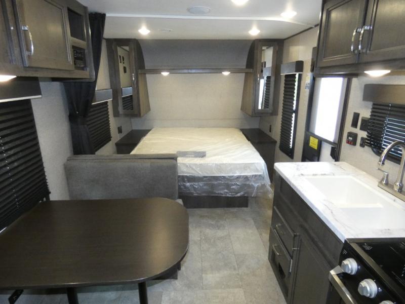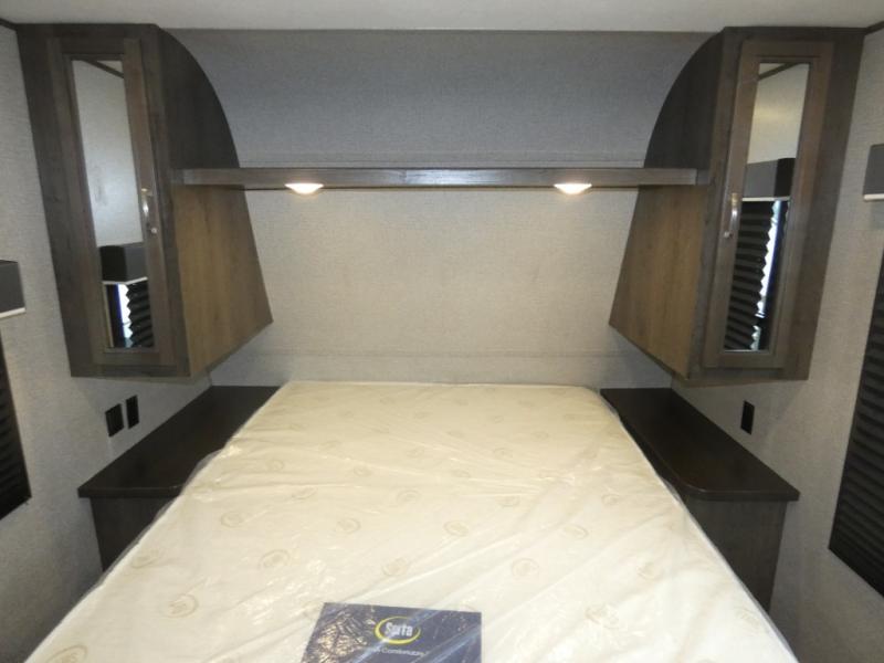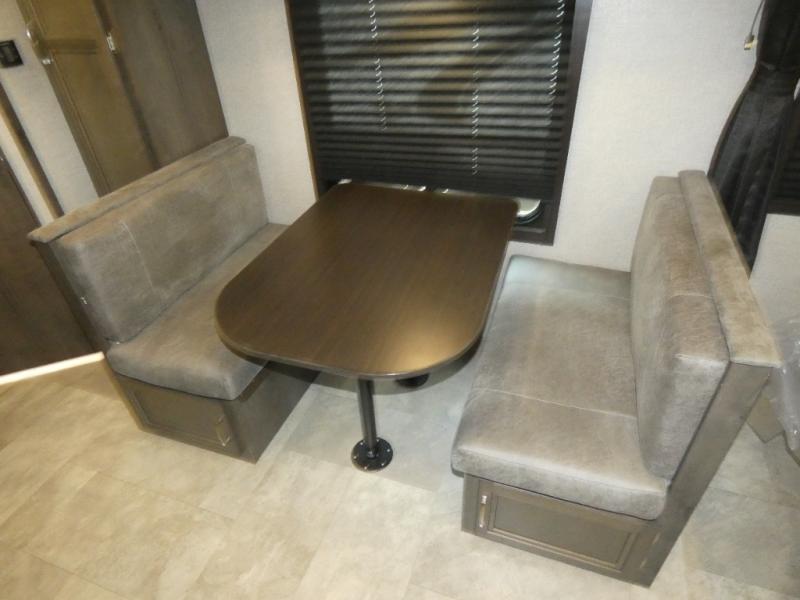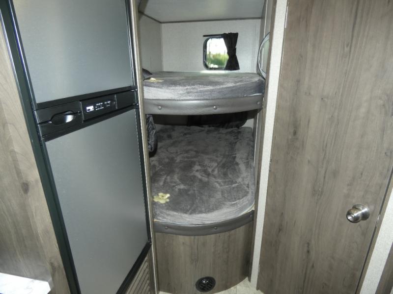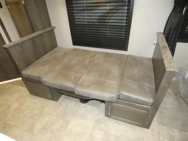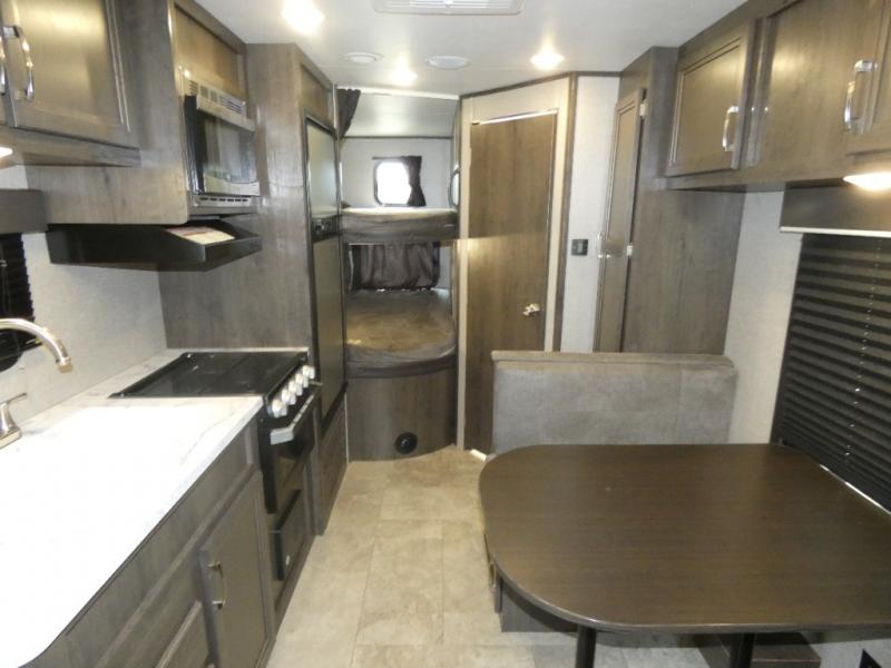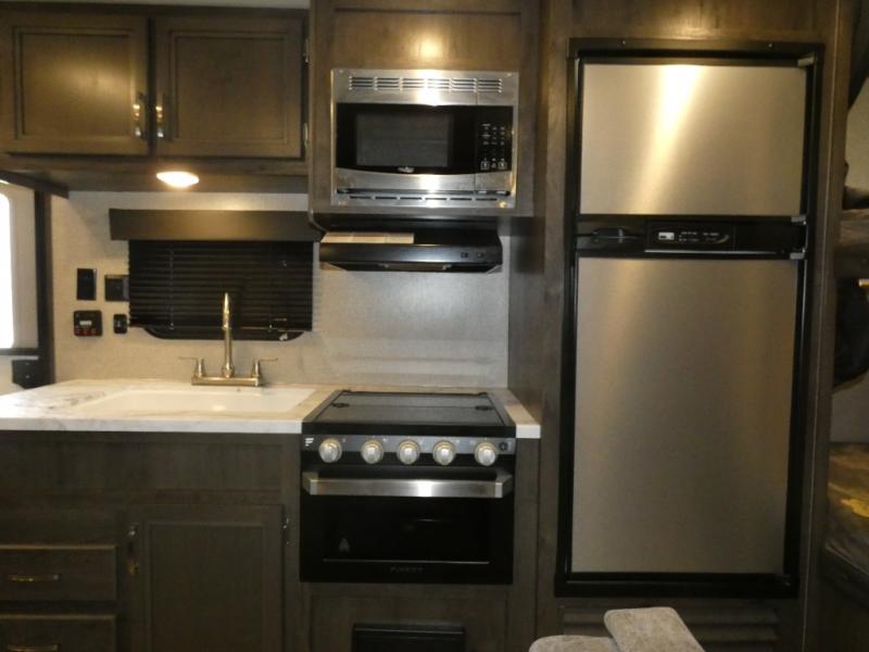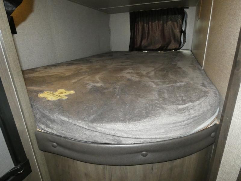 Relax and listen to the music under the 13' power awning with LED lights and speakers while the cook makes a meal on the outside kitchen. You can even grab a drink from the outdoor fridge. When you are ready for some air conditioning, the booth dinette will be a great place to play cards and visit. At night, the kids will love the double size bunks beds and you will appreciate having your own walk-around queen bed with large shelving above to place your things, and solid wood cabinets on each side for your clothing, and a curtain to close for privacy when changing clothes.