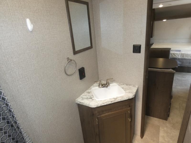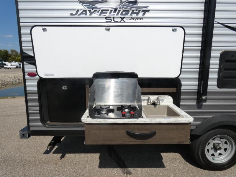 Each Jay Flight SLX 8 travel trailer by Jayco includes the Magnum Truss Roof system which provides seamless DiFlex II material on the roof and plywood decking, and a fully integrated A-frame and I-class cambered structural steel I-beams which is built to last! The roof-mounted air conditioner will come in handy during the hotter months, and the two propane bottles will help keep your showers hot and your meals warm! And when you need to rinse off yourself, your bikes, or the gear, the outdoor shower will do the trick. Choose the floorplan that fits your adventurous side, and load up the family for fun!