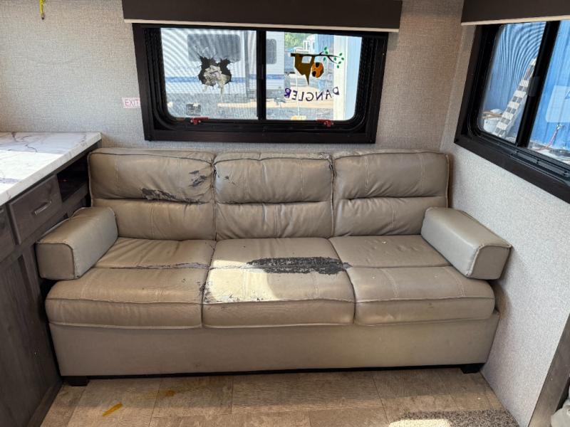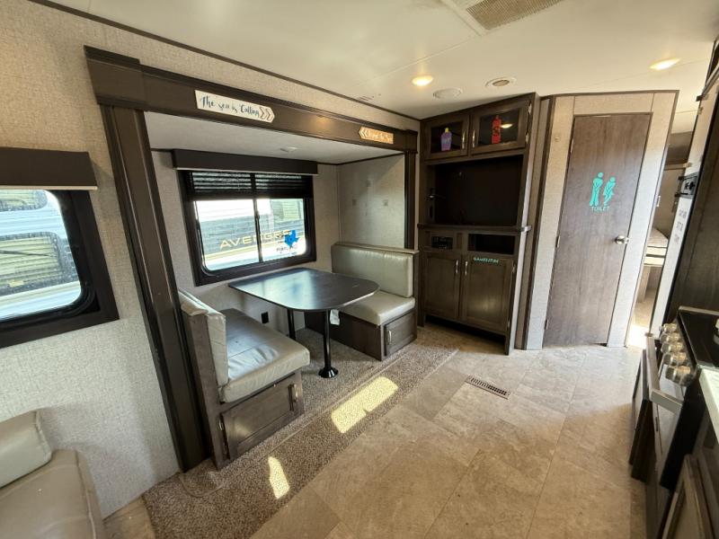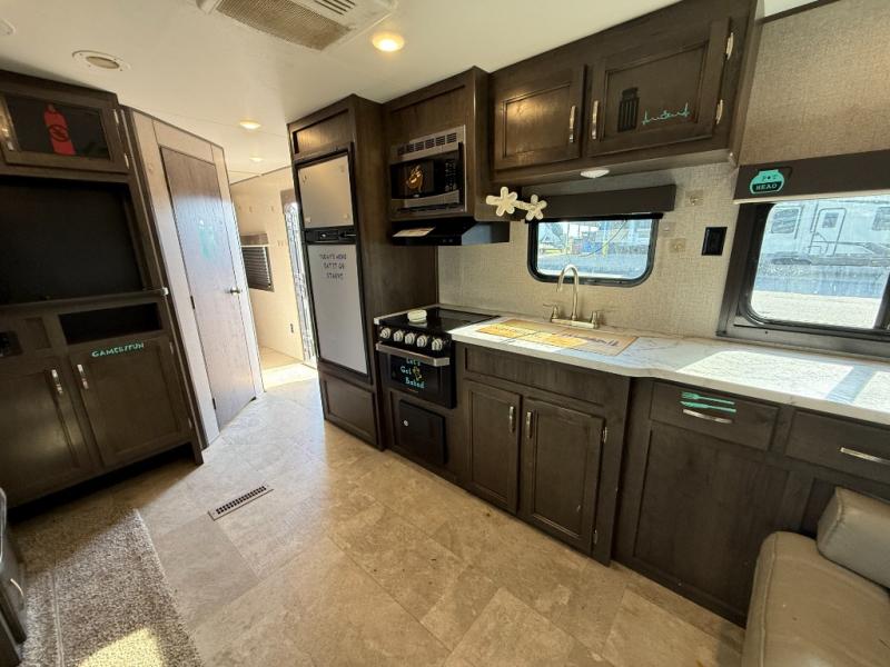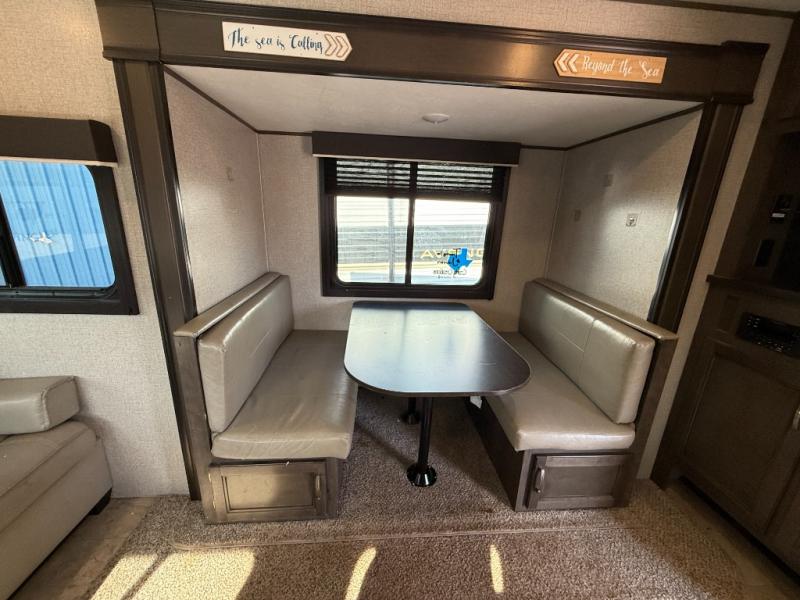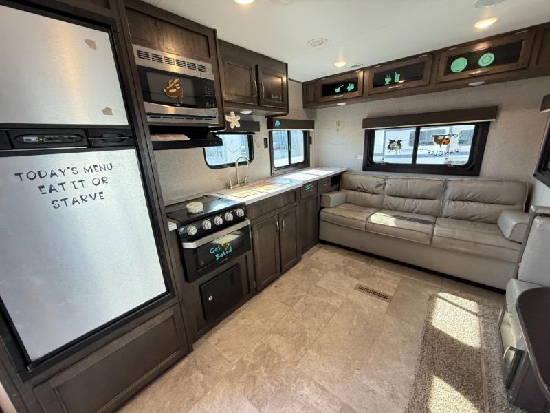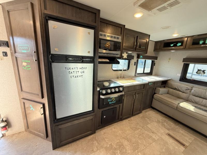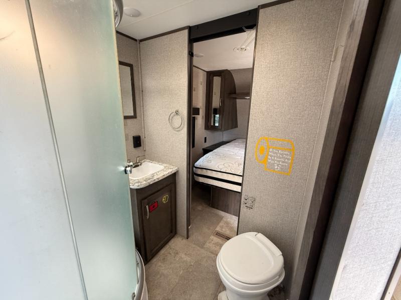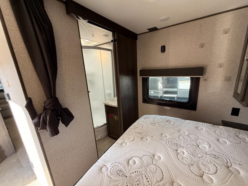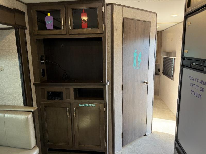 Whether you enjoy inside or outside time, you can have it all when this trailer is setup at the campsite or RV spot. From the 16' power awning with LED lights and speakers, and exterior storage for your outdoor items to the spacious living and kitchen area inside thanks to the slide out, you can relax and unwind from a long work week. The dinette not only offers dining, you can also sleep here and play games. The rear jackknife sofa faces the entertainment center and you can take a seat when you get tired from cooking a meal. And don't forget about having your own master bedroom with a queen Serta mattress and solid wood cabinet wardrobes on each side, plus a shelf above for more storage. You might even decide to add the optional Chil "N" Stor outside.