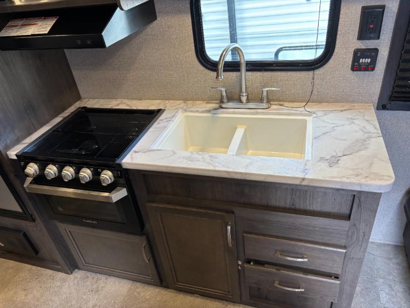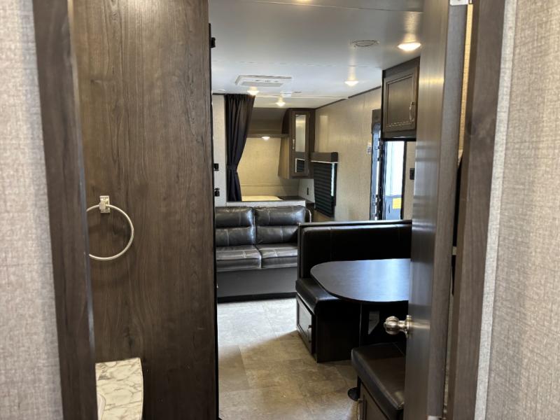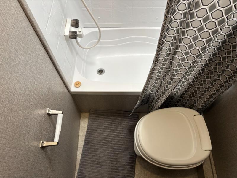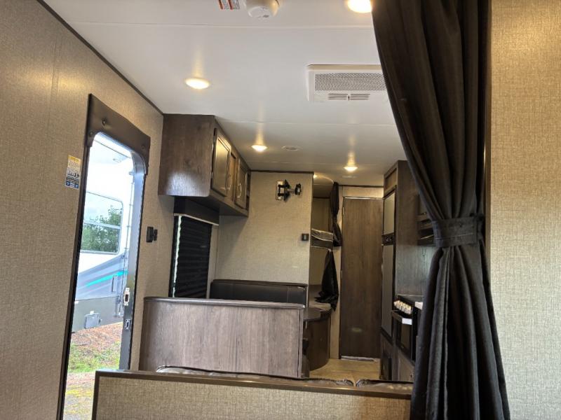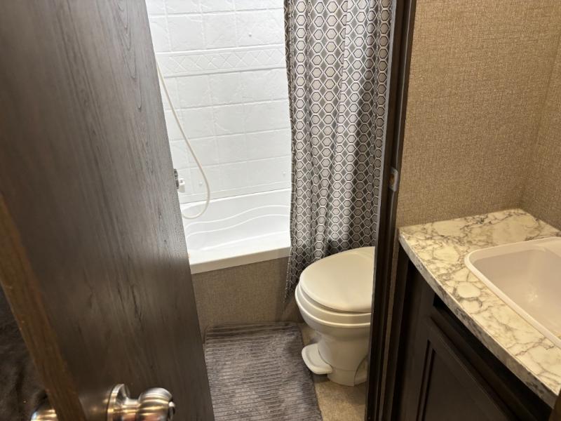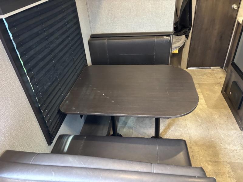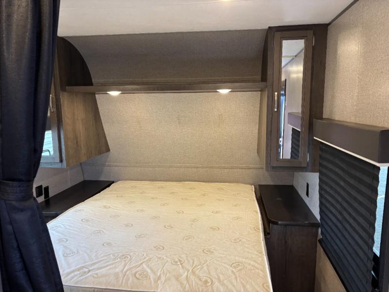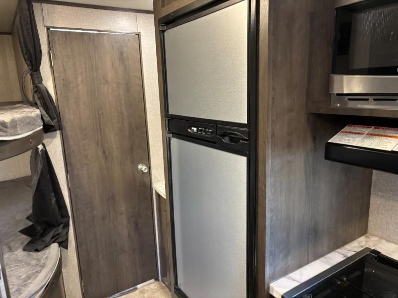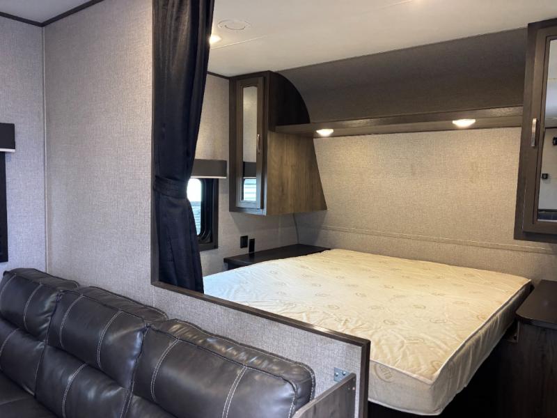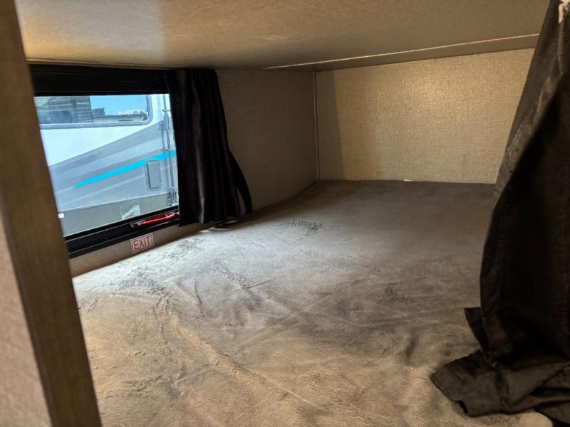 The kids are ready, are you! The double size bunks have been claimed by the kids and their friends, while you get to enjoy your own walk-around queen Serta mattress, dual solid wood cabinet wardrobes and a shelf above the bed for your personal items. You can close the curtain for privacy as the kids have that same choice with the bunks. There is a sofa and booth dinette for inside seating, and outside you can grab your camp chairs from the pass-through compartment to relax under the power awning during the day or at night thanks to the LED lights. And the full kitchen, plus the private tub/shower and toilet room allow you to make meals and stay clean as long as you plan to stay.