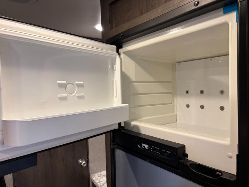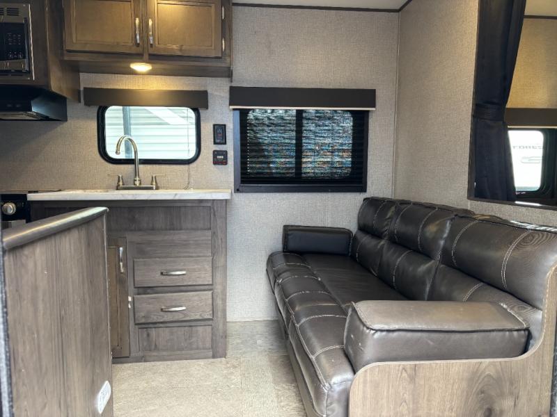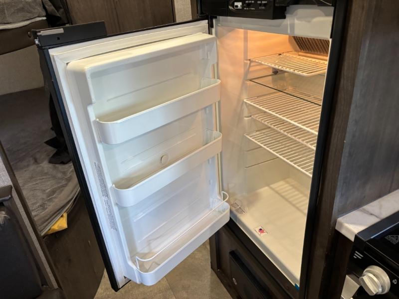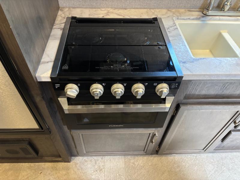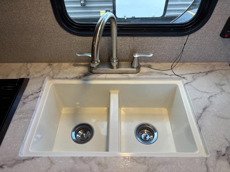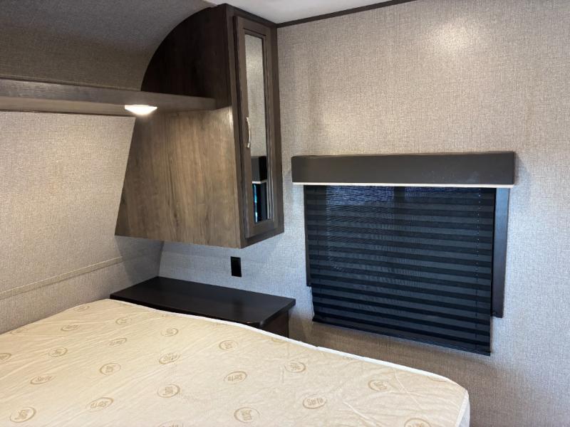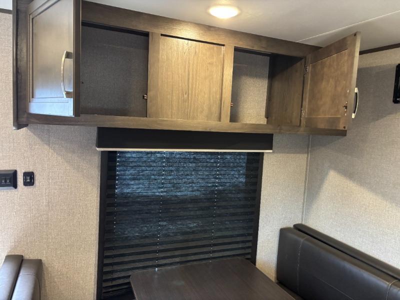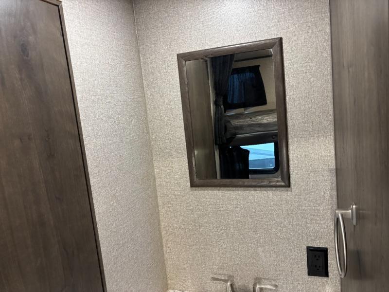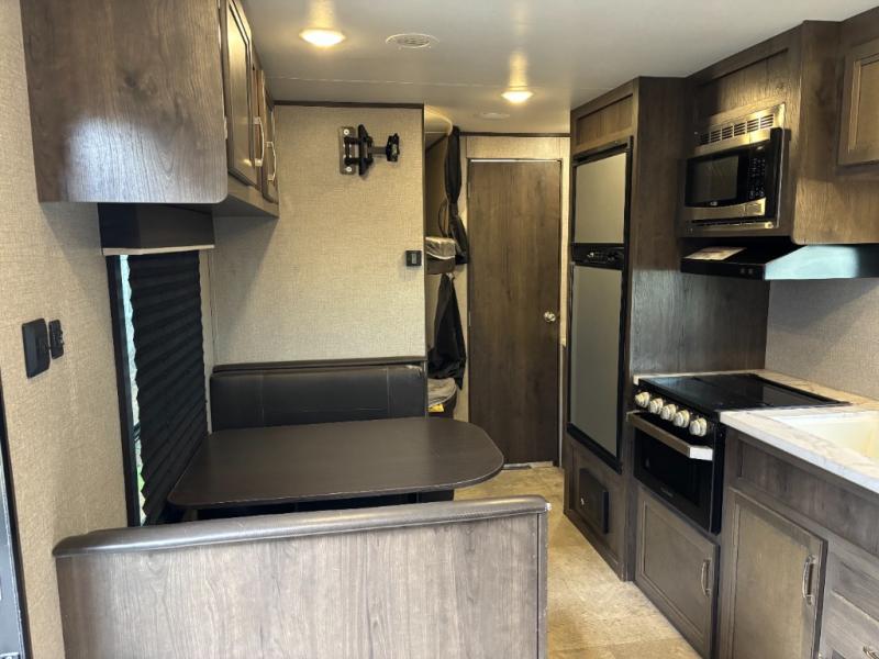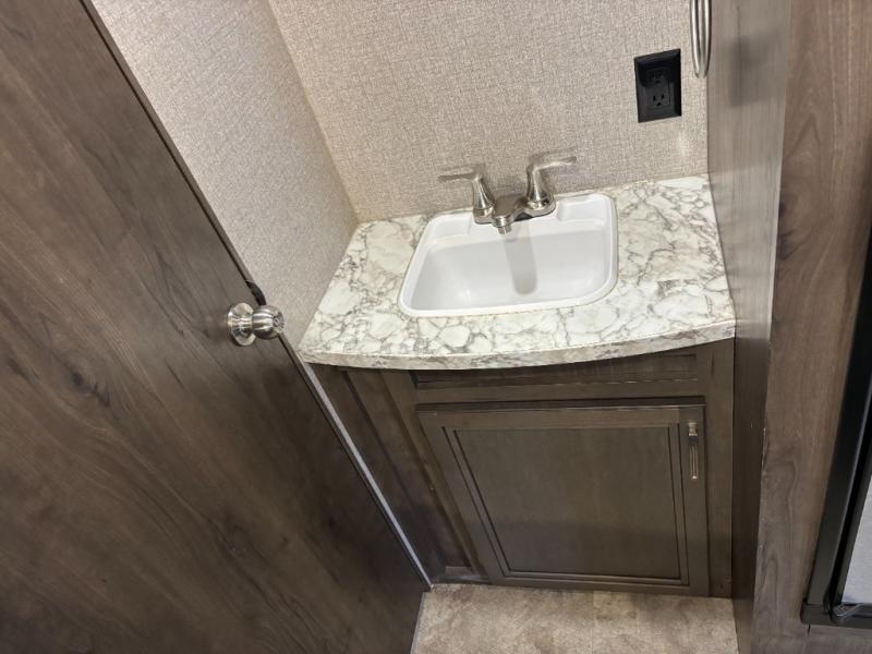 The kids are ready, are you! The double size bunks have been claimed by the kids and their friends, while you get to enjoy your own walk-around queen Serta mattress, dual solid wood cabinet wardrobes and a shelf above the bed for your personal items. You can close the curtain for privacy as the kids have that same choice with the bunks. There is a sofa and booth dinette for inside seating, and outside you can grab your camp chairs from the pass-through compartment to relax under the power awning during the day or at night thanks to the LED lights. And the full kitchen, plus the private tub/shower and toilet room allow you to make meals and stay clean as long as you plan to stay.