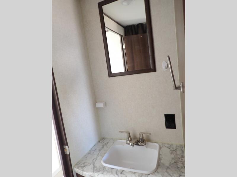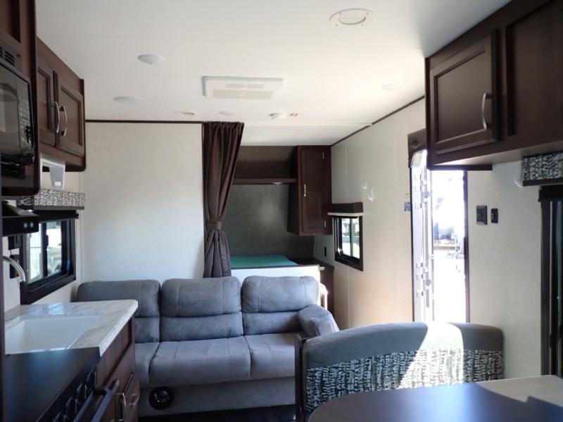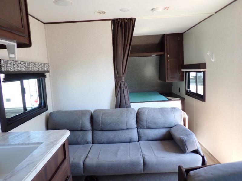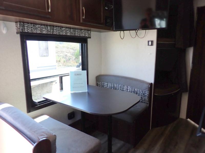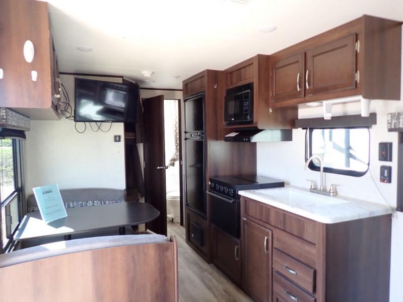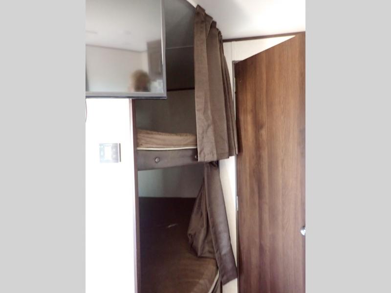 The kids are ready, are you! The double size bunks have been claimed by the kids and their friends, while you get to enjoy your own walk-around queen Serta mattress, dual solid wood cabinet wardrobes and a shelf above the bed for your personal items. You can close the curtain for privacy as the kids have that same choice with the bunks. There is a sofa and booth dinette for inside seating, and outside you can grab your camp chairs from the pass-through compartment to relax under the power awning during the day or at night thanks to the LED lights. And the full kitchen, plus the private tub/shower and toilet room allow you to make meals and stay clean as long as you plan to stay.