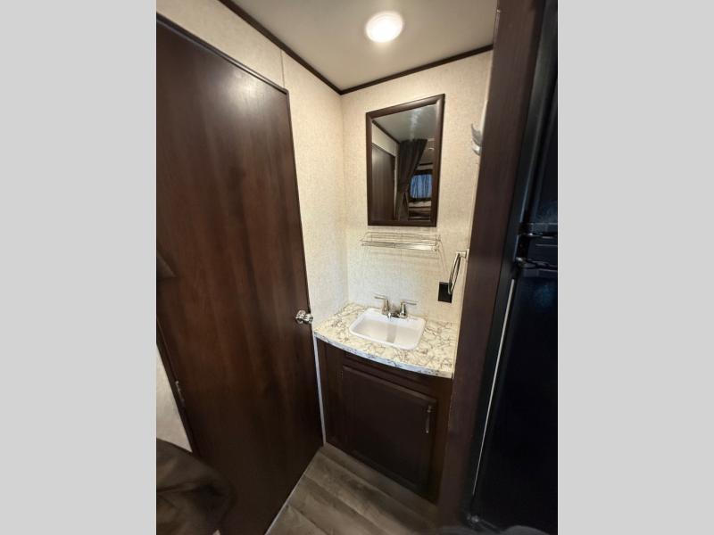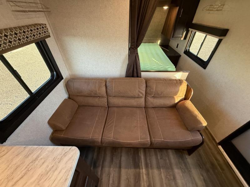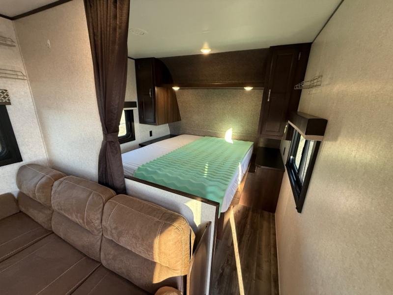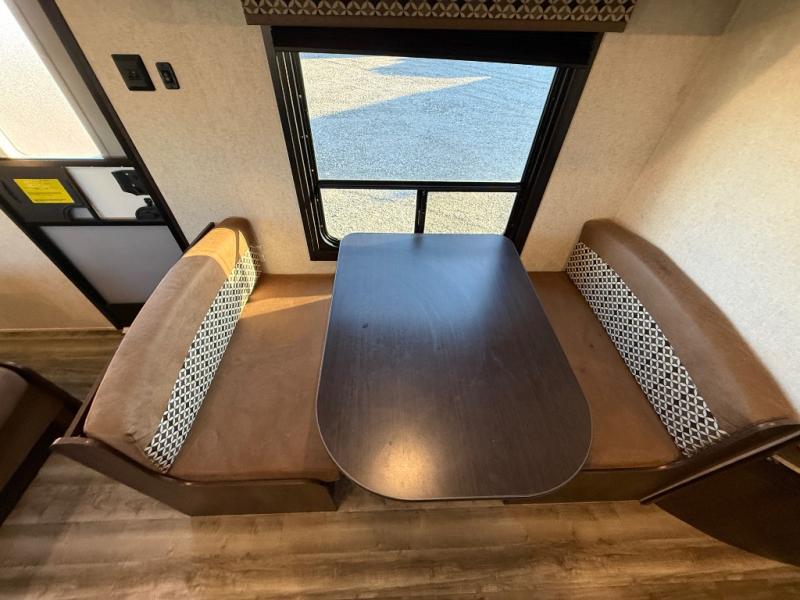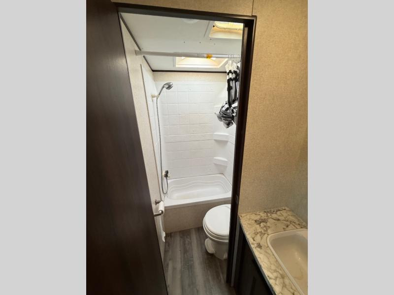 The kids are ready, are you! The double size bunks have been claimed by the kids and their friends, while you get to enjoy your own walk-around queen Serta mattress, dual solid wood cabinet wardrobes and a shelf above the bed for your personal items. You can close the curtain for privacy as the kids have that same choice with the bunks. There is a sofa and booth dinette for inside seating, and outside you can grab your camp chairs from the pass-through compartment to relax under the power awning during the day or at night thanks to the LED lights. And the full kitchen, plus the private tub/shower and toilet room allow you to make meals and stay clean as long as you plan to stay.