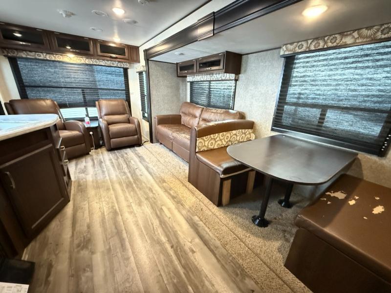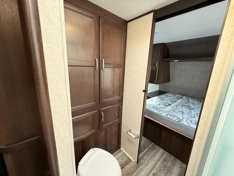 You can easily access the walk-through bathroom through the master bedroom which includes the second exterior entry/exit door or the main living and kitchen area. You will find everything you need to stay clean plus a linen closet. The queen Serta mattress will give you a good night's rest, plus the solid wood cabinet wardrobes and shelf above are stylish and useful. Be sure to claim your swivel rocker for the weekend and you can offer the kids or your guests the sofa or booth dinette in the large slide out after making them a meal or snacks in the full kitchen including a pantry.