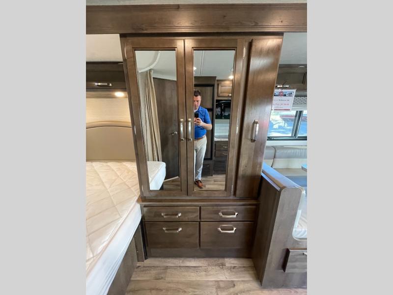 Each Jayco Melbourne Class C diesel coach gives you customer value features such as the Soundstream Infotainment dash radio with GPS and a CD/DVD Player helping you navigate your way while the family watches a movie. The remote control and heated mirrors along with the rear backup camera and monitor, plus keyless cab entry provide safety and convenience during any season. The raised-panel hardwood cabinetry, the linoleum floor, and the 84" ceiling height offer a stylish, easy to clean and spacious interior. Built for any adventure, choose the floorplan that works for you!