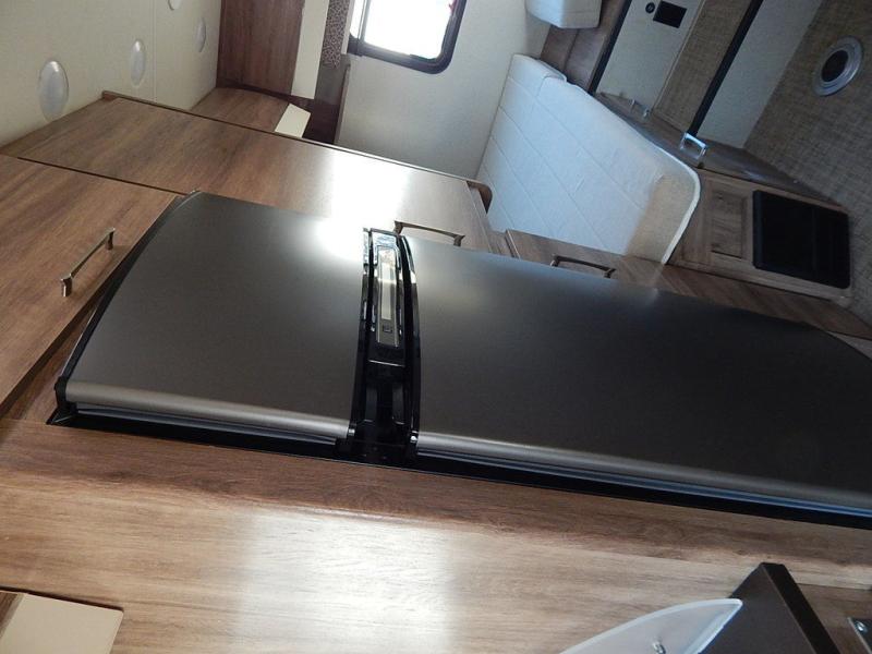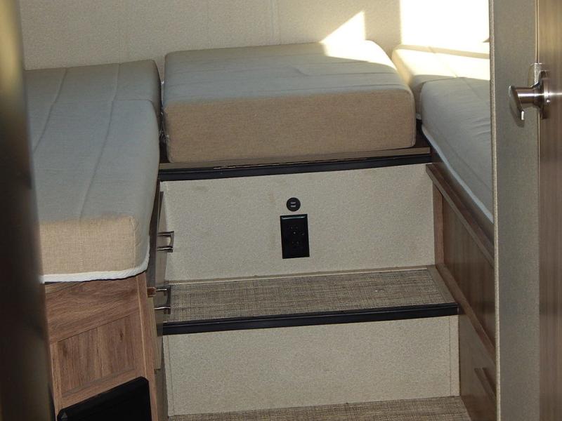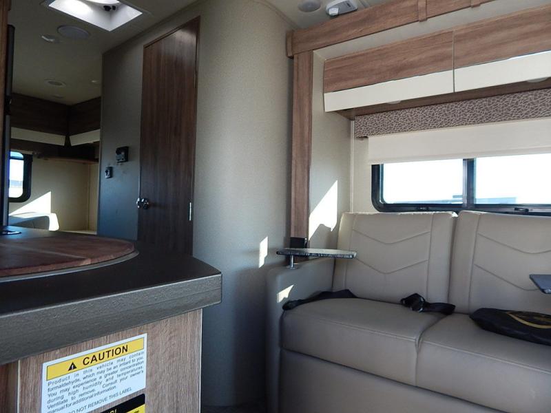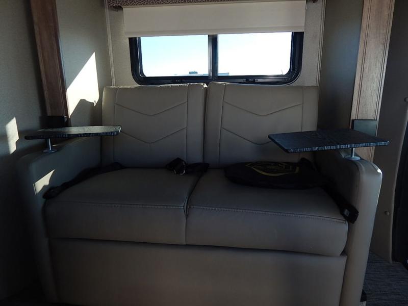 No worries about storage when you are traveling in this coach. You will find overhead cabinets, a wardrobe, and a 6 cu. ft. refrigerator. And you will love having twin beds to sleep on with floor space in between to easily get up to take a nighttime break in the full bathroom. And if the grandkids join you, they can sleep on the cab-over bunk with 750 lb. capacity, and on the sofa slide out. The Ultra leather captain's chairs swivel to provide more seating, and the kitchen offers everything you will need to make warm meals. And if the weather is just right then relax under the 14' awning during the day or night.