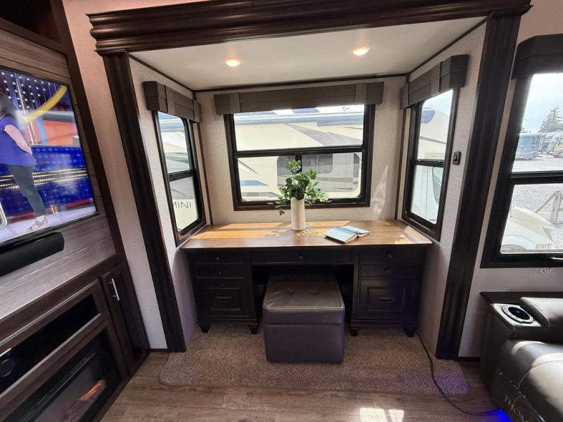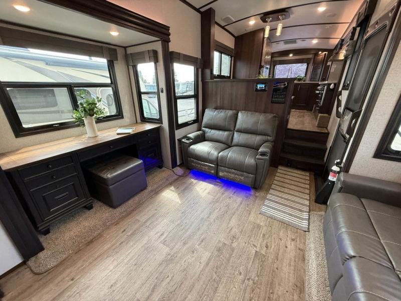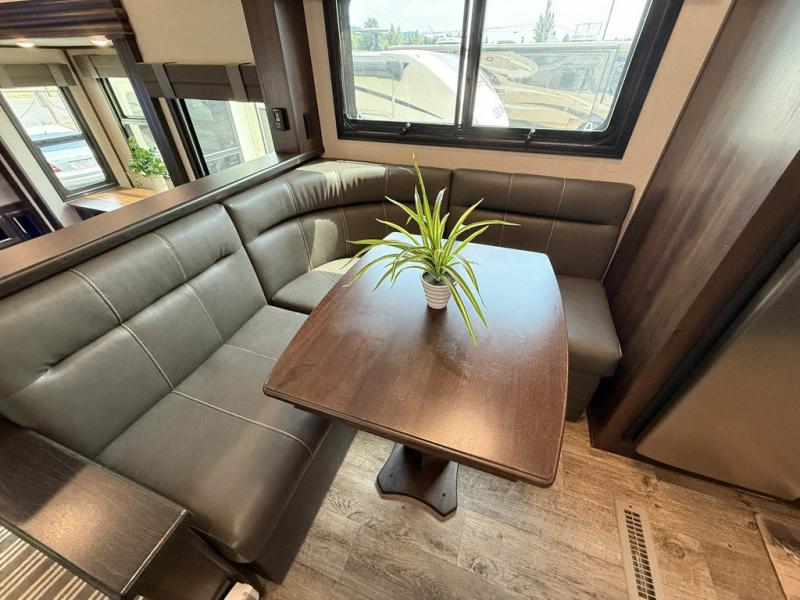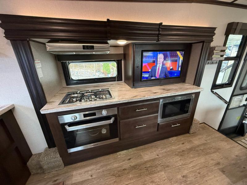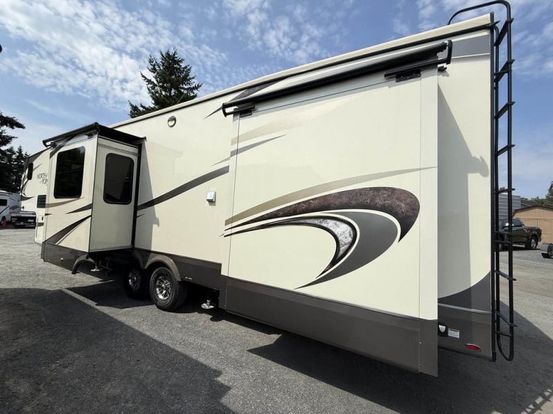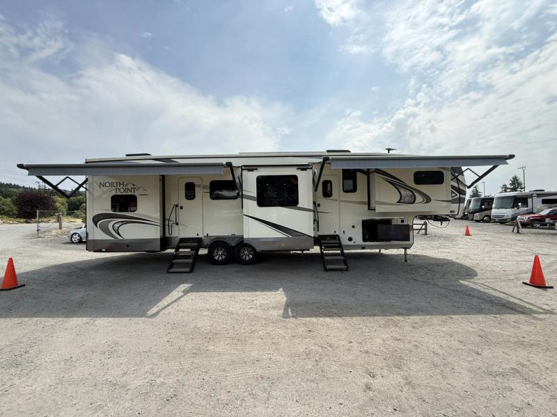 You will have plenty of features to make every trip a phenomenal one with this North Point fifth wheel! The front kitchen will be fun to work in because you will be able to gaze out at the beautiful scenery through the front window while you sizzle up some steaks on the four-burner range. A theater sofa will be where you want to put your feet up after doing the hard job of washing dishes in the stainless steel sink with residential pull-out faucet, and if you prefer to relax outside, you can do so underneath the two electric awnings with LED lights.