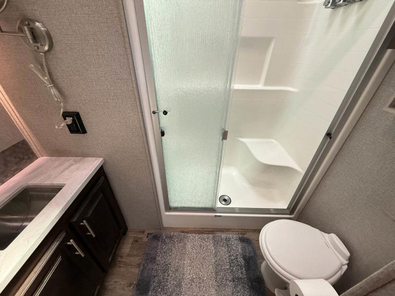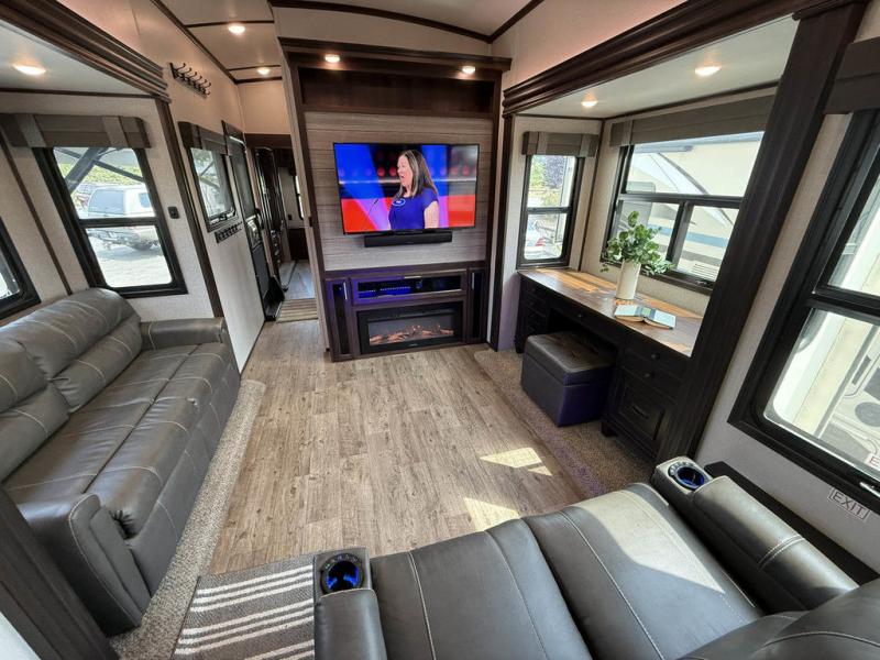 The North Point fifth wheels from Jayco provide you with the best combination of luxury and practicality! The 5-Star Handling Package gives these units smooth towing with Goodyear Endurance tires and Dexter axles with Nev-R-Adjust brakes and E-Z Lube hubs. You will also find unmistakable elegance all throughout the interior with an LED fireplace, Bellavati countertops, an integrated sound bar, and a stone and glass tile backsplash in the bathroom. Plus, you will also find a central vacuum system to make it easier to clean the Shaw residential carpeting with stain guard while you are away.