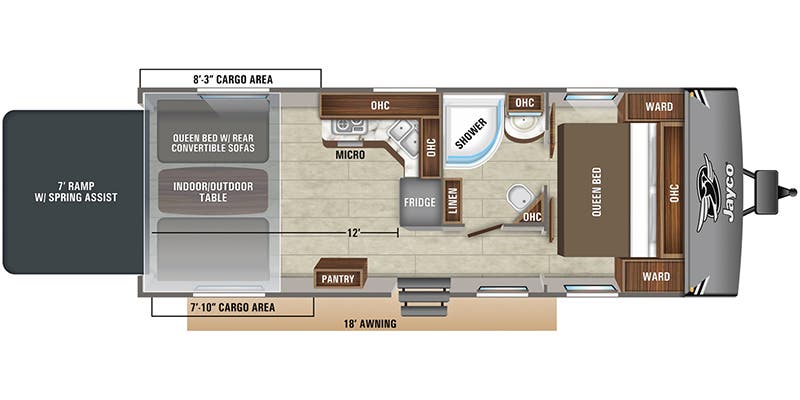 It's time to load up your off-road toys and camping gear, gather the family, and head out on the open road in this Octane Super Lite toy hauler by Jayco. You will love setting up camp because of how easy it will be to remove all of your equipment through the 8' wide ramp door opening and down the 7' ramp with spring assist, and after you've removed all of your gear, you will find it just as simple to set up your living space with the convertible sofas and indoor/outdoor table. You will thoroughly enjoy the privacy that comes along with the master suite, and spending an evening of rest on the queen-size bed will feel ultra relaxing.