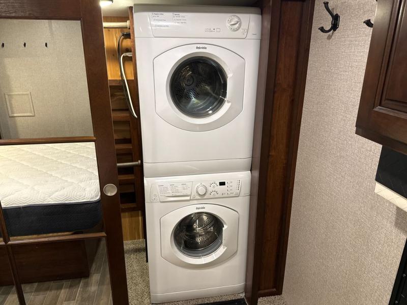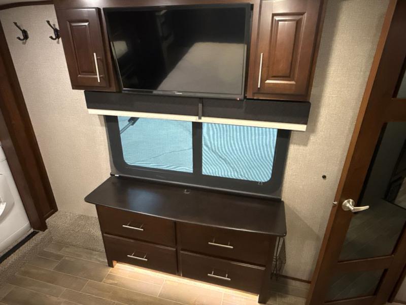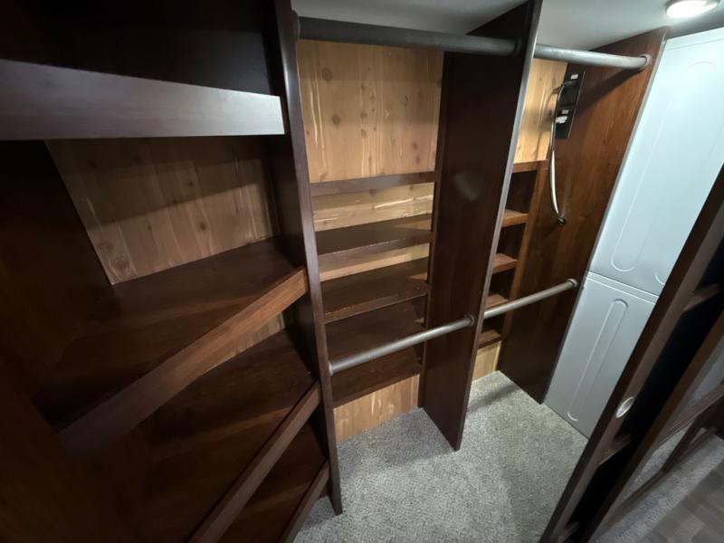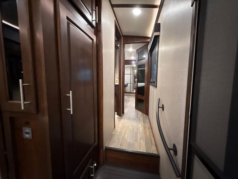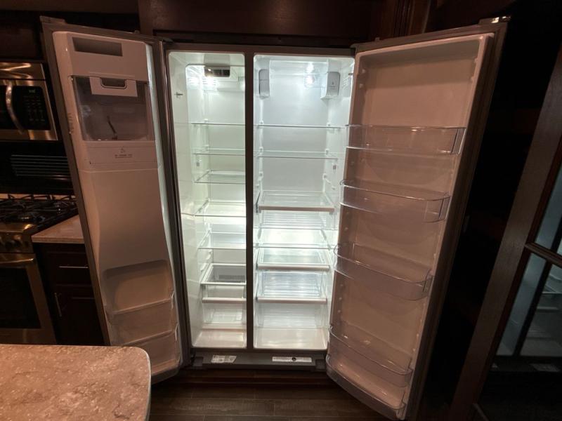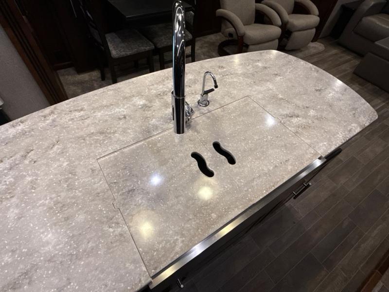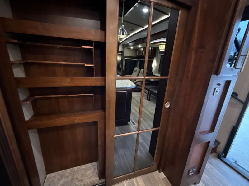 If you are a couple or family of four, this Pinnacle fifth wheel is perfect for you! This model delivers a luxurious sleeping environment with a front master bedroom that contains a residential king Serta mattress and a walk-in closet. Every night you will be able to rest in a large living and kitchen area thanks to the two opposing slides that add extra space for wonderful additions like the tri-fold sofa bed, ottoman, and entertainment center with a retractable TV. You will also find plenty of storage throughout this model, especially inside of the walk-in pantry with sliding doors.