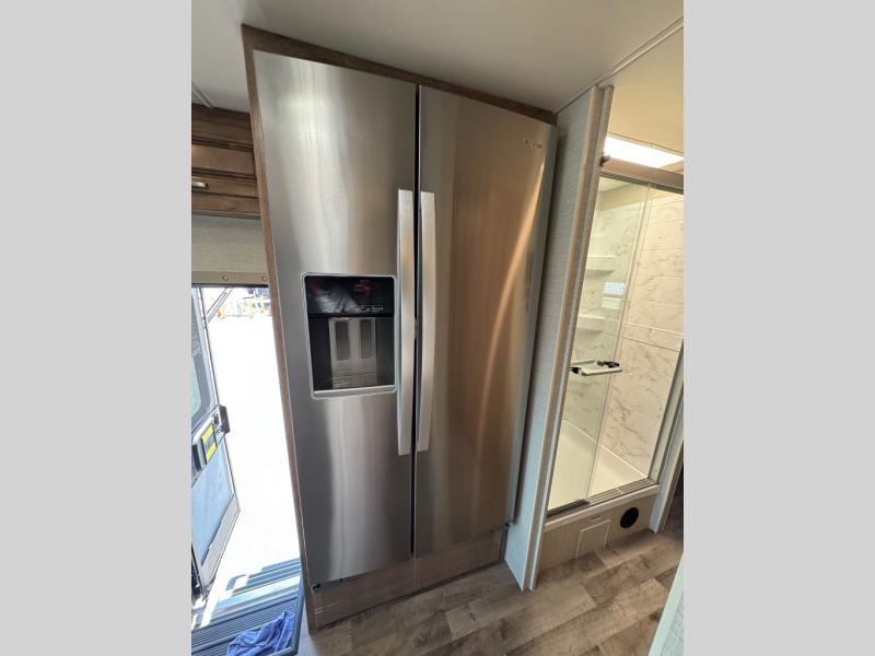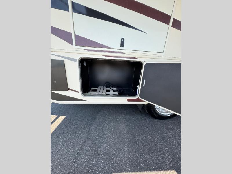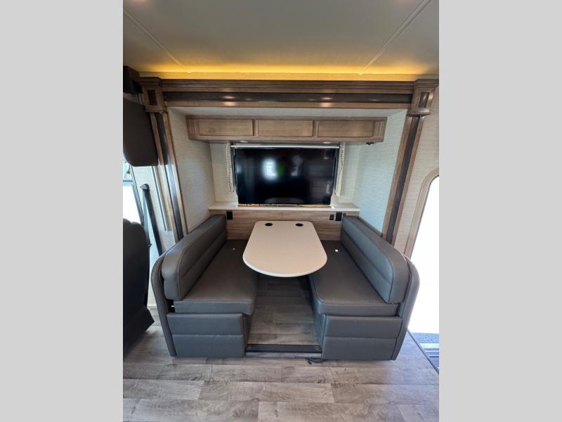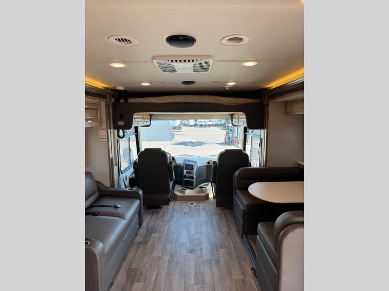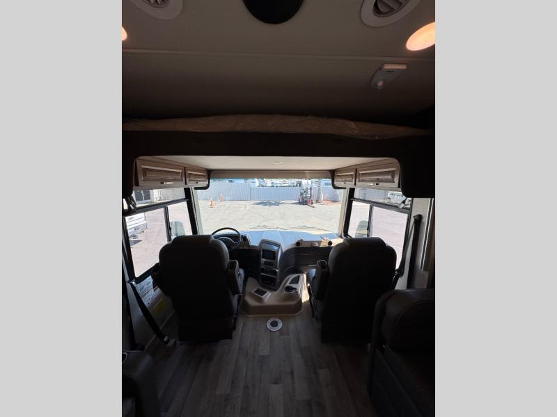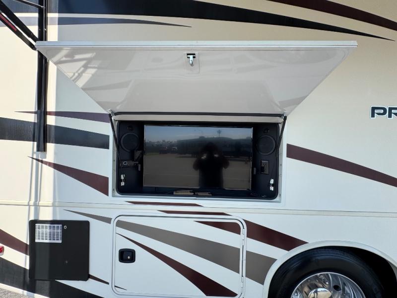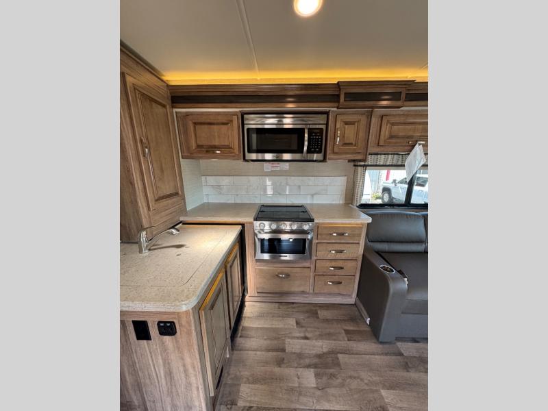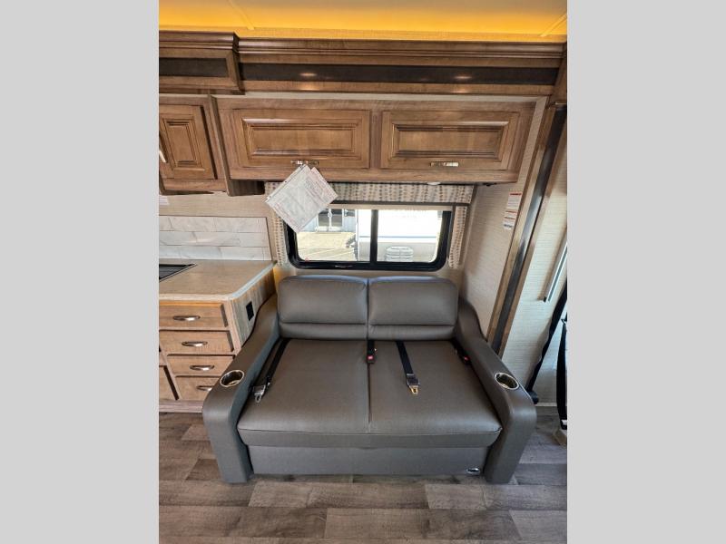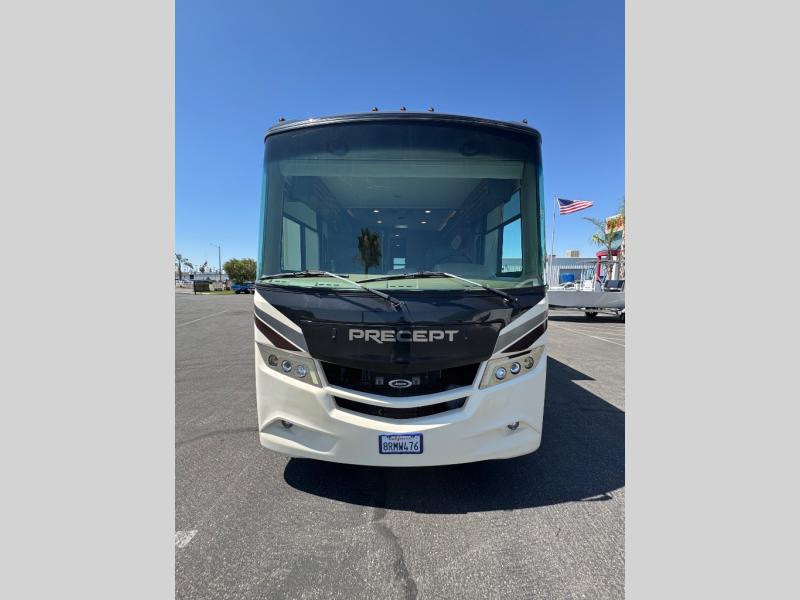 For the ultimate driving experience, the Precept Class A gas motorhome provides the JRide Plus Package, backup and sideview cameras with a monitor, six-way power driver and passenger seats that also swivel, and a 120" panoramic windshield so that you will have a great view of the open road. The lockable pass-through storage with slam latches allows you to bring all your comforts of home, and outside you'll also enjoy an electric patio awning with LED lights and an exterior entertainment center that provides an outdoor living space the whole campground will be jealous of. Step inside to find beautiful solid-surface kitchen countertops, high-intensity recessed LED lights, and hardwood cabinetry. These units also include a Furrion all-in-one cooktop and oven, full kitchen and bath amenities, plus plenty of storage for all your valuables.