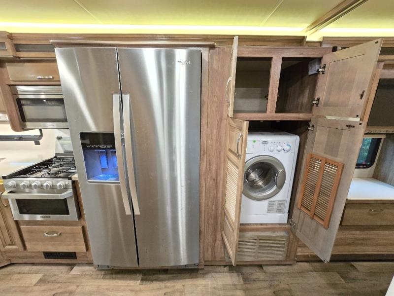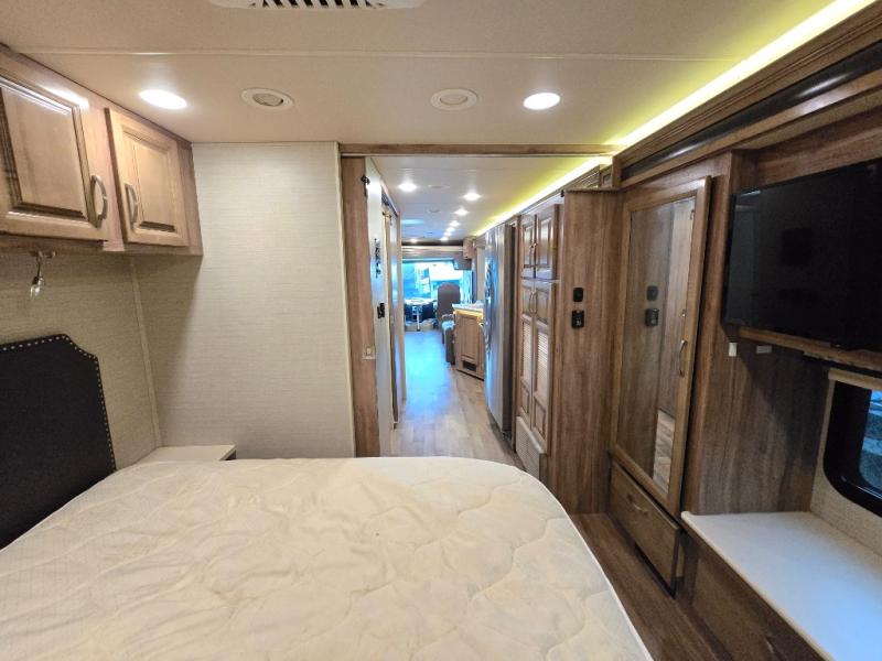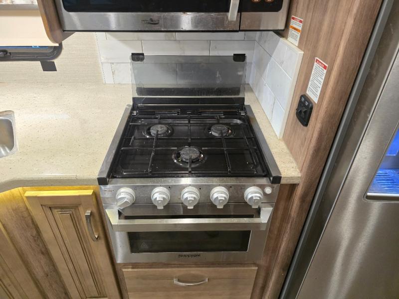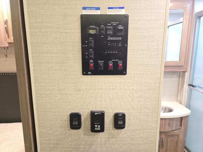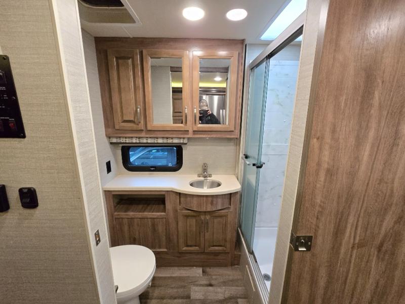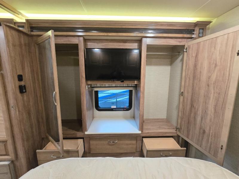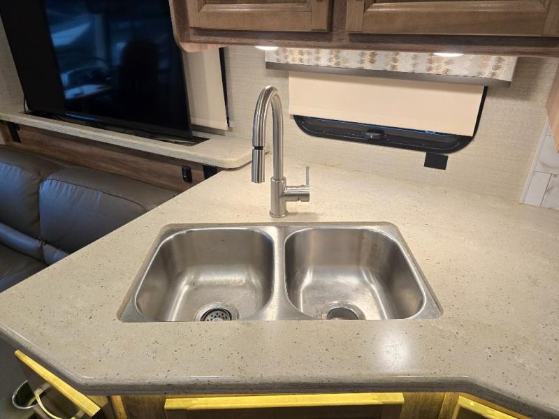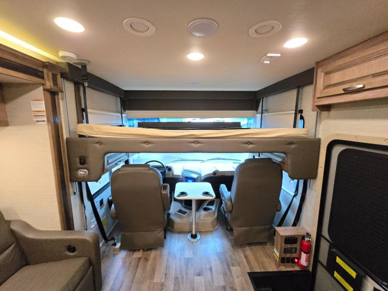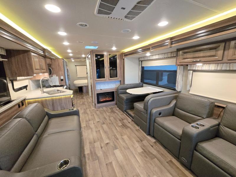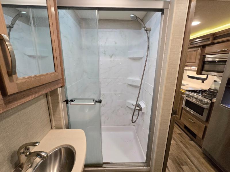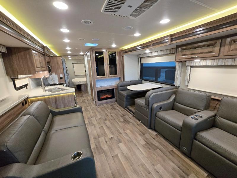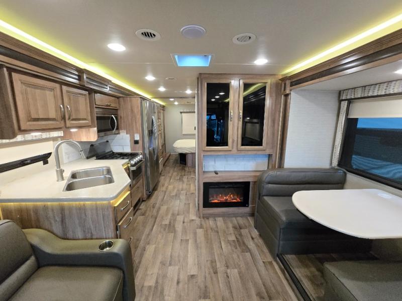 For the ultimate driving experience, the Precept Class A gas motorhome provides the JRide Plus Package, backup and sideview cameras with a monitor, six-way power driver and passenger seats that also swivel, and a 120" panoramic windshield so that you will have a great view of the open road. The lockable pass-through storage with slam latches allows you to bring all your comforts of home, and outside you'll also enjoy an electric patio awning with LED lights and an exterior entertainment center that provides an outdoor living space the whole campground will be jealous of. Step inside to find beautiful solid-surface kitchen countertops, high-intensity recessed LED lights, and hardwood cabinetry. These units also include a Furrion all-in-one cooktop and oven, full kitchen and bath amenities, plus plenty of storage for all your valuables.