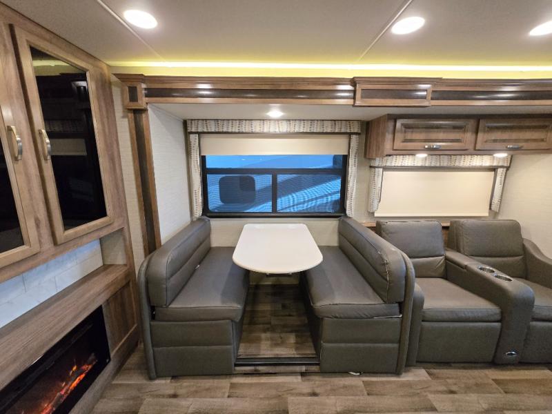 Come check out this Precept Class A gas motorhome that features a full-wall slide for an open and comfortable layout. You'll also find a second slide that contains the booth dinette and theater sofa to provide even more space. The kids can play a game on the floor in front of the fireplace or watch a show on the 50" TV with a lift while breakfast is being made. The 21 cu. ft. residential refrigerator allows you to stock up for your whole trip, and you'll find plenty of overhead compartments and two wardrobes in the bedroom for all your valuables. This unit also includes a rear private bedroom with an RV king bed that is perfect for you to escape to each night.