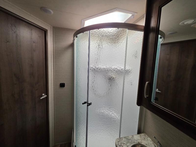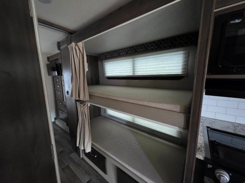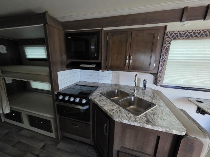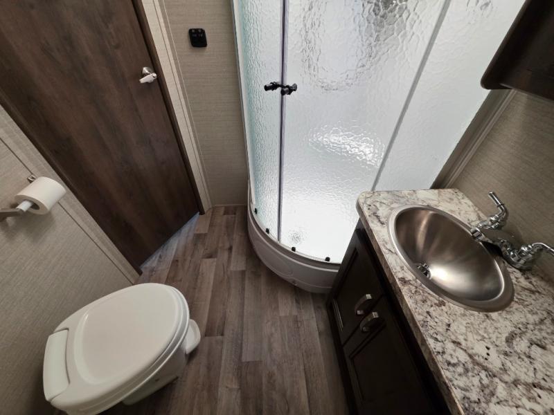 Your kiddos will be ready to draw straws for their own bunk bed or cab-over bunk for the week-long trip. You are sure to love having your own rear private bedroom with a queen-size bed each night, along with a wardrobe for you to hang your clothes. And there is a sliding door into the double entry bathroom as well as a 32" radius shower to give you added floor space and a place to freshen up. When you're ready to wind down for the night, head to the pantry, grab your favorite snack, and relax on the sofa or the dinette. You can also enjoy watching your favorite show on the 32" LED HDTV!