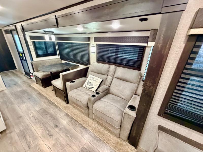 Stop missing out on exciting adventures and take your first trip away with the family in this White Hawk travel trailer! The three slides open up the interior so that you can live comfortably, and the arched ceiling gives a spacious feel to the entire unit. The theater seats, tri-fold sofa, and booth dinette give you the ability to host guests whenever they stop by, and the full bathroom with its skylight and 34" radius shower will keep you happy as you travel.