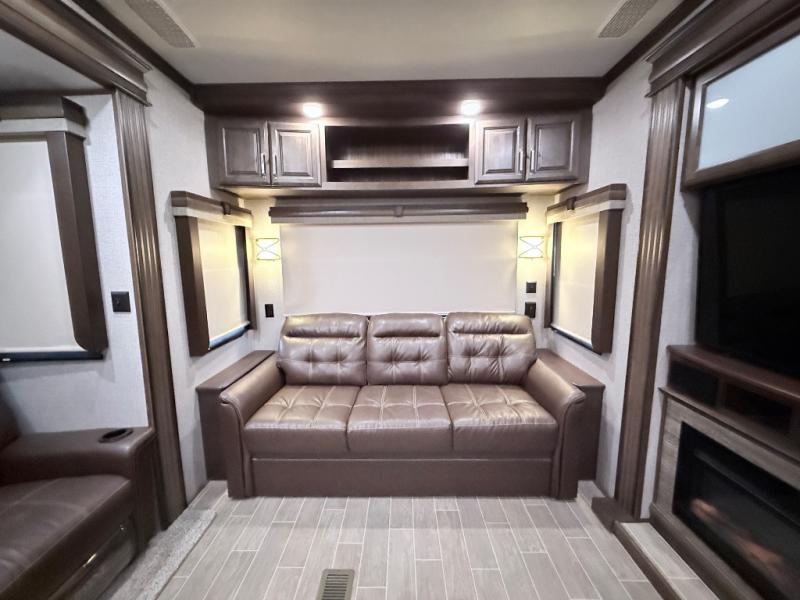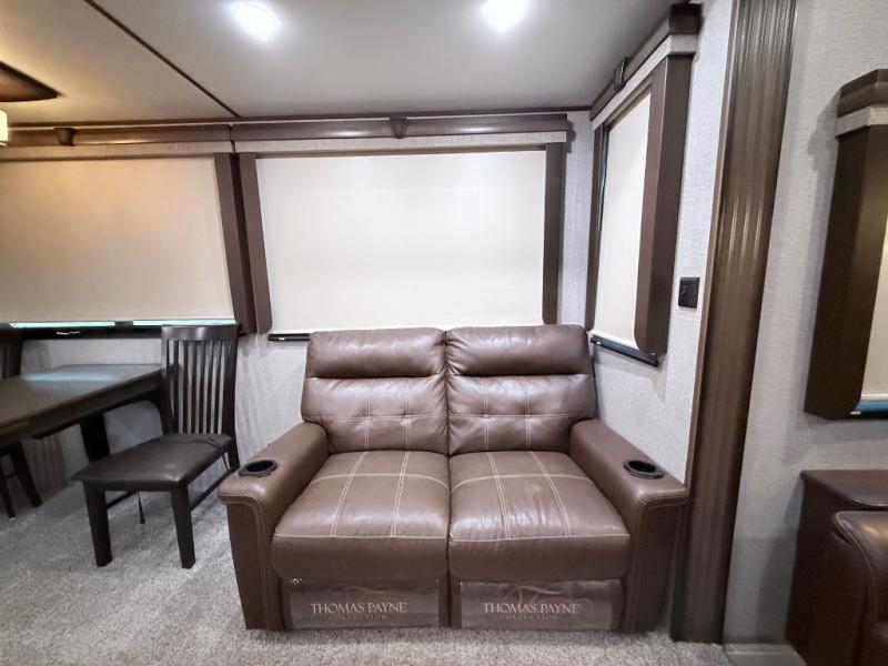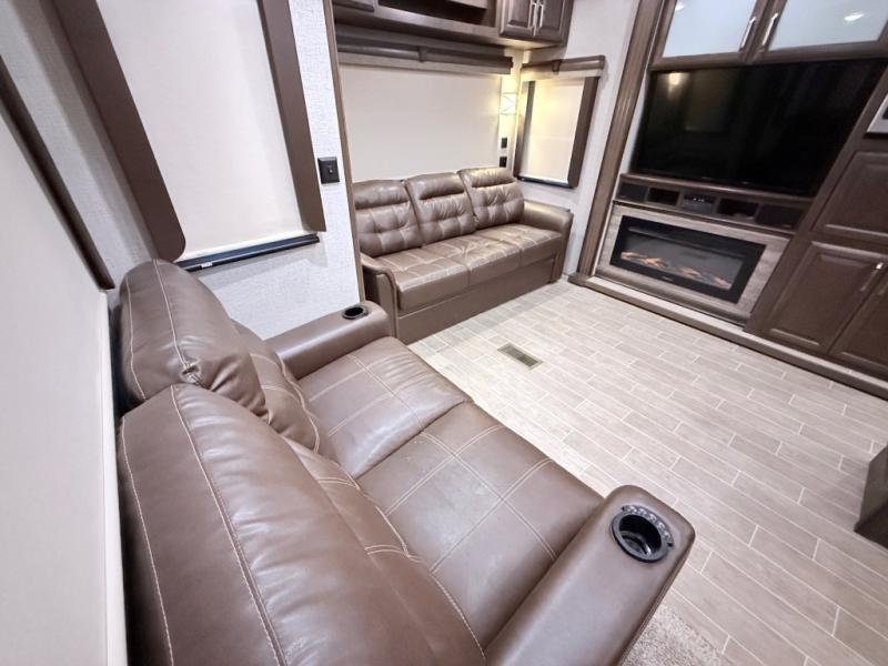 Are you ready for a cozy weekend away with this Alpine fifth wheel at your favorite destination? Throughout this model, you will enjoy all of the livable space that comes from three slides. When the night gets chilly, grab a blanket and a book and relax on the theater seating or sofa sleeper in front of the warm fireplace or watch your favorite movie on the 50" LED TV. As you wait for dinner to be prepared on the three burner range, you can grab a snack from the 18 cubic foot residential refrigerator and sit at the free-standing table with chairs as you chat with the chef. With its own bathroom entrance, a vanity, and a king bed, the master suite proves to be the most relaxing and comfortable place to spend each night.
