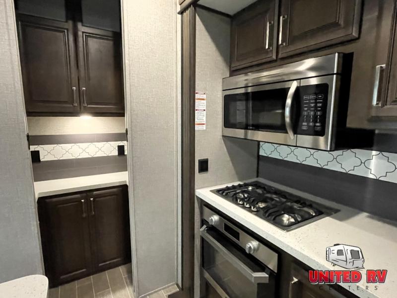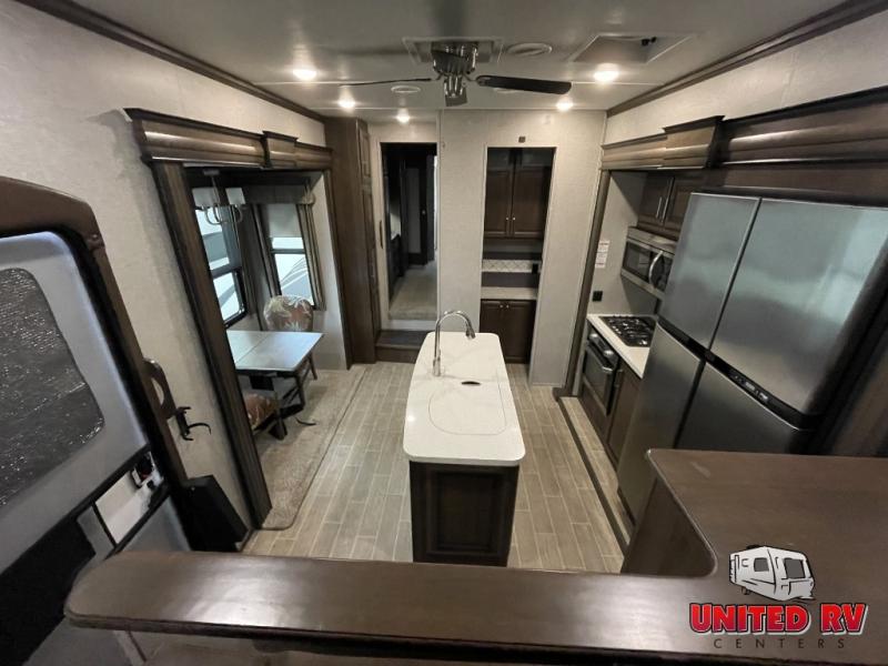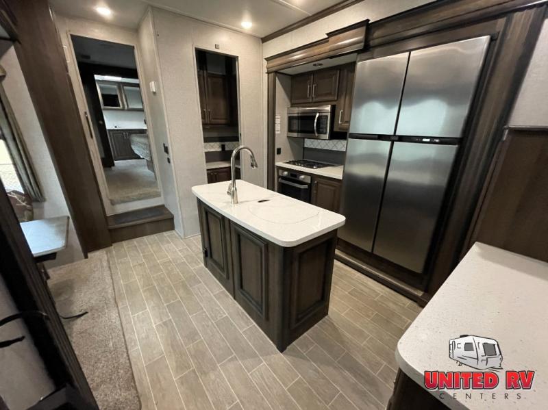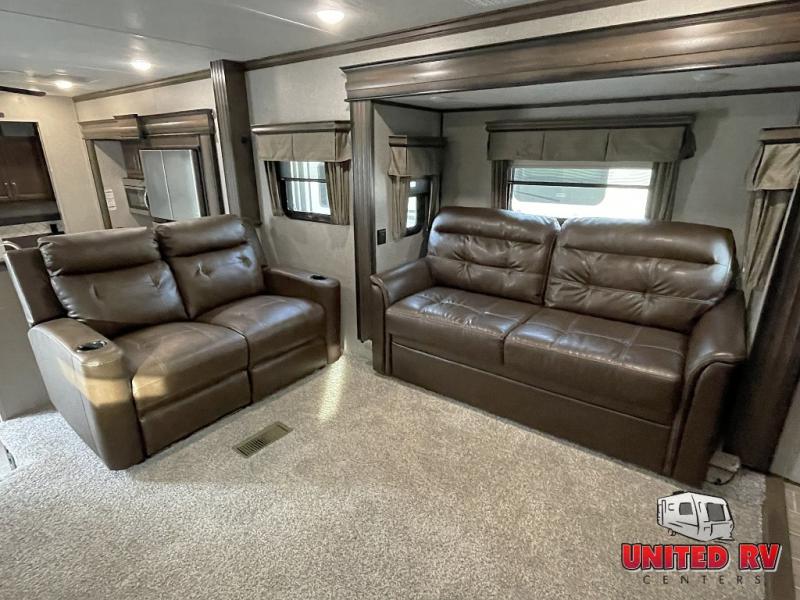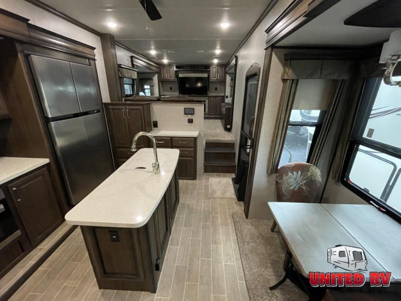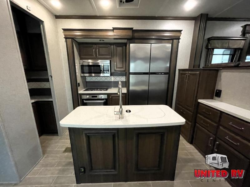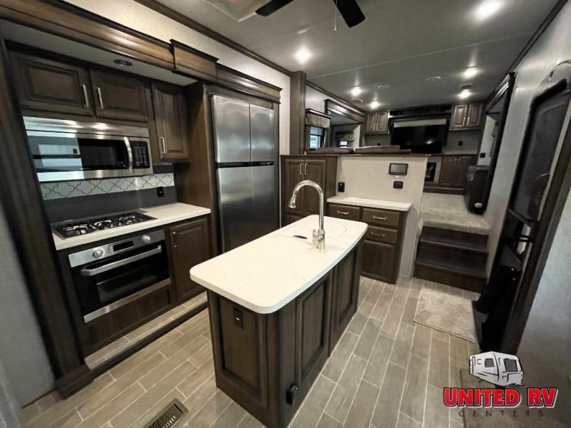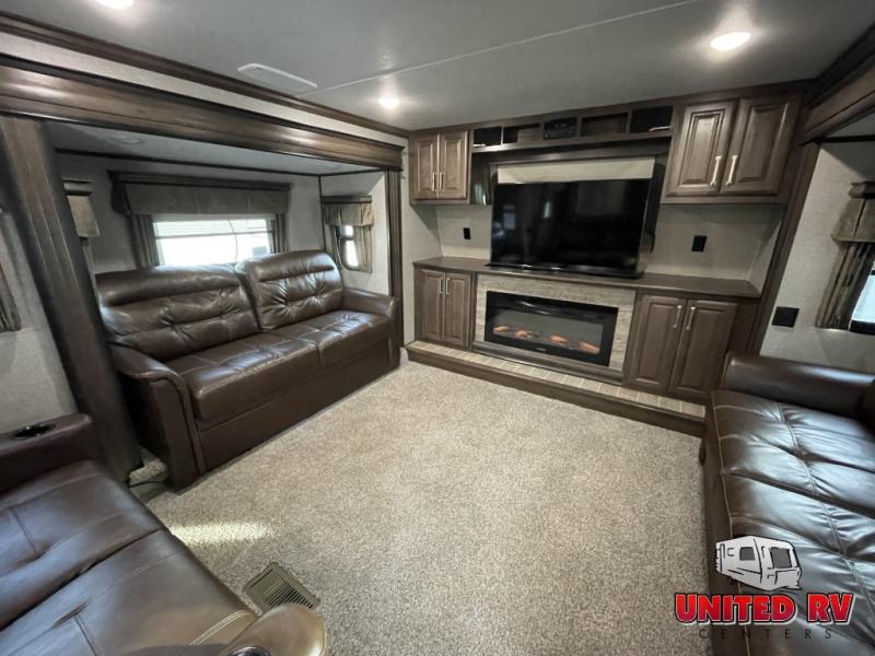 Step inside this spacious fifth wheel for a camping trip you won't forget. This unit includes steps leading to a separate living area with an entertainment center and fireplace, two tri-fold sofas, and theater seating for a truly at-home experience. The chef will love the kitchen island to easily prepare meals or set out snacks for the kids. This model includes five slides, ensuring space for all your guests to move about. Step up into the bedroom with a king bed, a TV, and a full bath with a skylight over the shower. With a 18 cu. ft. gas/electric refrigerator, a pantry, plus a walk-in pantry, you can fully stock the kitchen for your family adventure. Enjoy all the amenities this unit has to offer, including a free standing dinette, two 14" awnings, and a space that has been prepped for you to add a stackable washer and dryer for your convenience, plus much more! Come check out this fifth wheel today!