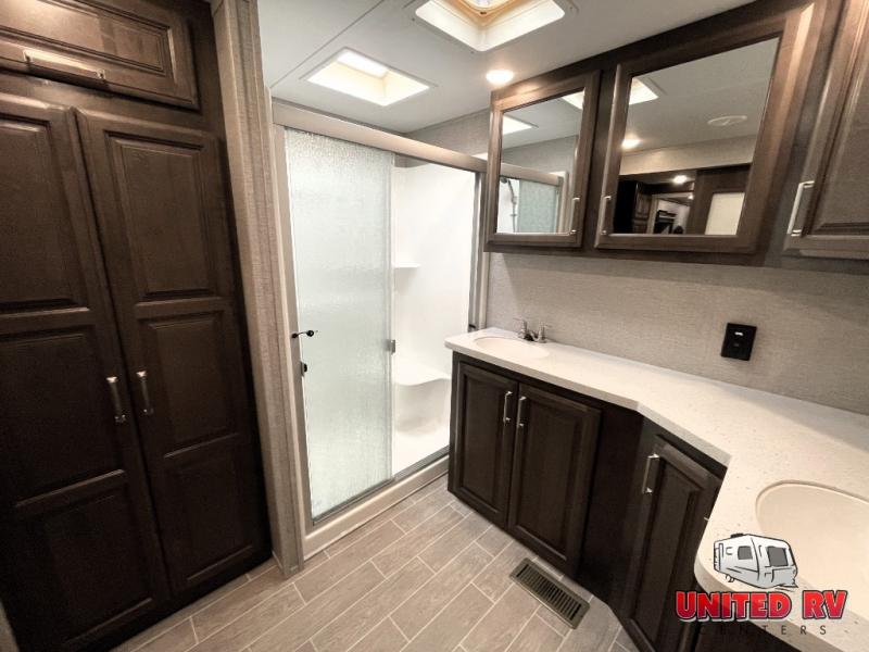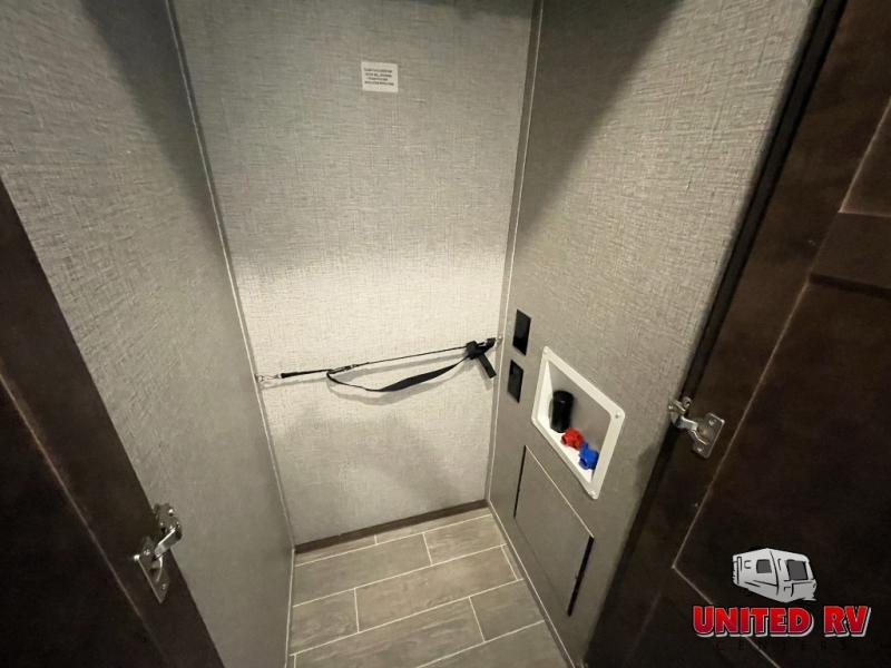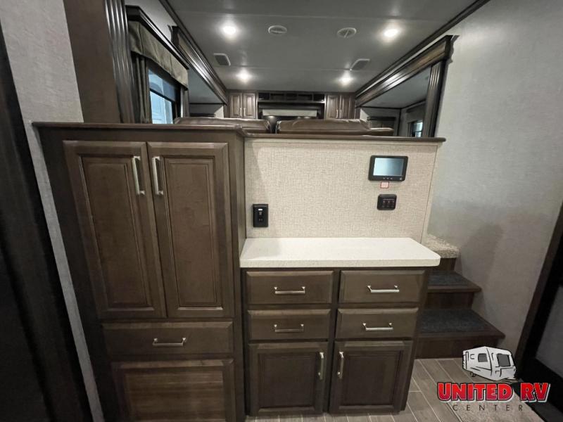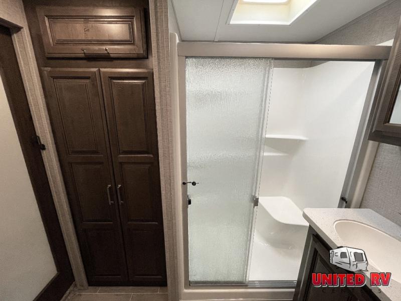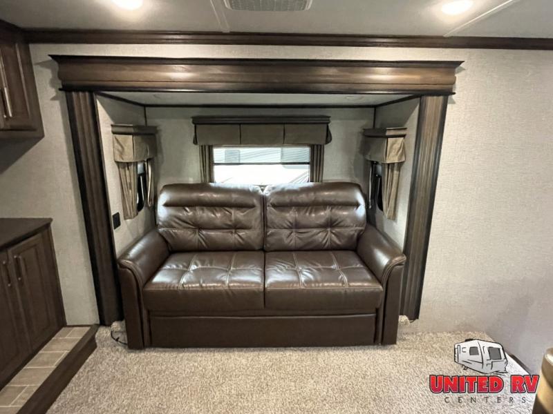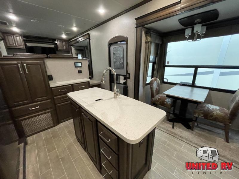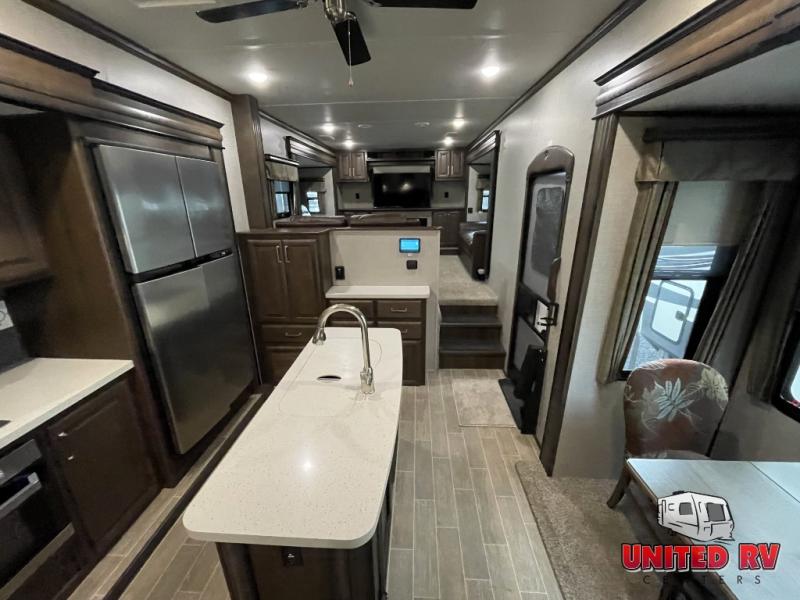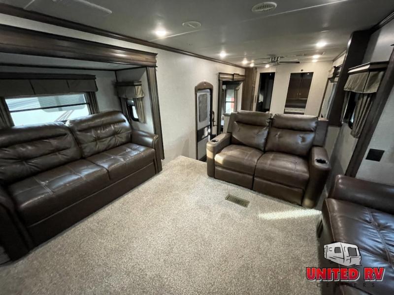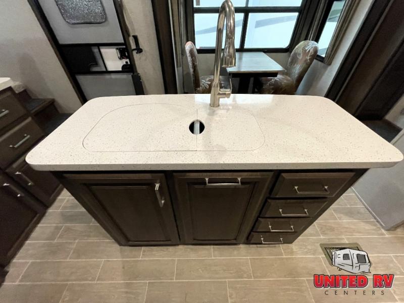 Step inside this spacious fifth wheel for a camping trip you won't forget. This unit includes steps leading to a separate living area with an entertainment center and fireplace, two tri-fold sofas, and theater seating for a truly at-home experience. The chef will love the kitchen island to easily prepare meals or set out snacks for the kids. This model includes five slides, ensuring space for all your guests to move about. Step up into the bedroom with a king bed, a TV, and a full bath with a skylight over the shower. With a 18 cu. ft. gas/electric refrigerator, a pantry, plus a walk-in pantry, you can fully stock the kitchen for your family adventure. Enjoy all the amenities this unit has to offer, including a free standing dinette, two 14" awnings, and a space that has been prepped for you to add a stackable washer and dryer for your convenience, plus much more! Come check out this fifth wheel today!