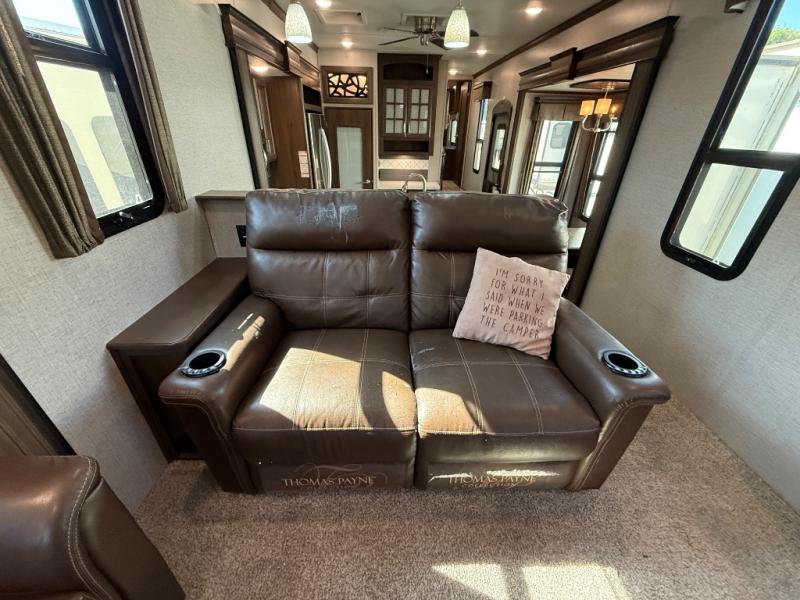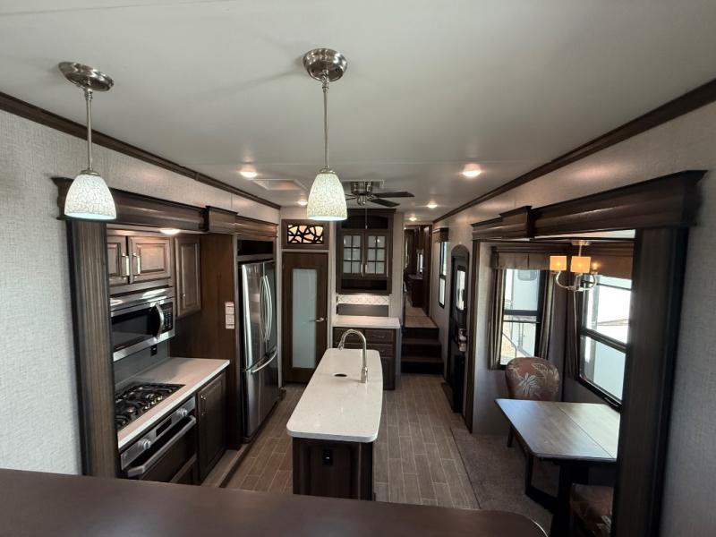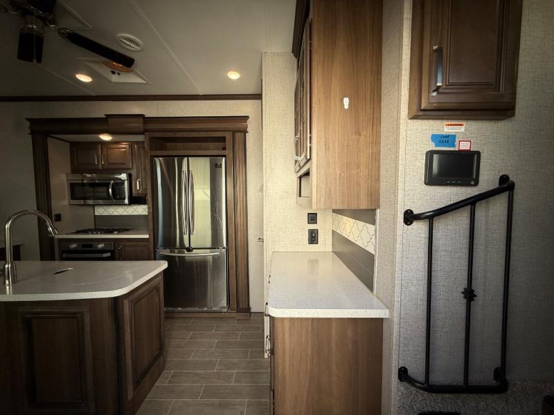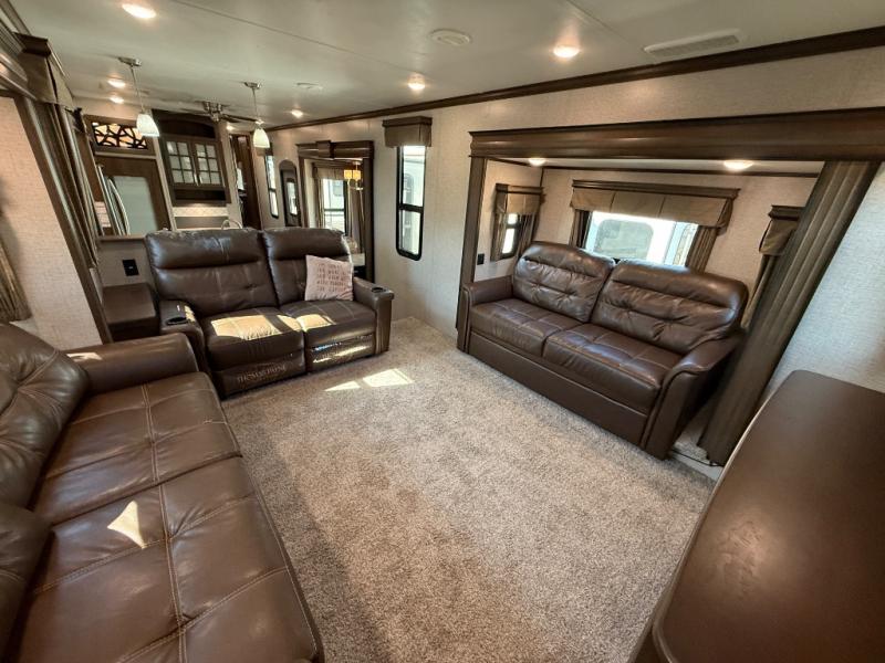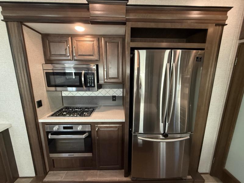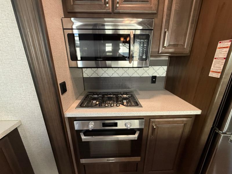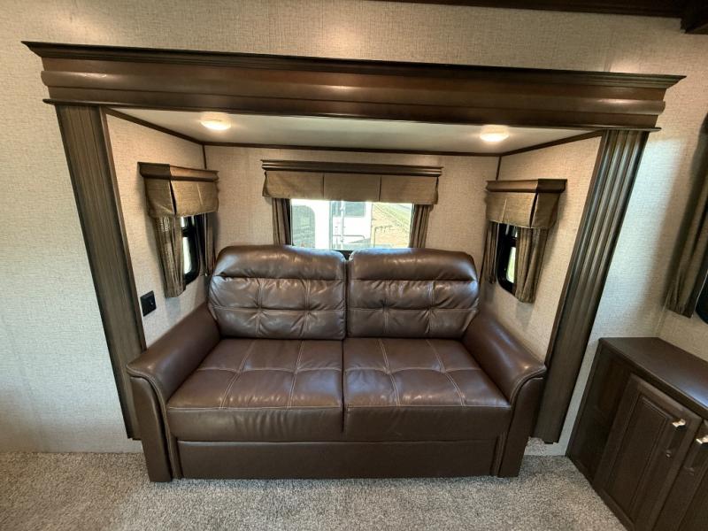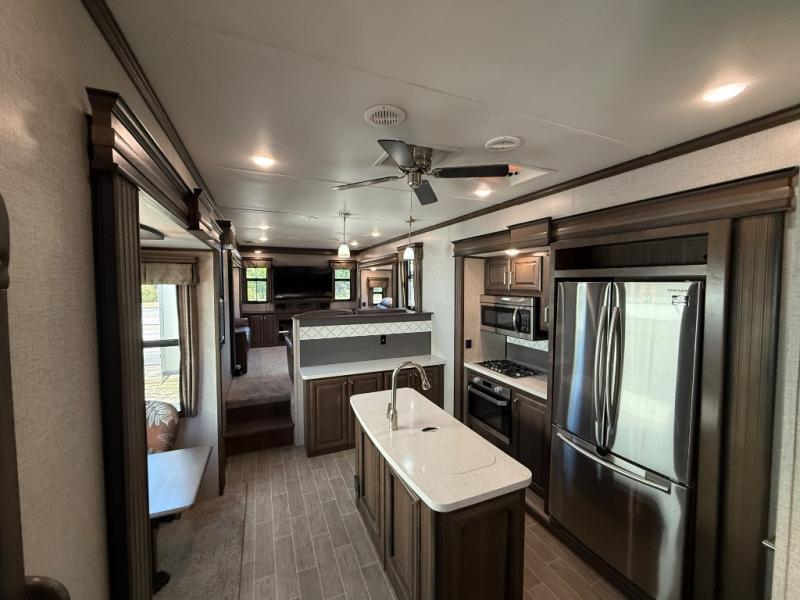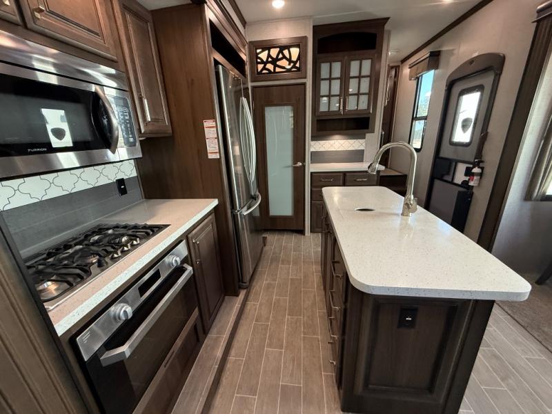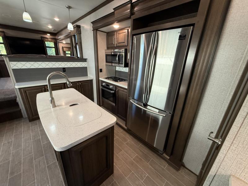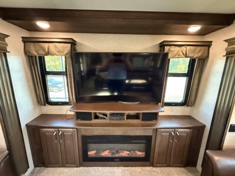 This fifth wheel is perfect for the family of six to eight seeking fun and relaxation. You'll be pleased with all the features this unit has to offer, including two tri-fold sofas the kids will love, a front bedroom with a king bed and a master closet, and theater seating to make you feel right at home. Enjoy an evening by the fireplace or play a game at the free standing dinette. This model has five slides, giving ample space to move about. You will appreciate the kitchen with a 18 cu.ft. residential refrigerator with an icemaker, a convection microwave, and a kitchen island. This fifth wheel has a unique under the deck storage that is beneath the rear entertainment/living area, and a 17' awning for those evenings you grill out and have s'mores by the campfire. Why wait? Adventure is calling your name!