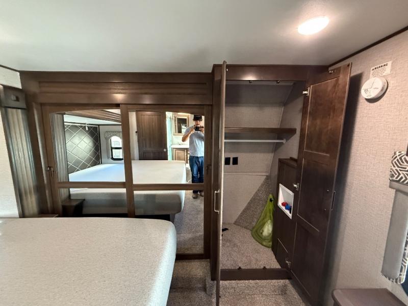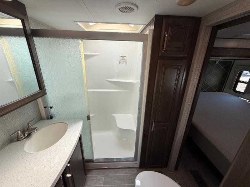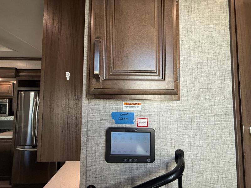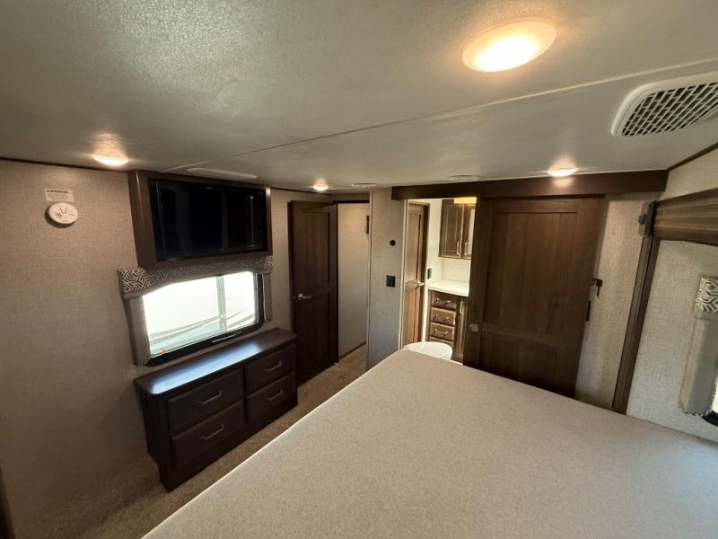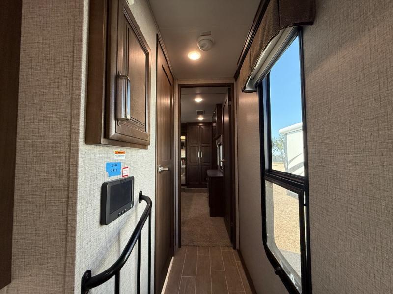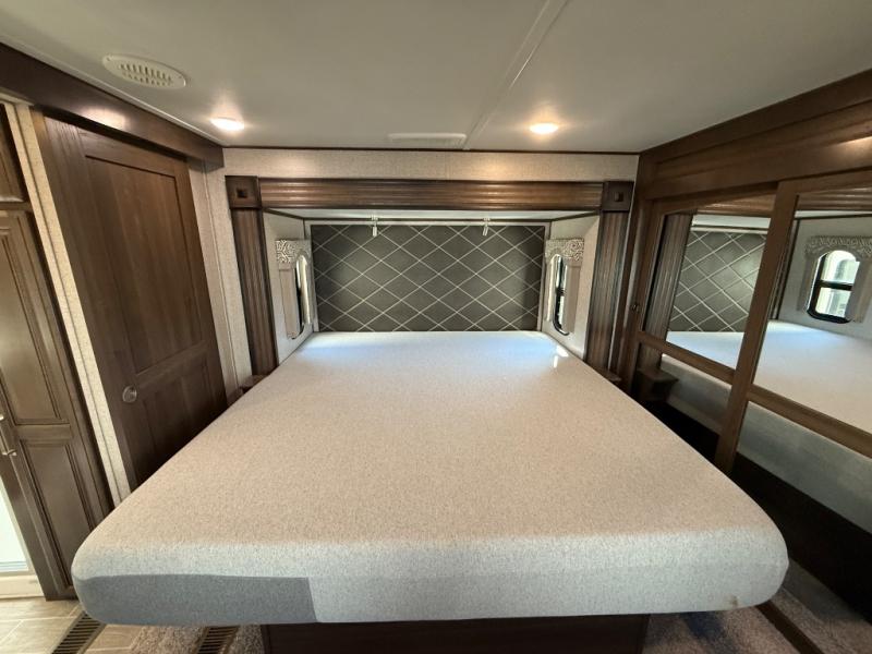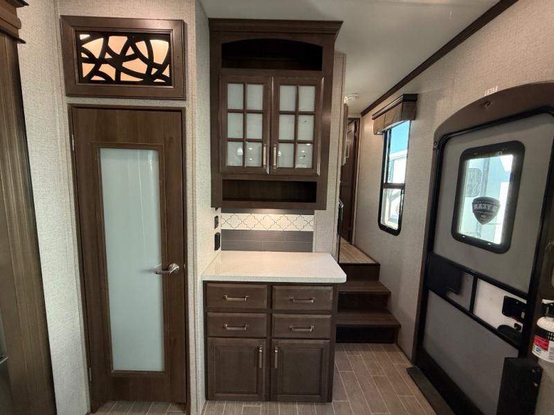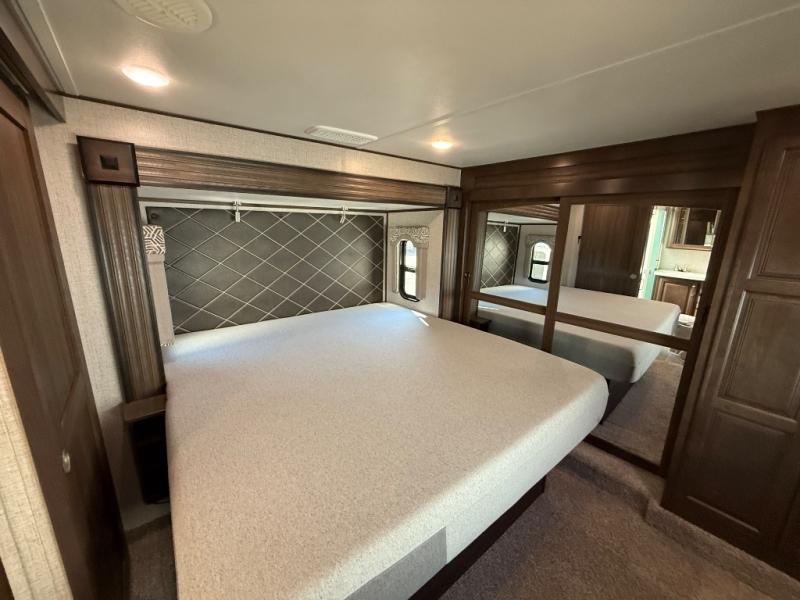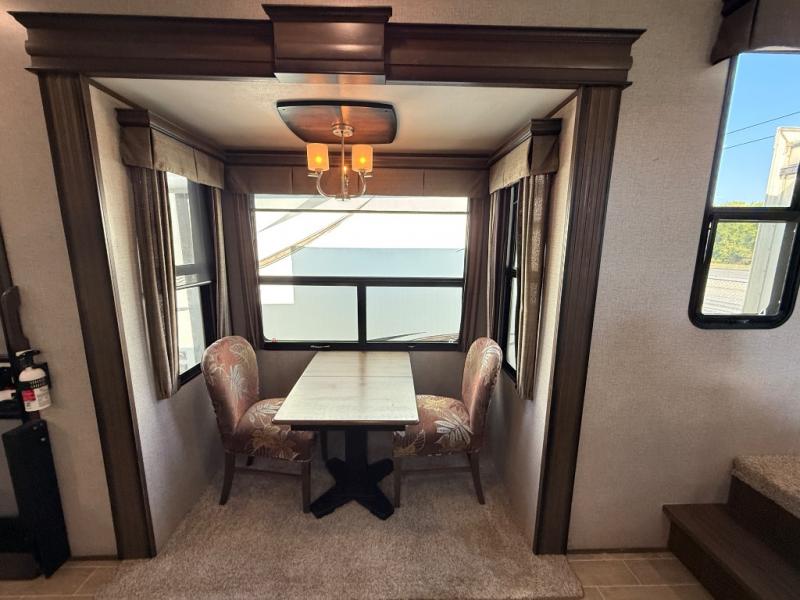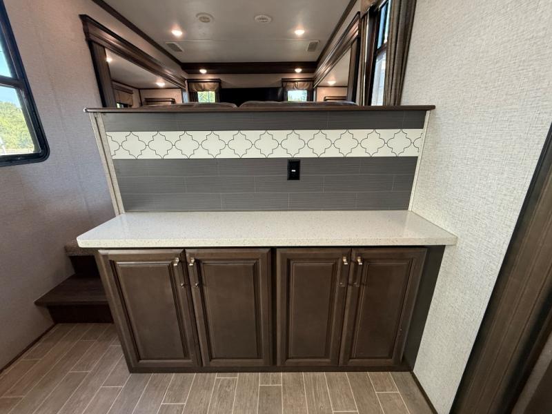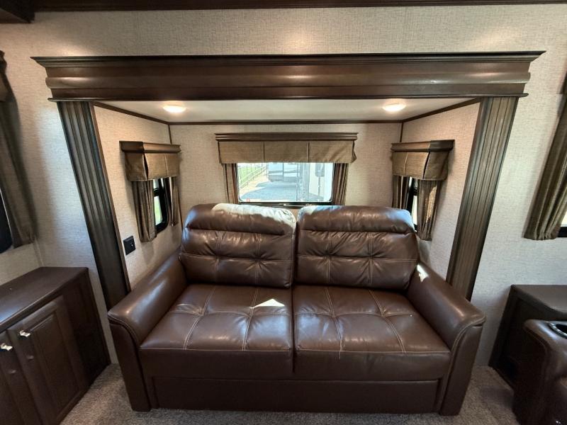 This fifth wheel is perfect for the family of six to eight seeking fun and relaxation. You'll be pleased with all the features this unit has to offer, including two tri-fold sofas the kids will love, a front bedroom with a king bed and a master closet, and theater seating to make you feel right at home. Enjoy an evening by the fireplace or play a game at the free standing dinette. This model has five slides, giving ample space to move about. You will appreciate the kitchen with a 18 cu.ft. residential refrigerator with an icemaker, a convection microwave, and a kitchen island. This fifth wheel has a unique under the deck storage that is beneath the rear entertainment/living area, and a 17' awning for those evenings you grill out and have s'mores by the campfire. Why wait? Adventure is calling your name!