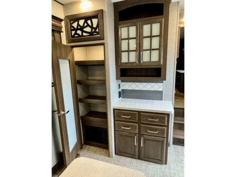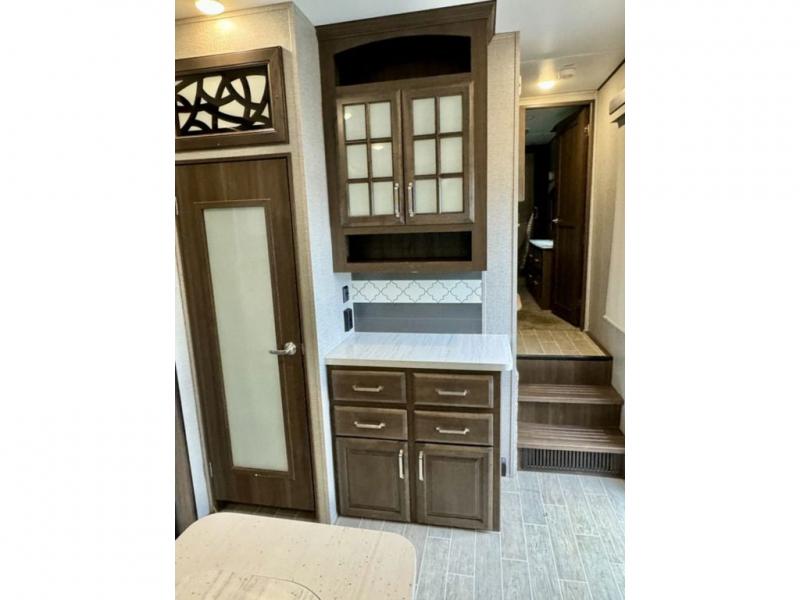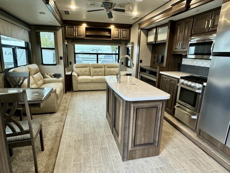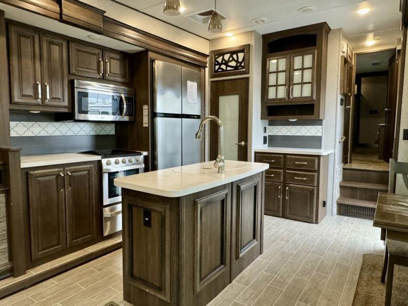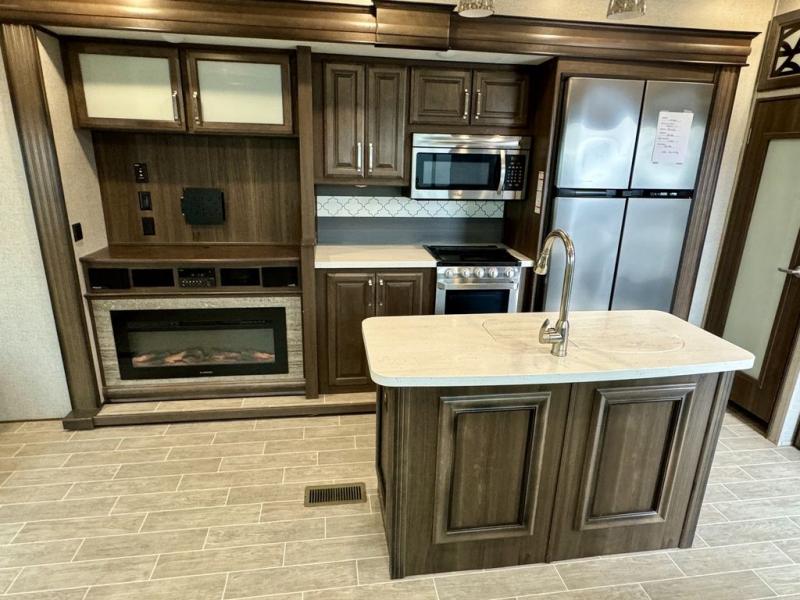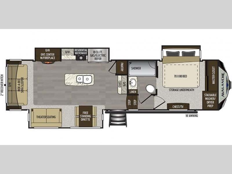 The perfect RV for entertaining and relaxing is this Keystone Avalanche fifth wheel. The combined living and kitchen area includes dual opposing slides for more floor space as you work around the kitchen island and more seating accommodations as you gather together each night on the sofa sleeper, the theater seating featuring heat and massage, or the free-standing table with chairs. This unit also offers a fully loaded kitchen with an 18 cubic foot refrigerator, a three-burner range top, a large pantry, and a curio cabinet.