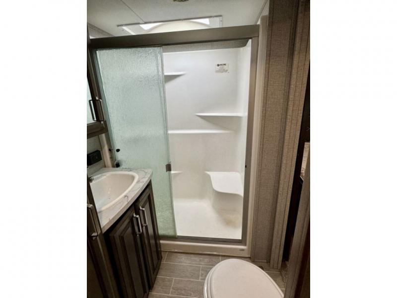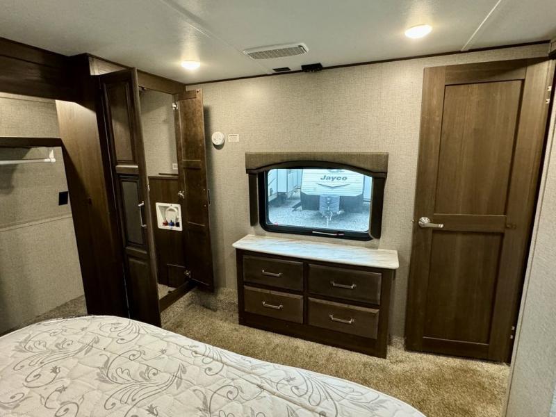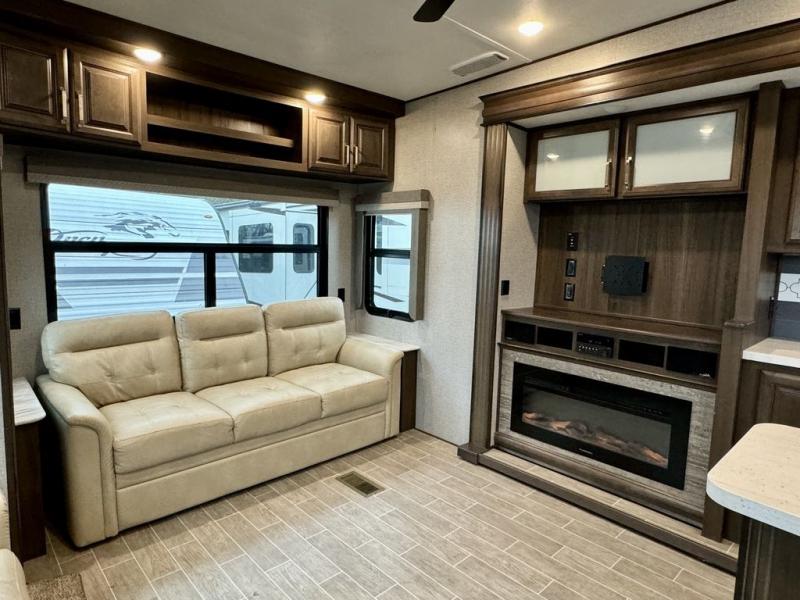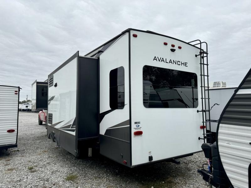 With any Keystone Avalanche fifth wheel, you will enjoy getting to your favorite destination with the exceptional turning radius from the MAX TURN high-gloss fiberglass front cap, as well as the Road Armor suspension. Once you have arrived at your destination, the One Place Command Center with its centrally located operational switches and gauges will allow you to set up your RV quickly, and the one-touch electric awning with adjustable arms will provide protection from the sun and weather while you load your clothing, dishes, and gear into all of the interior storage compartments.