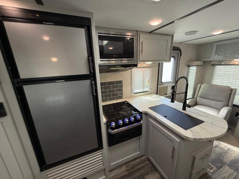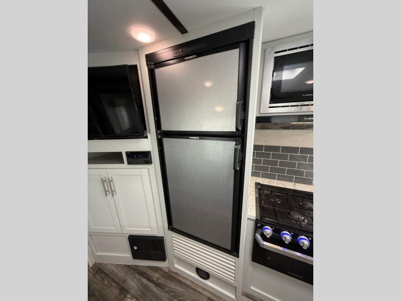 Whether you're spending your time soaking up the sun at the edge of the lake or trekking into the forest on a hunt for fresh berries, the Keystone Bullet travel trailer will not only get you to your destination, but it will also keep you happy while you're there. With the most luxury features of any other ultra lite trailer, like the exterior speakers, laundry chute, and LED lighting, the Bullet continues to provide the number one ultra lite travel trailer in America. Because of the contoured shape of the radius front profile on the Bullet, it offers less wind resistance as you tow it along the highway, and when you combine that with the extremely lightweight floor plan design, you get one unit that will help you cut costs when spending money on fuel.